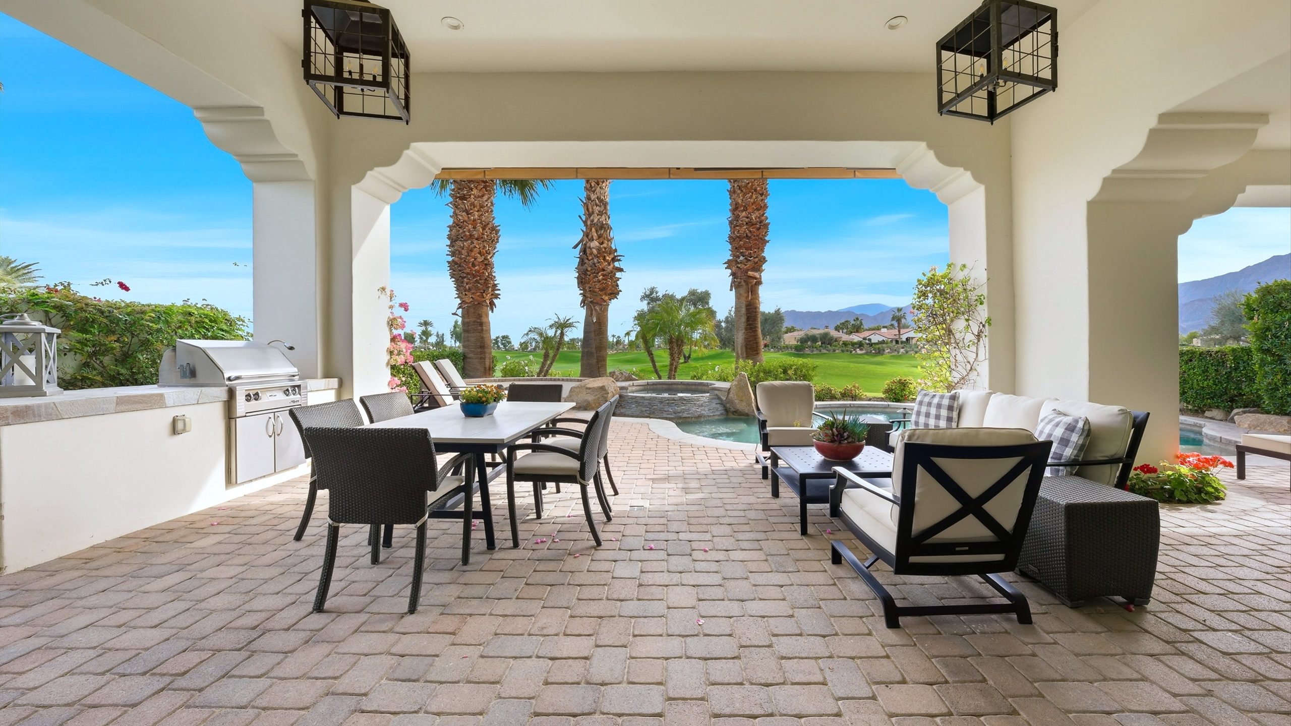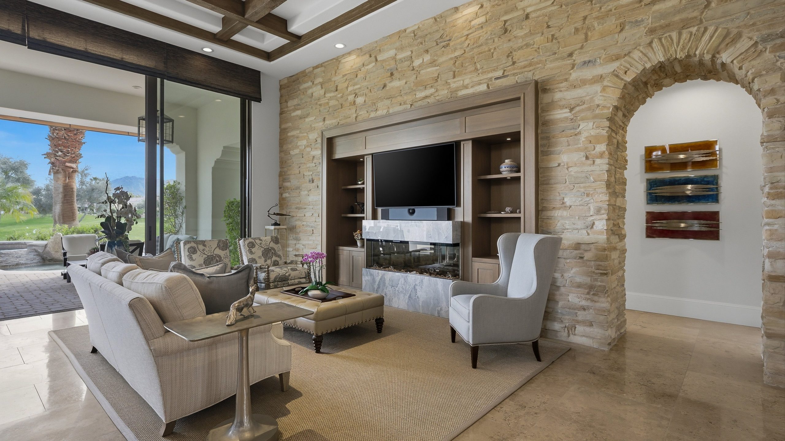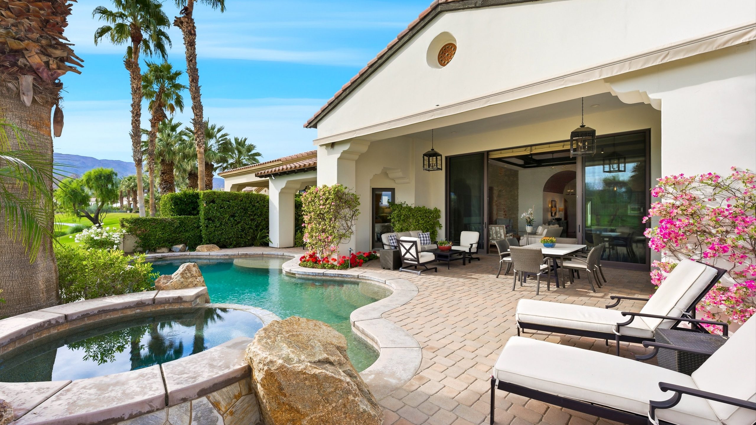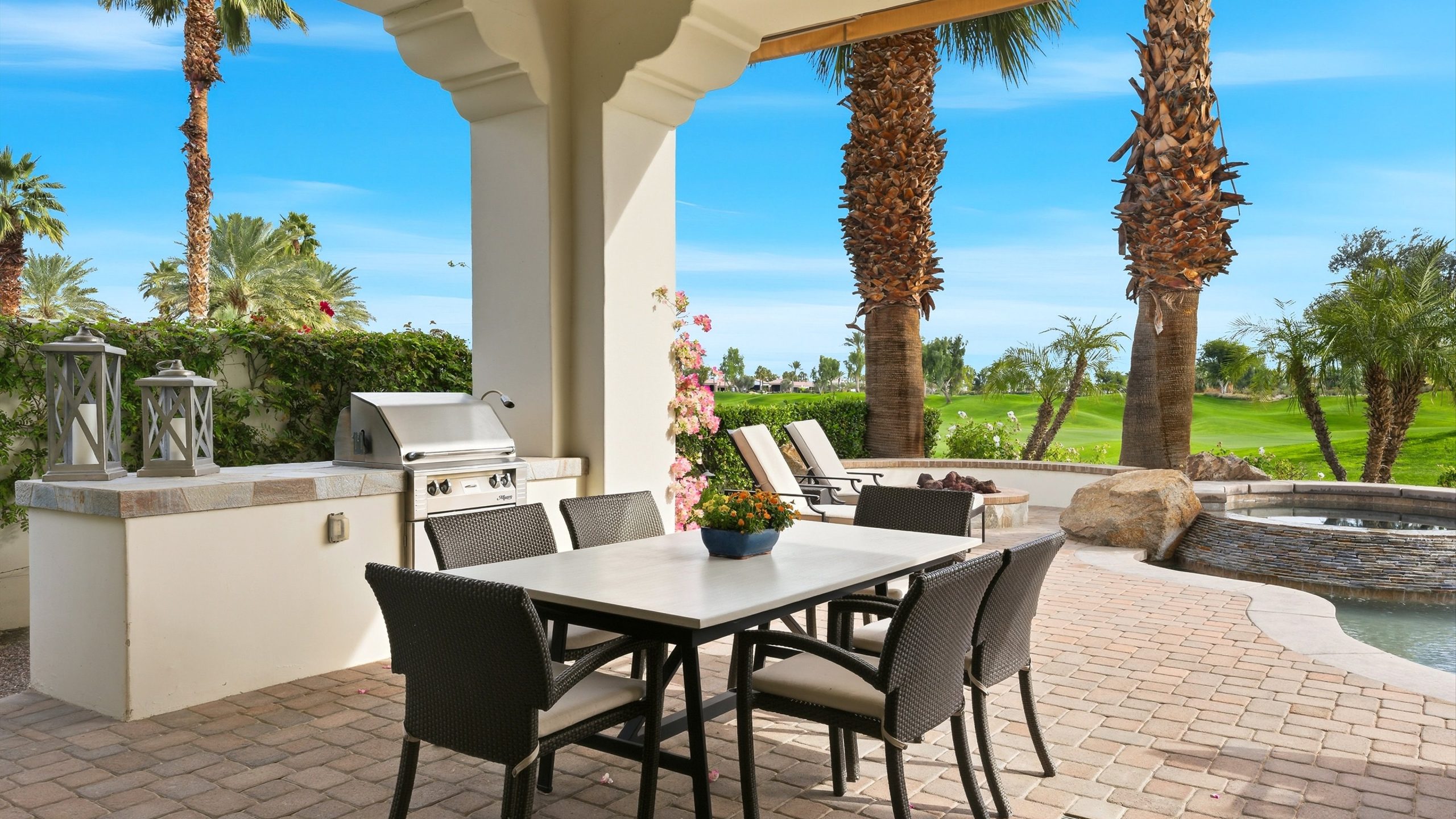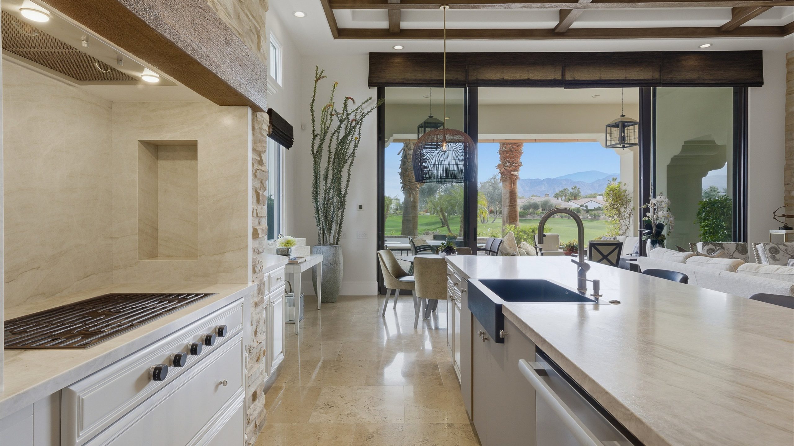 Understated elegance and thoughtful craftsmanship define this extensively refreshed residence, where design and function merge intentionally and effortlessly. Recent renovations transformed the main living spaces by introducing architectural ceiling beams and a refined material palette that adds warmth and depth without overwhelming the home’s clean lines. The kitchen makes a quiet yet powerful statement, featuring leathered Taj Mahal quartzite countertops that bring organic texture and subtle movement to the space. A built-in EuroCave wine refrigerator with capacity for 150 bottles offers a dedicated showcase for collectors and entertainers alike, while premium appliances support daily ease. The adjacent butler’s pantry is elevated with designer wallpaper, creating a tailored, jewel-box moment between the kitchen and dining area. In the great room, a custom European oak built-in anchors the space, paired with a polished Tundra Grey marble fireplace surround that adds a modern edge. High-end designer furnishings complement the architectural upgrades and reinforce the home’s cohesive aesthetic. The powder bath features quarter-sawn mahogany cabinetry topped with honed Caesarstone, blending rich wood grain with sleek stone surfaces. Throughout the home, professionally polished travertine floors enhance their natural character and lend a fresh, refined feel. A dedicated office provides a private and flexible workspace, ideal for remote work or creative pursuits. Beyond the main residence, a detached two-bedroom casita offers a private retreat for guests. Ideally positioned on a premier end lot adjacent to a greenbelt, the property enjoys sweeping south-facing views across the third fairway of the Rees Jones designed golf course at Andalusia Country Club. The panoramic backdrop of the Santa Rosa and Coral Mountains creates a dramatic and ever-changing setting, capturing the beauty of desert light from sunrise to sunset. Come live the life you’ve always imagined!