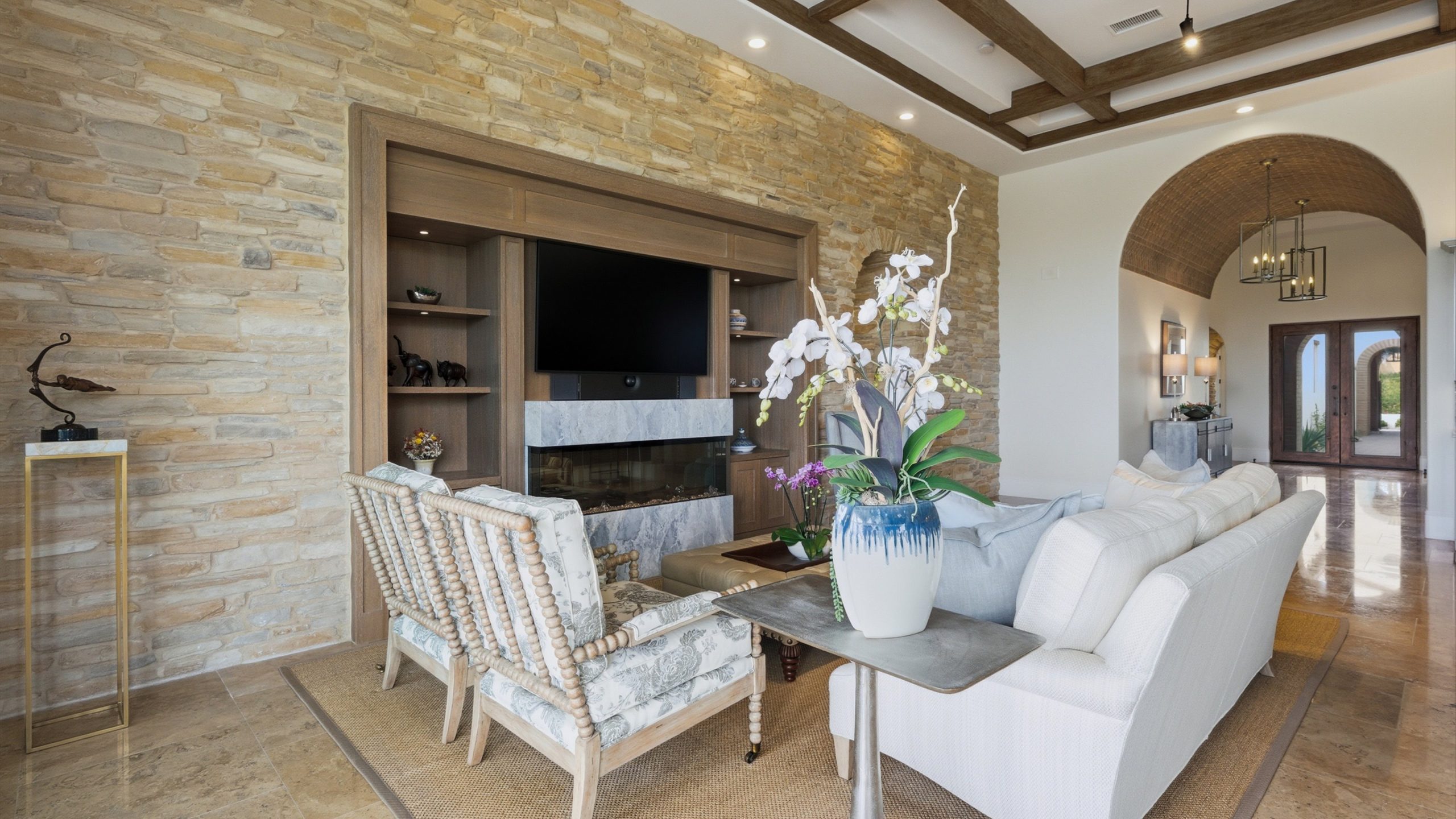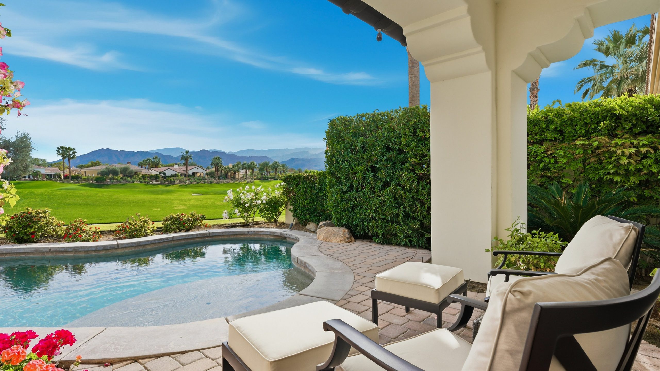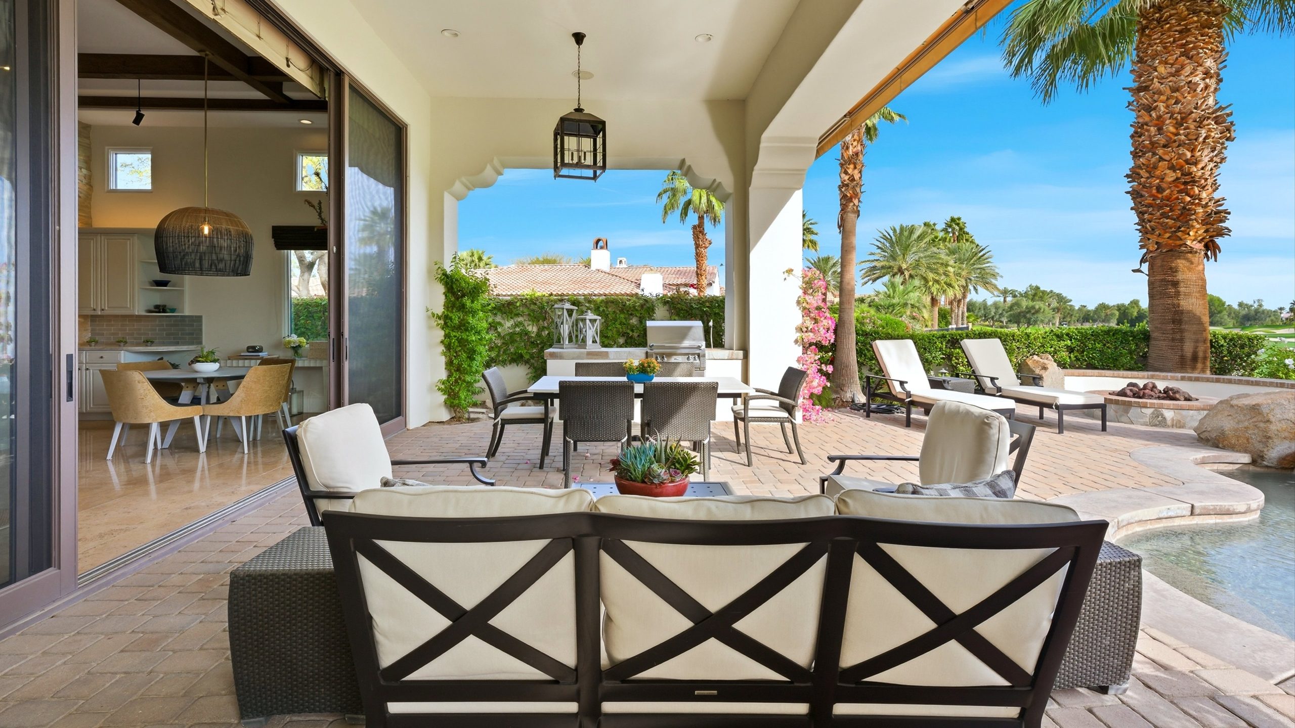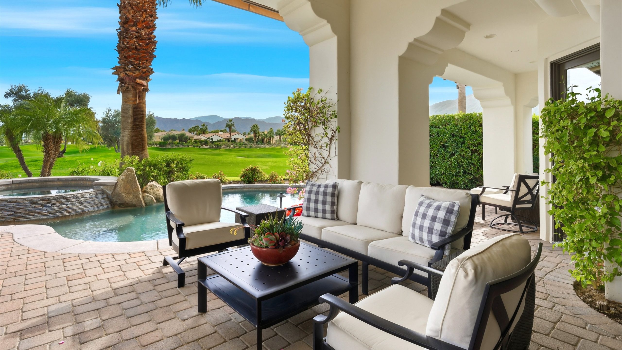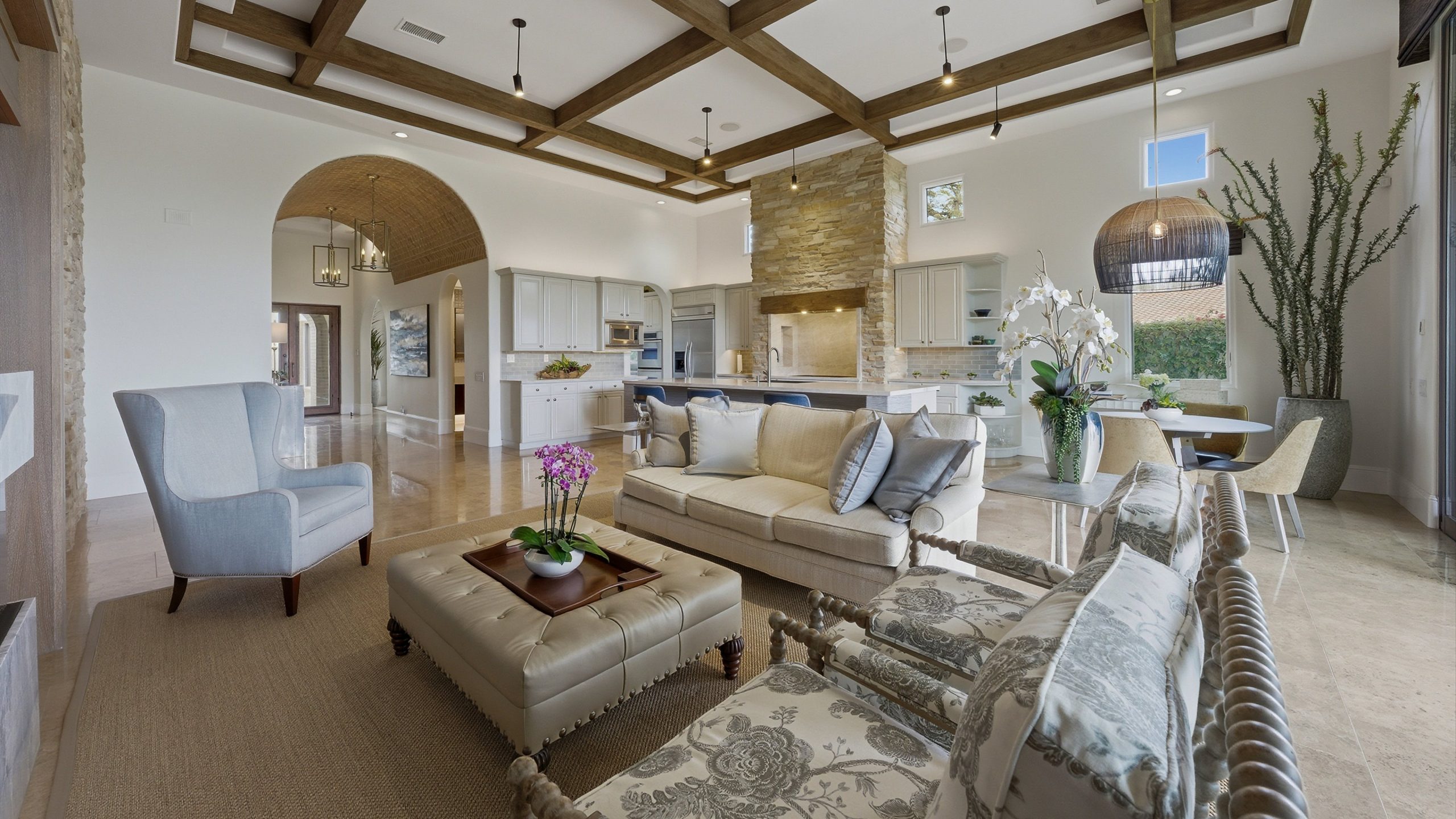 Understated elegance and thoughtful craftsmanship define this extensively refreshed residence, where design and function merge intentionally and effortlessly. Recent renovations transformed the main living spaces by introducing architectural ceiling beams and a refined material palette that adds warmth and depth without overwhelming the home’s clean lines. The kitchen makes a quiet yet powerful statement, featuring leathered Taj Mahal quartzite countertops that bring organic texture and subtle movement to the space. A built-in EuroCave wine refrigerator with capacity for 150 bottles offers a dedicated showcase for collectors and entertainers alike, while premium appliances support daily ease. The adjacent butler’s pantry is elevated with designer wallpaper, creating a tailored, jewel-box moment between the kitchen and dining area. In the great room, a custom European oak built-in anchors the space, paired with a polished Tundra Grey marble fireplace surround that adds a modern edge. High-end designer furnishings complement the architectural upgrades and reinforce the home’s cohesive aesthetic. The powder bath features quarter-sawn mahogany cabinetry topped with honed Caesarstone, blending rich wood grain with sleek stone surfaces. Throughout the home, professionally polished travertine floors enhance their natural character and lend a fresh, refined feel. A dedicated office provides a private and flexible workspace, ideal for remote work or creative pursuits. Beyond the main residence, a detached two-bedroom casita offers a private retreat for guests. Ideally positioned on a premier end lot adjacent to a greenbelt, the property enjoys sweeping south-facing views across the third fairway of the Rees Jones designed golf course at Andalusia Country Club. The panoramic backdrop of the Santa Rosa and Coral Mountains creates a dramatic and ever-changing setting, capturing the beauty of desert light from sunrise to sunset. Come live the life you’ve always imagined!