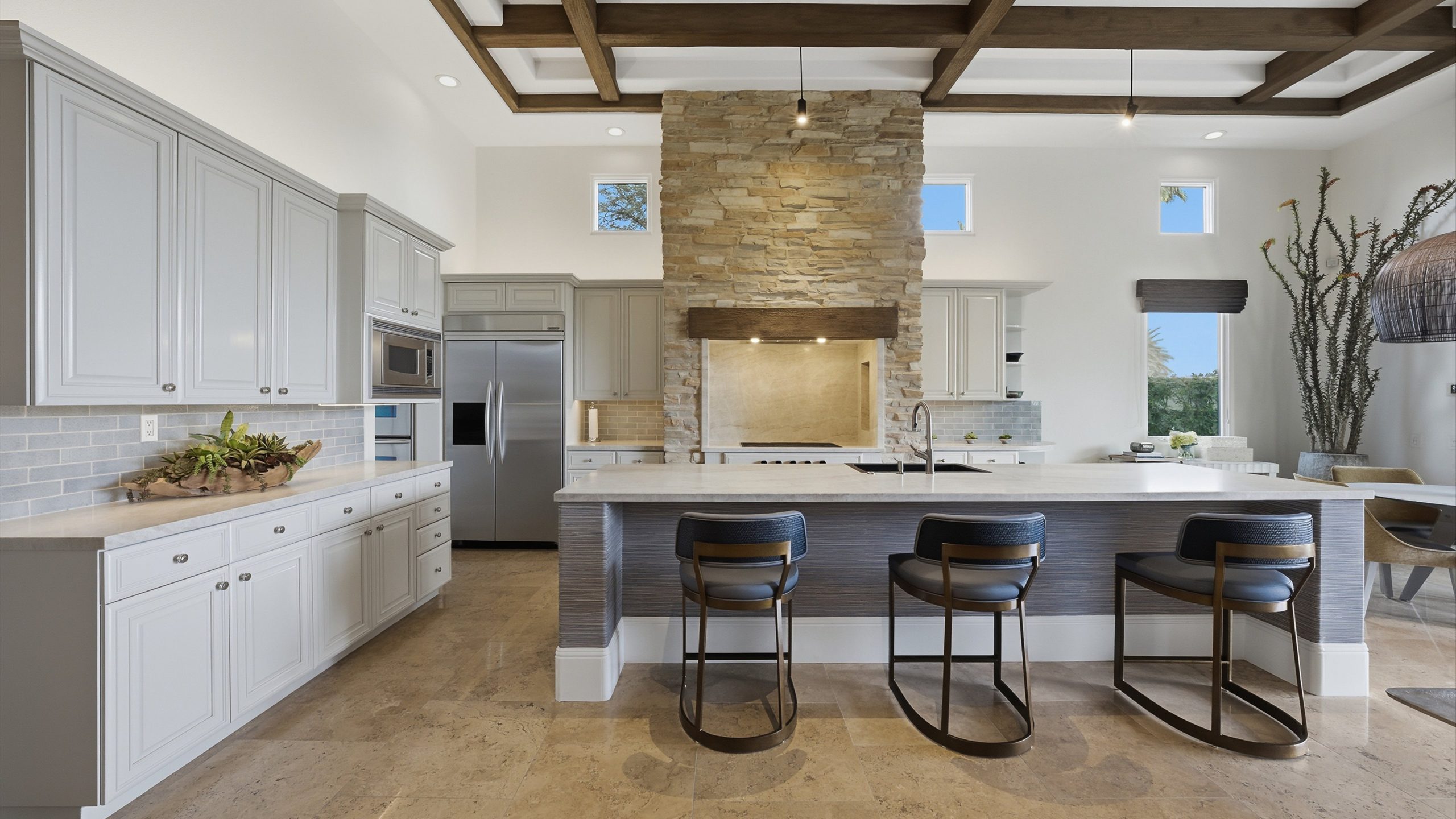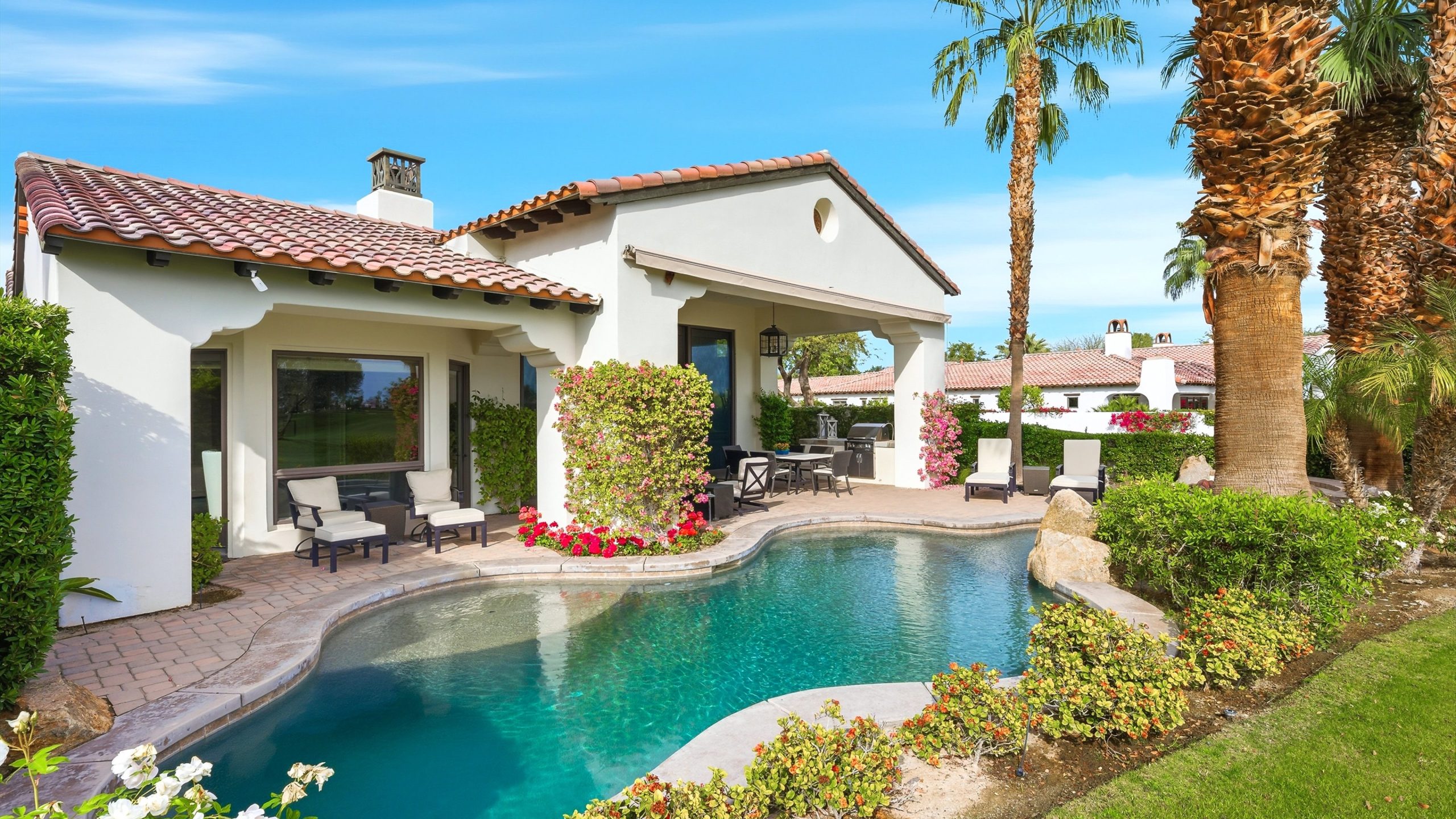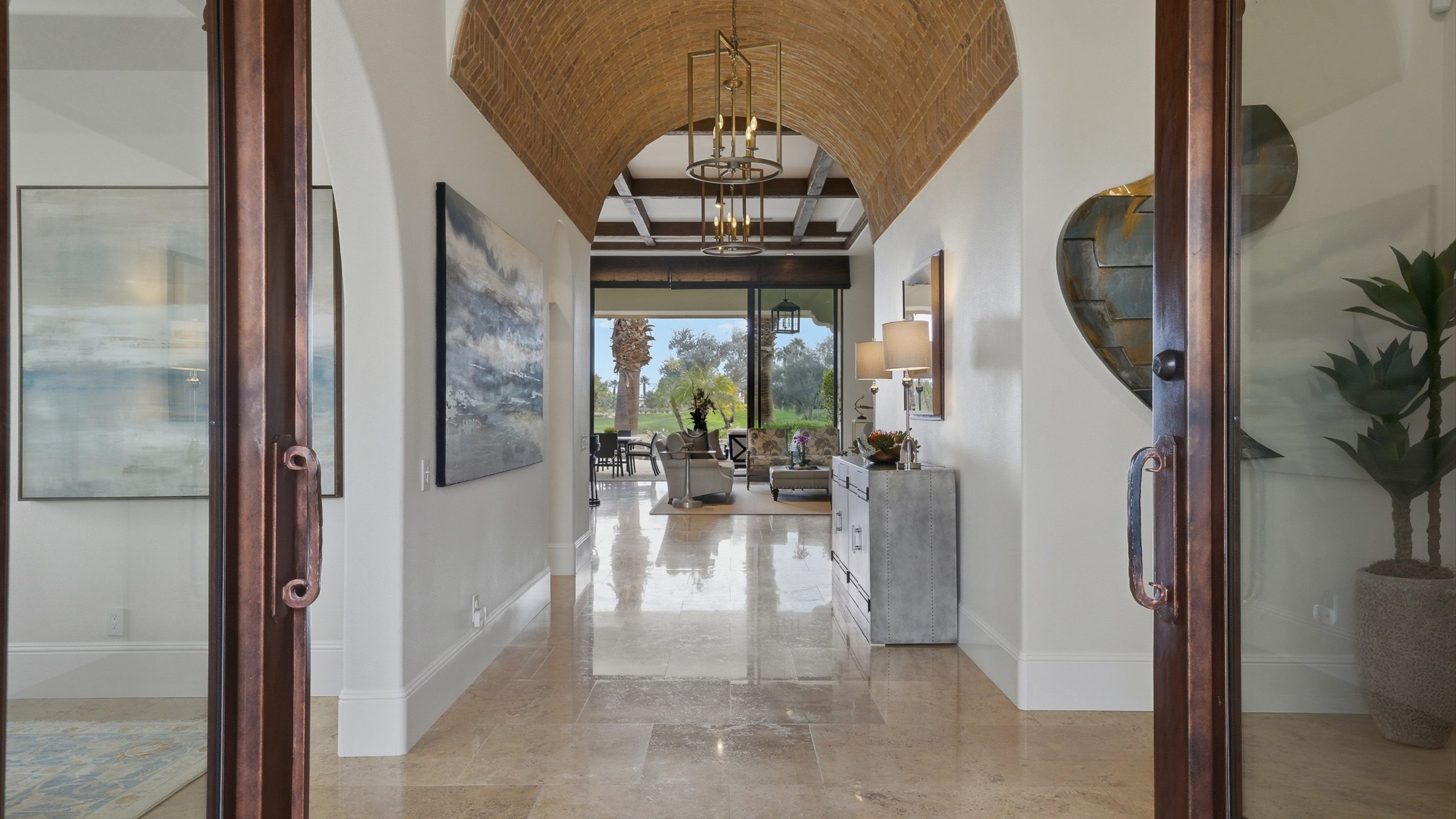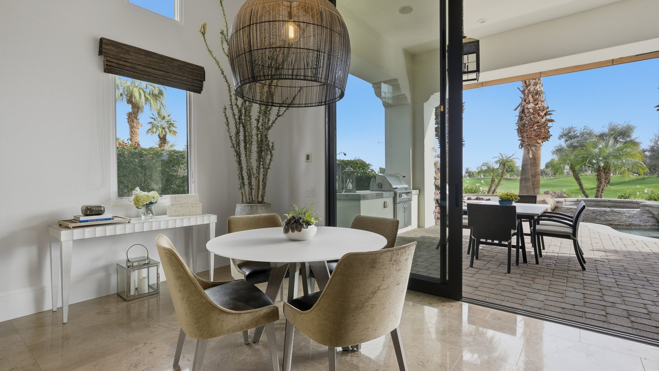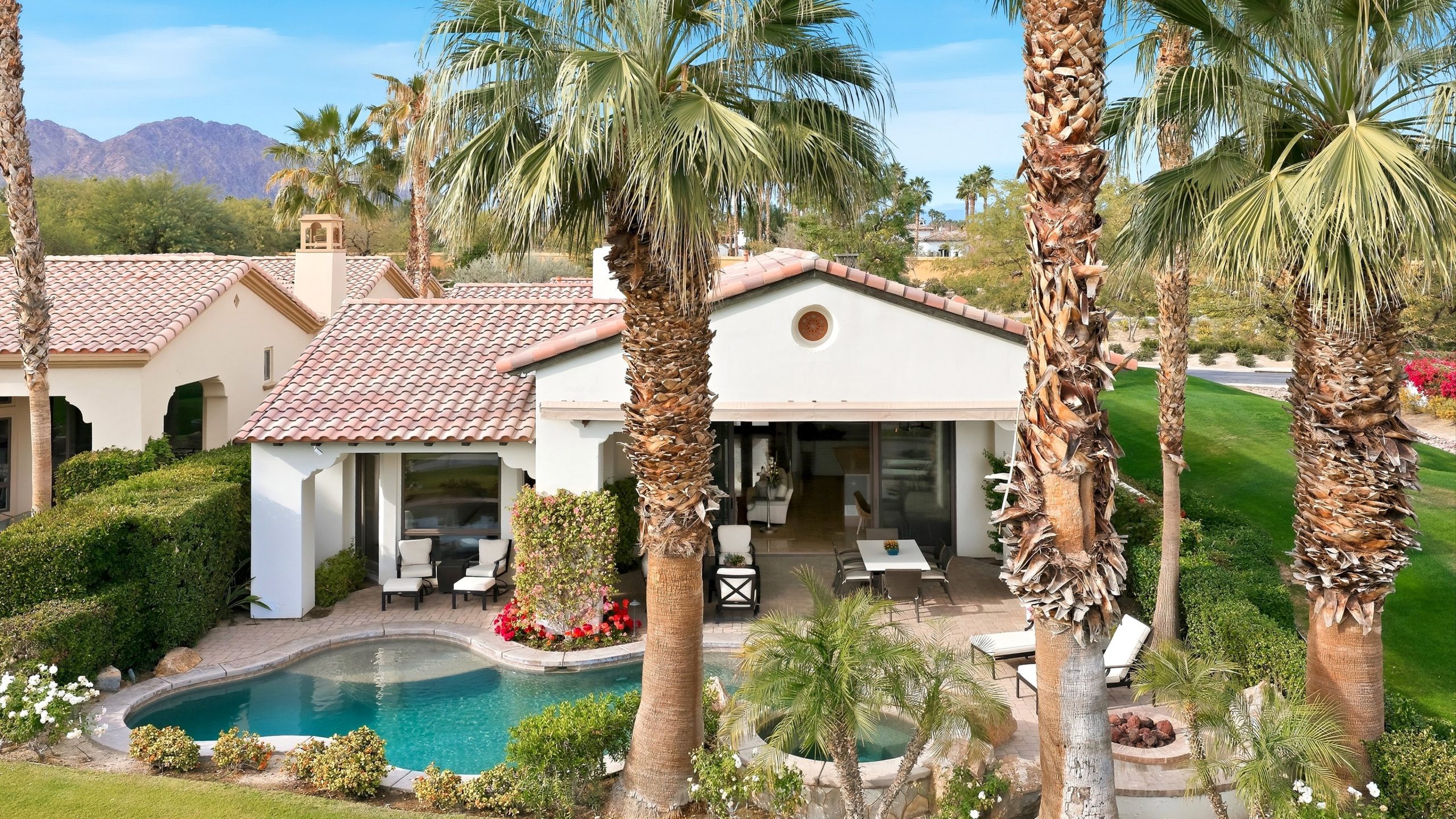 Understated elegance and thoughtful craftsmanship define this extensively refreshed residence, where design and function merge intentionally and effortlessly. Recent renovations transformed the main living spaces by introducing architectural ceiling beams and a refined material palette that adds warmth and depth without overwhelming the home’s clean lines. The kitchen makes a quiet yet powerful statement, featuring leathered Taj Mahal quartzite countertops that bring organic texture and subtle movement to the space. A built-in EuroCave wine refrigerator with capacity for 150 bottles offers a dedicated showcase for collectors and entertainers alike, while premium appliances support daily ease. The adjacent butler’s pantry is elevated with designer wallpaper, creating a tailored, jewel-box moment between the kitchen and dining area. In the great room, a custom European oak built-in anchors the space, paired with a polished Tundra Grey marble fireplace surround that adds a modern edge. High-end designer furnishings complement the architectural upgrades and reinforce the home’s cohesive aesthetic. The powder bath features quarter-sawn mahogany cabinetry topped with honed Caesarstone, blending rich wood grain with sleek stone surfaces. Throughout the home, professionally polished travertine floors enhance their natural character and lend a fresh, refined feel. A dedicated office provides a private and flexible workspace, ideal for remote work or creative pursuits. Beyond the main residence, a detached two-bedroom casita offers a private retreat for guests. Ideally positioned on a premier end lot adjacent to a greenbelt, the property enjoys sweeping south-facing views across the third fairway of the Rees Jones designed golf course at Andalusia Country Club. The panoramic backdrop of the Santa Rosa and Coral Mountains creates a dramatic and ever-changing setting, capturing the beauty of desert light from sunrise to sunset. Come live the life you’ve always imagined!