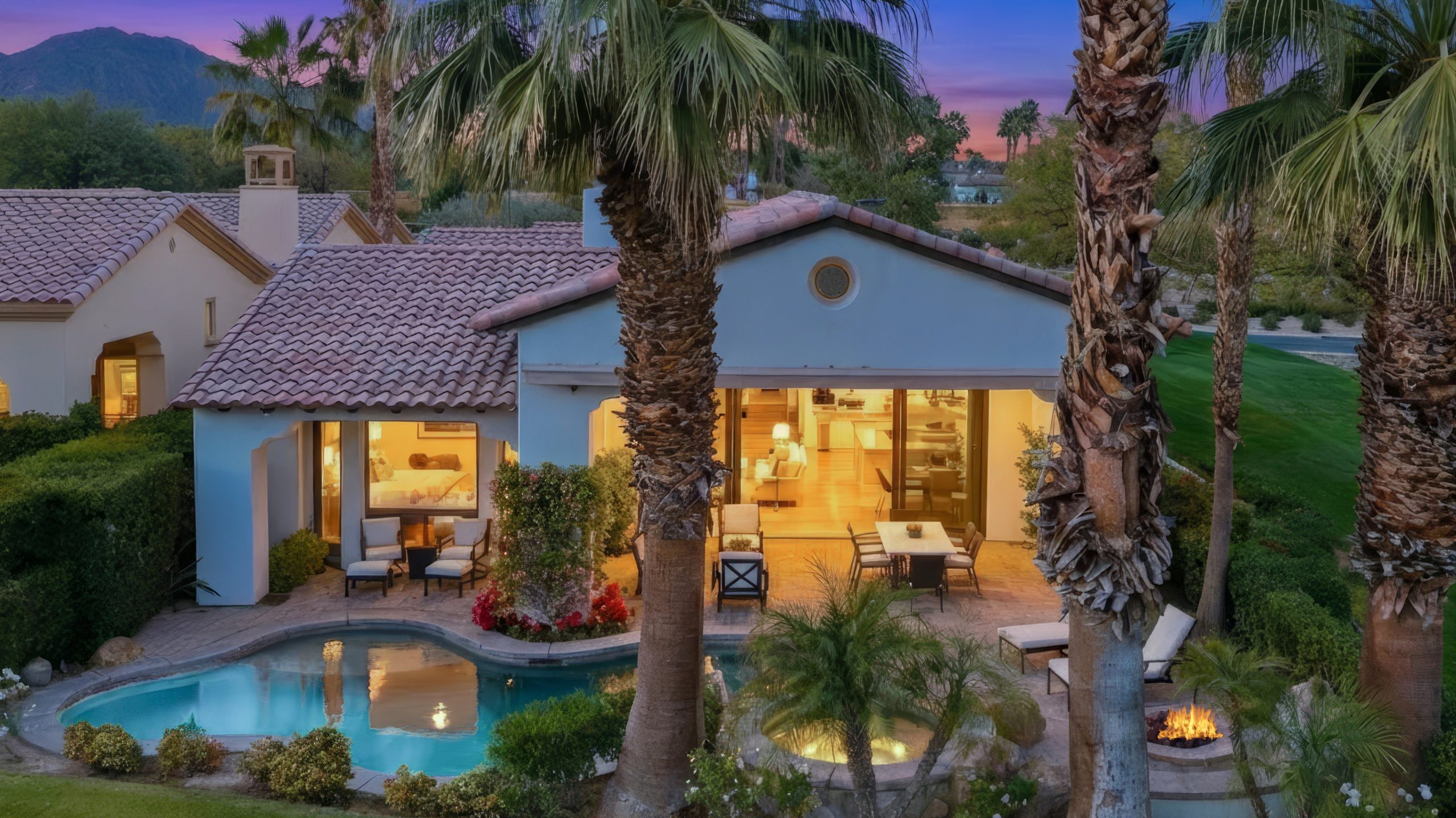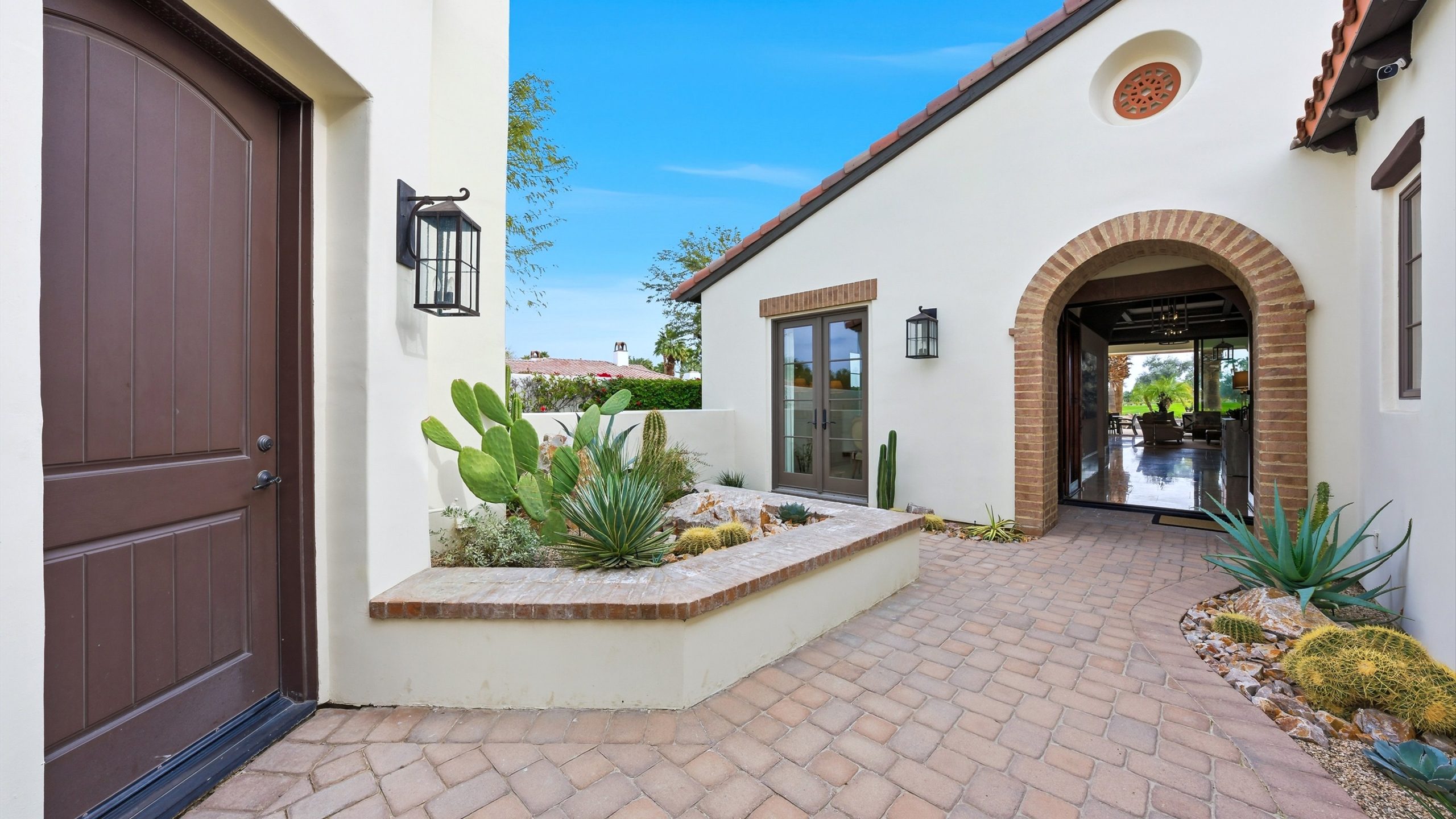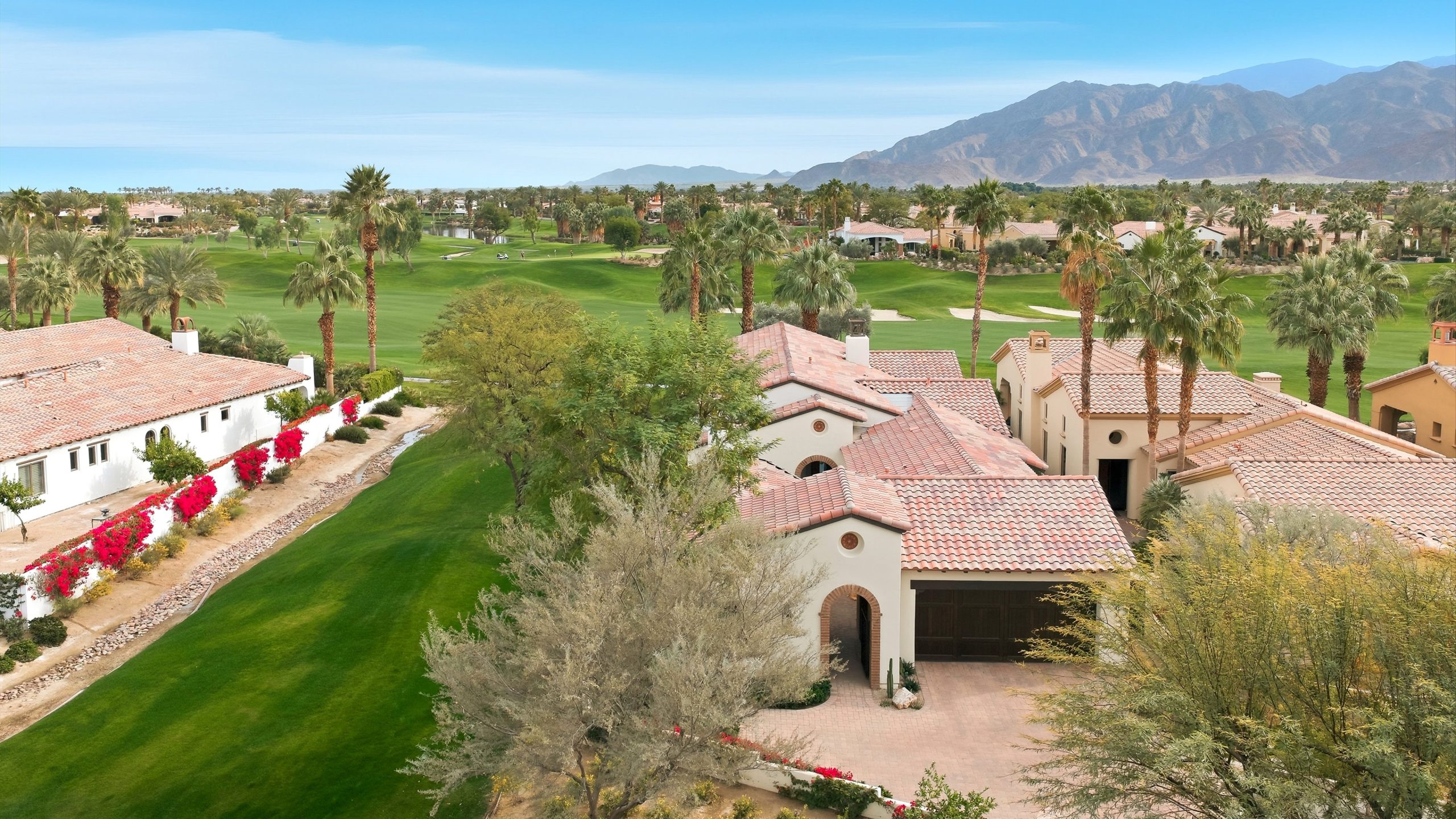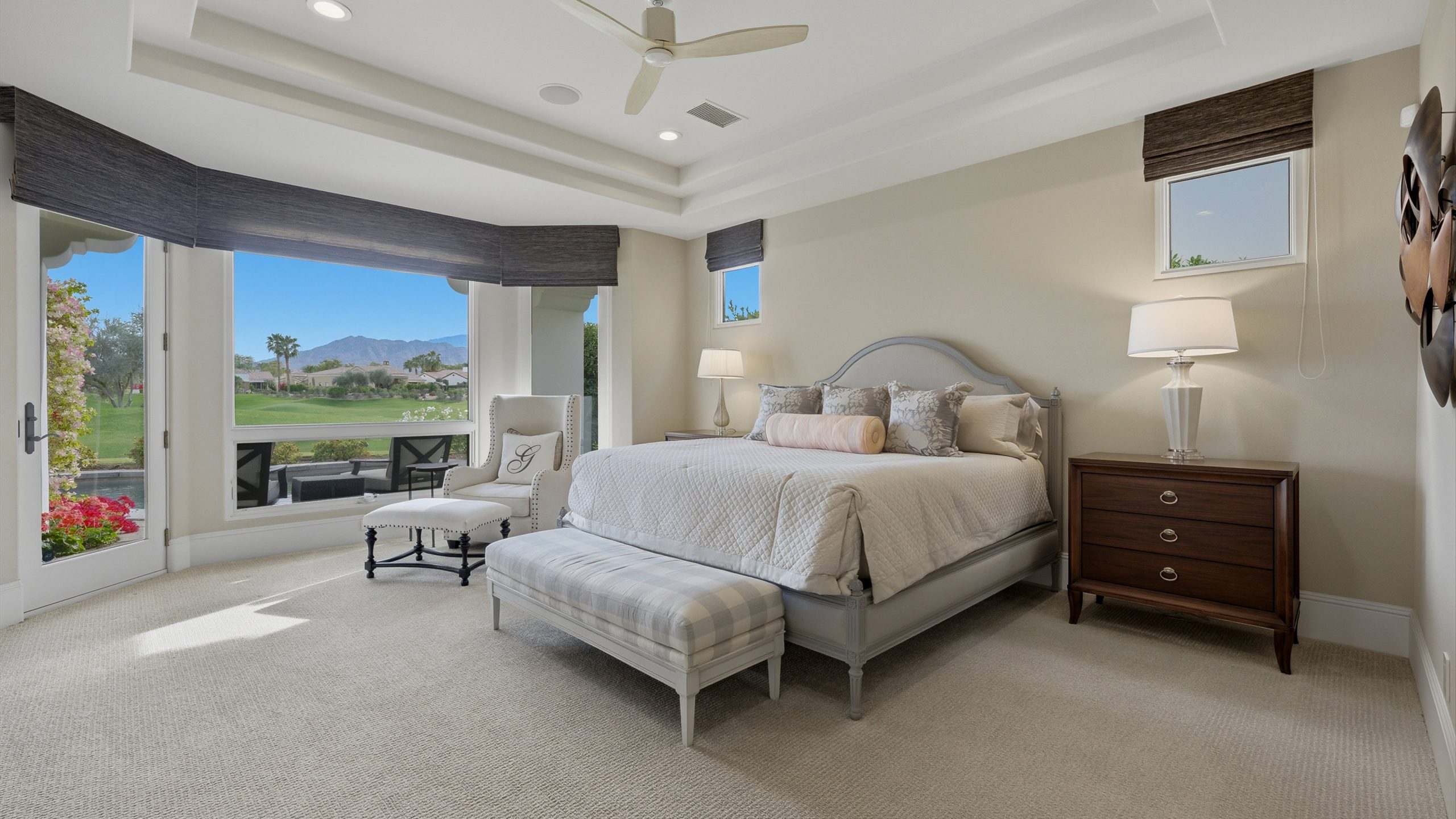 Understated elegance and thoughtful craftsmanship define this extensively refreshed residence, where design and function merge intentionally and effortlessly. Recent renovations transformed the main living spaces by introducing architectural ceiling beams and a refined material palette that adds warmth and depth without overwhelming the home’s clean lines. The kitchen makes a quiet yet powerful statement, featuring leathered Taj Mahal quartzite countertops that bring organic texture and subtle movement to the space. A built-in EuroCave wine refrigerator with capacity for 150 bottles offers a dedicated showcase for collectors and entertainers alike, while premium appliances support daily ease. The adjacent butler’s pantry is elevated with designer wallpaper, creating a tailored, jewel-box moment between the kitchen and dining area. In the great room, a custom European oak built-in anchors the space, paired with a polished Tundra Grey marble fireplace surround that adds a modern edge. High-end designer furnishings complement the architectural upgrades and reinforce the home’s cohesive aesthetic. The powder bath features quarter-sawn mahogany cabinetry topped with honed Caesarstone, blending rich wood grain with sleek stone surfaces. Throughout the home, professionally polished travertine floors enhance their natural character and lend a fresh, refined feel. A dedicated office provides a private and flexible workspace, ideal for remote work or creative pursuits. Beyond the main residence, a detached two-bedroom casita offers a private retreat for guests. Ideally positioned on a premier end lot adjacent to a greenbelt, the property enjoys sweeping south-facing views across the third fairway of the Rees Jones designed golf course at Andalusia Country Club. The panoramic backdrop of the Santa Rosa and Coral Mountains creates a dramatic and ever-changing setting, capturing the beauty of desert light from sunrise to sunset. Come live the life you’ve always imagined!