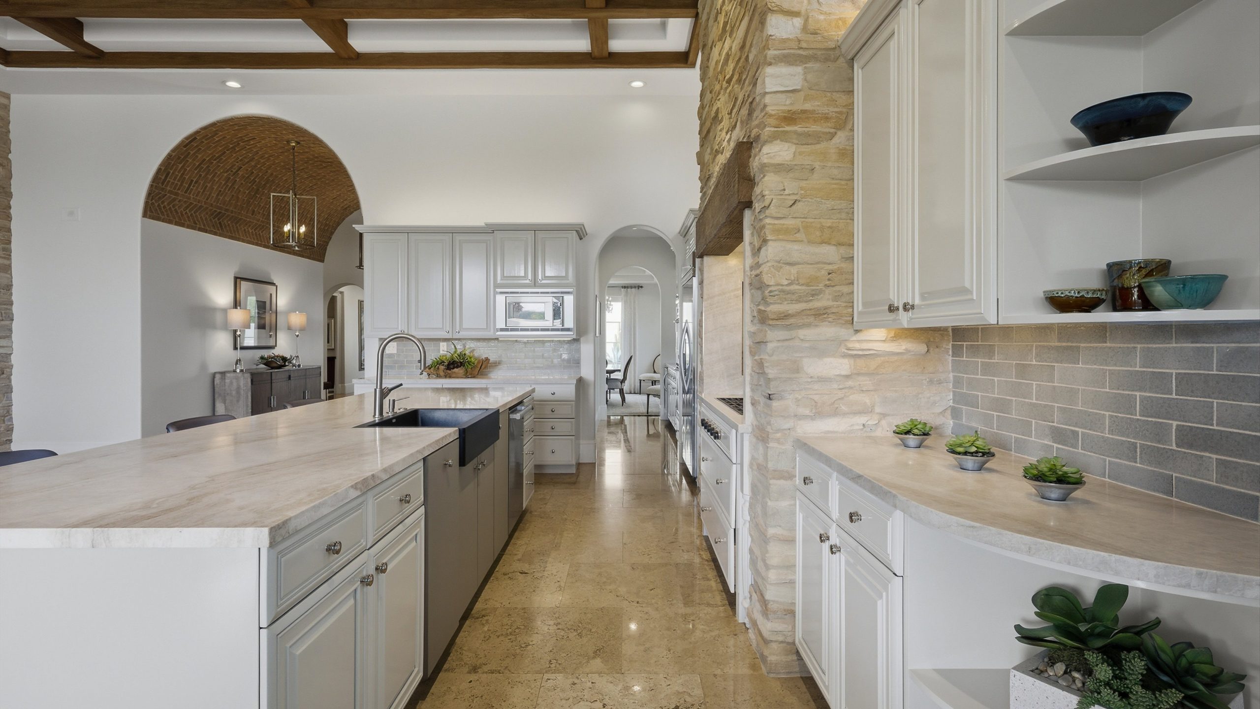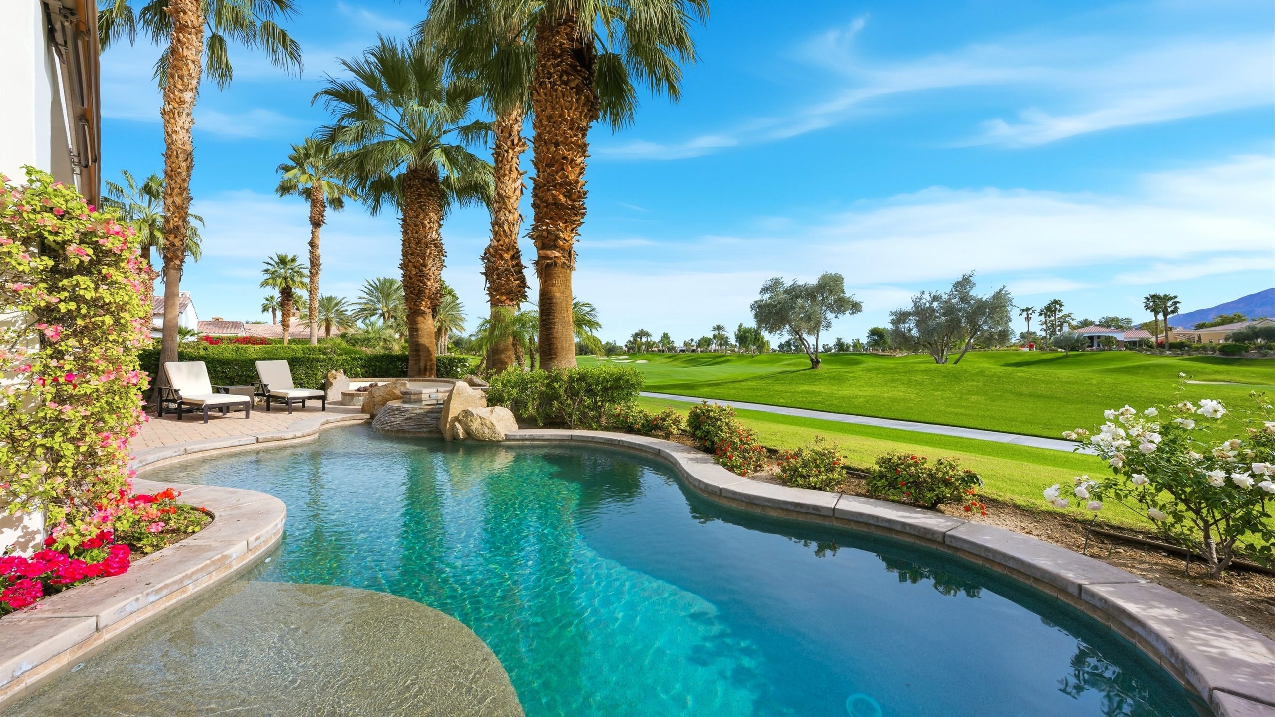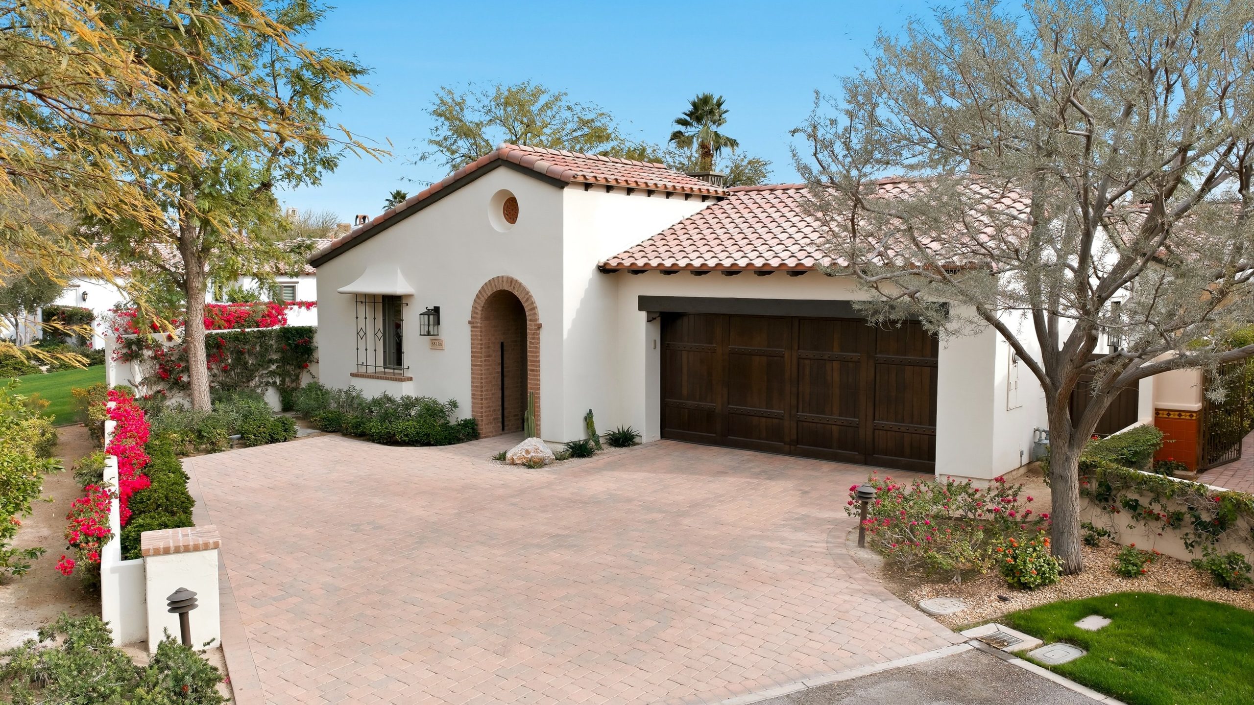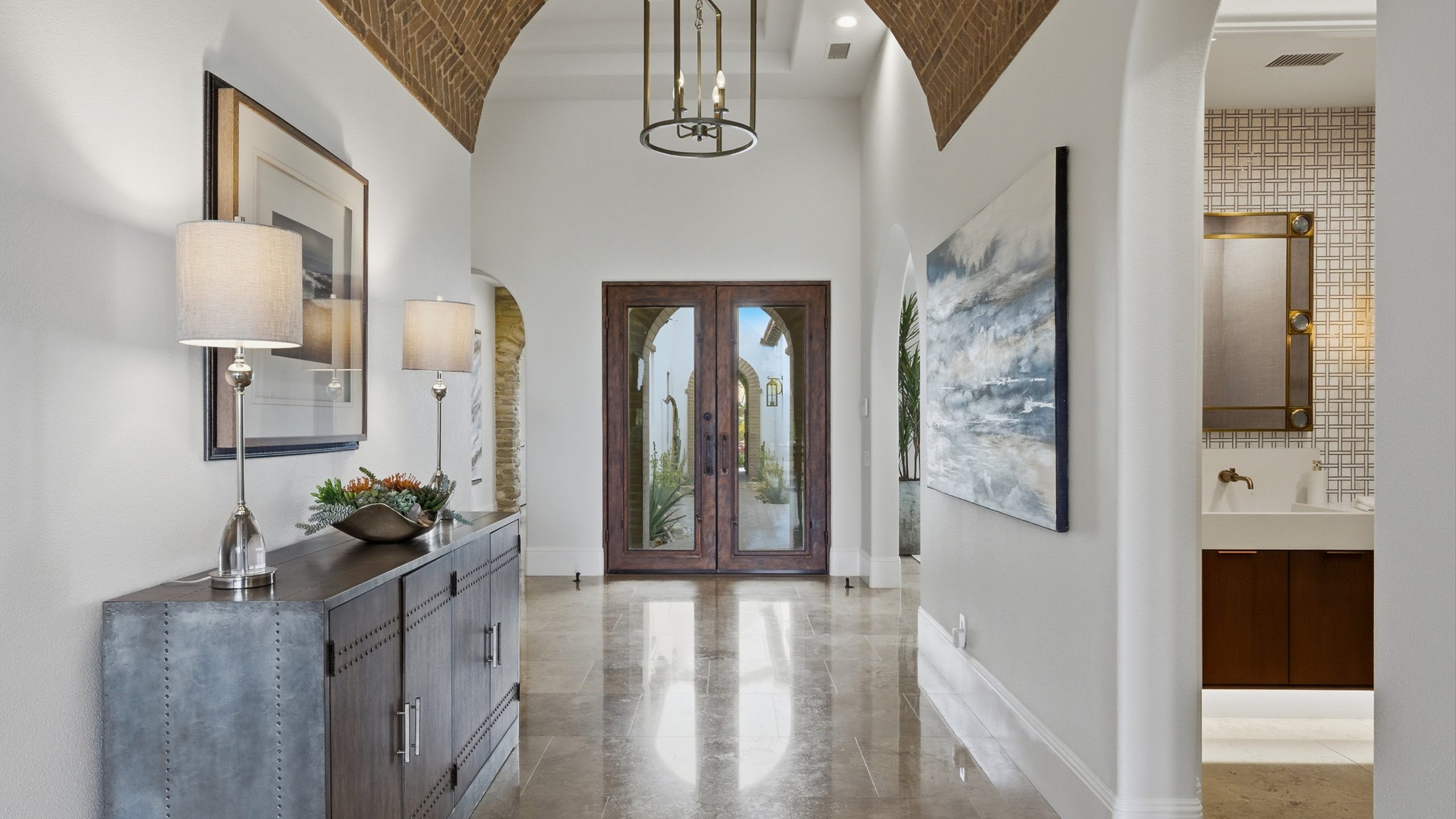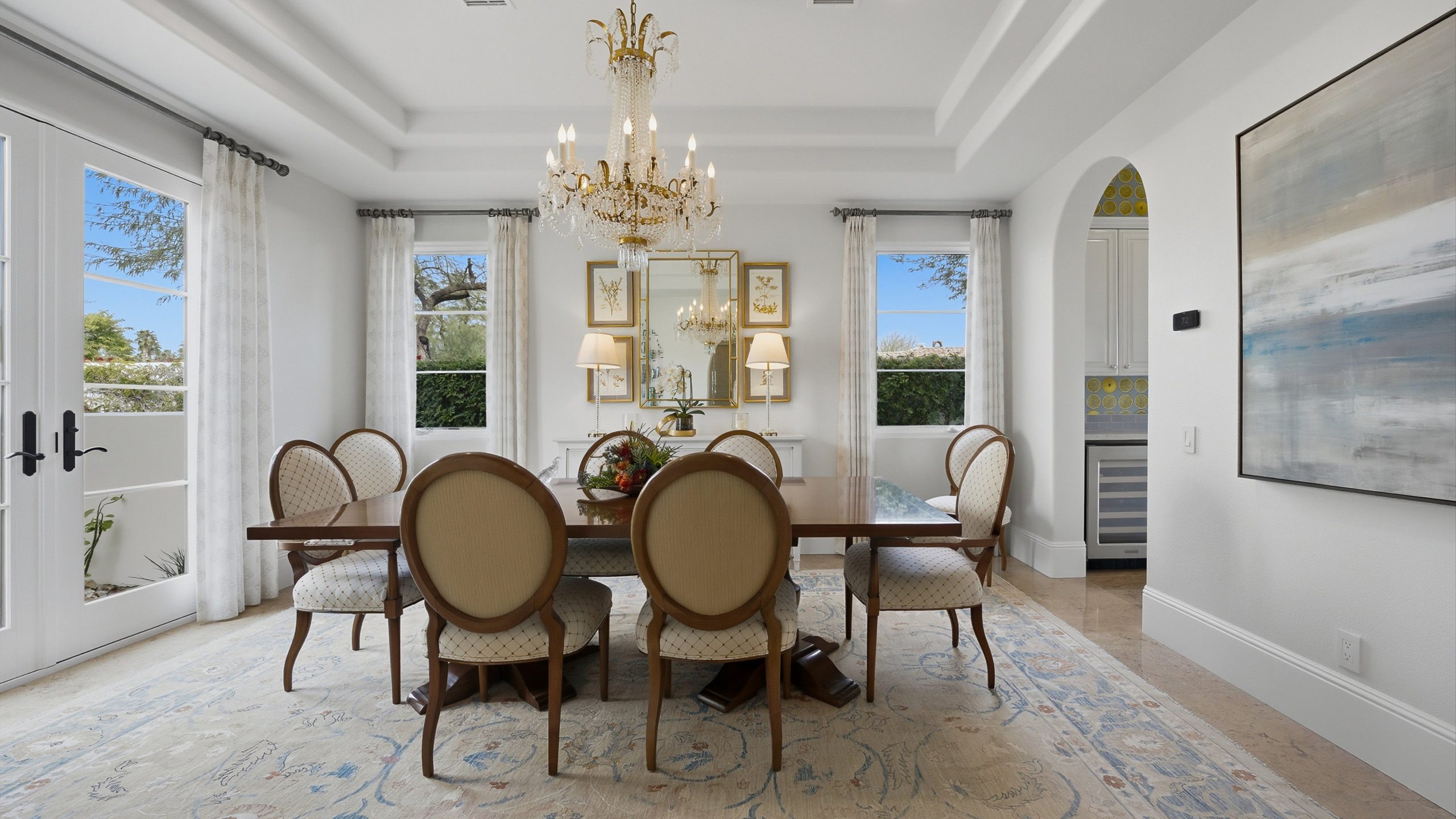 Understated elegance and thoughtful craftsmanship define this extensively refreshed residence, where design and function merge intentionally and effortlessly. Recent renovations transformed the main living spaces by introducing architectural ceiling beams and a refined material palette that adds warmth and depth without overwhelming the home’s clean lines. The kitchen makes a quiet yet powerful statement, featuring leathered Taj Mahal quartzite countertops that bring organic texture and subtle movement to the space. A built-in EuroCave wine refrigerator with capacity for 150 bottles offers a dedicated showcase for collectors and entertainers alike, while premium appliances support daily ease. The adjacent butler’s pantry is elevated with designer wallpaper, creating a tailored, jewel-box moment between the kitchen and dining area. In the great room, a custom European oak built-in anchors the space, paired with a polished Tundra Grey marble fireplace surround that adds a modern edge. High-end designer furnishings complement the architectural upgrades and reinforce the home’s cohesive aesthetic. The powder bath features quarter-sawn mahogany cabinetry topped with honed Caesarstone, blending rich wood grain with sleek stone surfaces. Throughout the home, professionally polished travertine floors enhance their natural character and lend a fresh, refined feel. A dedicated office provides a private and flexible workspace, ideal for remote work or creative pursuits. Beyond the main residence, a detached two-bedroom casita offers a private retreat for guests. Ideally positioned on a premier end lot adjacent to a greenbelt, the property enjoys sweeping south-facing views across the third fairway of the Rees Jones designed golf course at Andalusia Country Club. The panoramic backdrop of the Santa Rosa and Coral Mountains creates a dramatic and ever-changing setting, capturing the beauty of desert light from sunrise to sunset. Come live the life you’ve always imagined!
