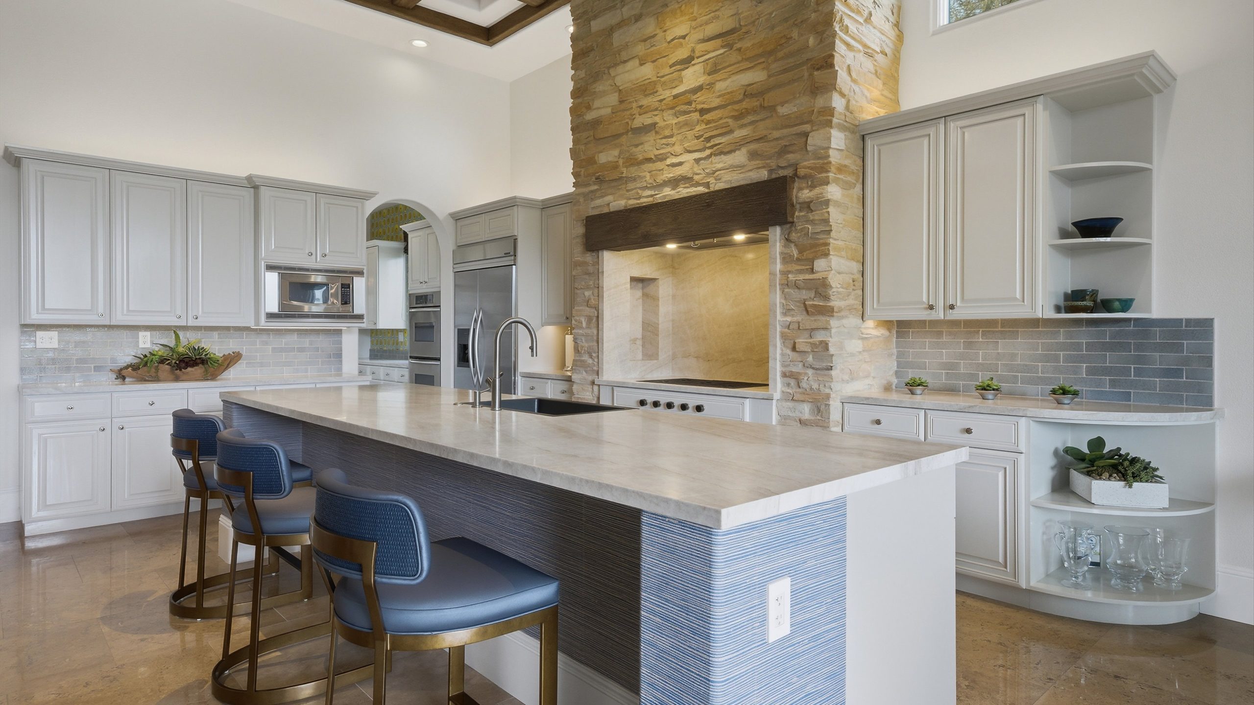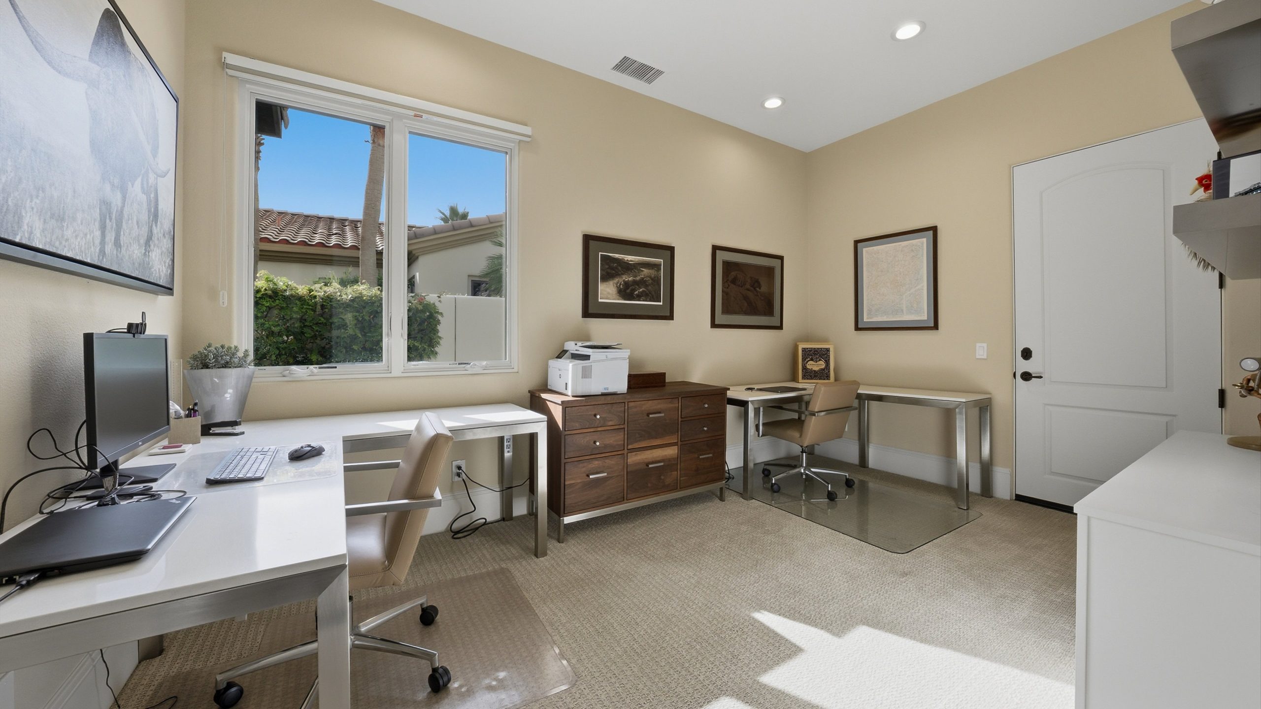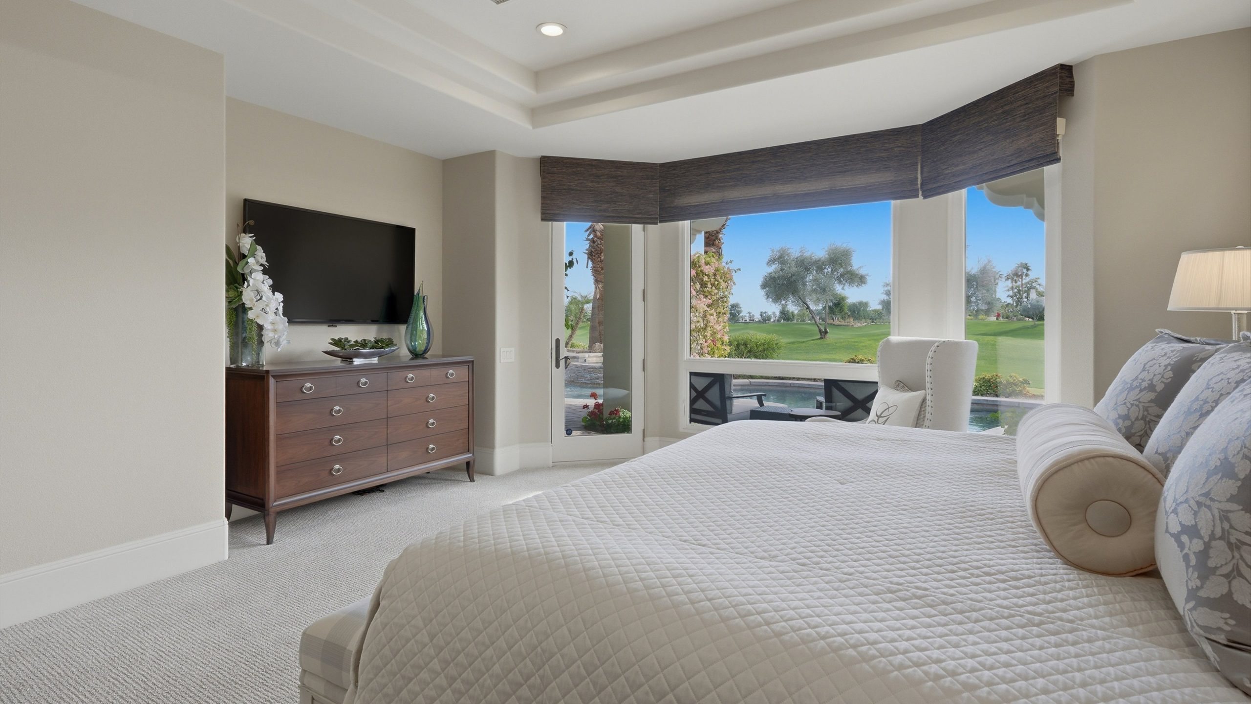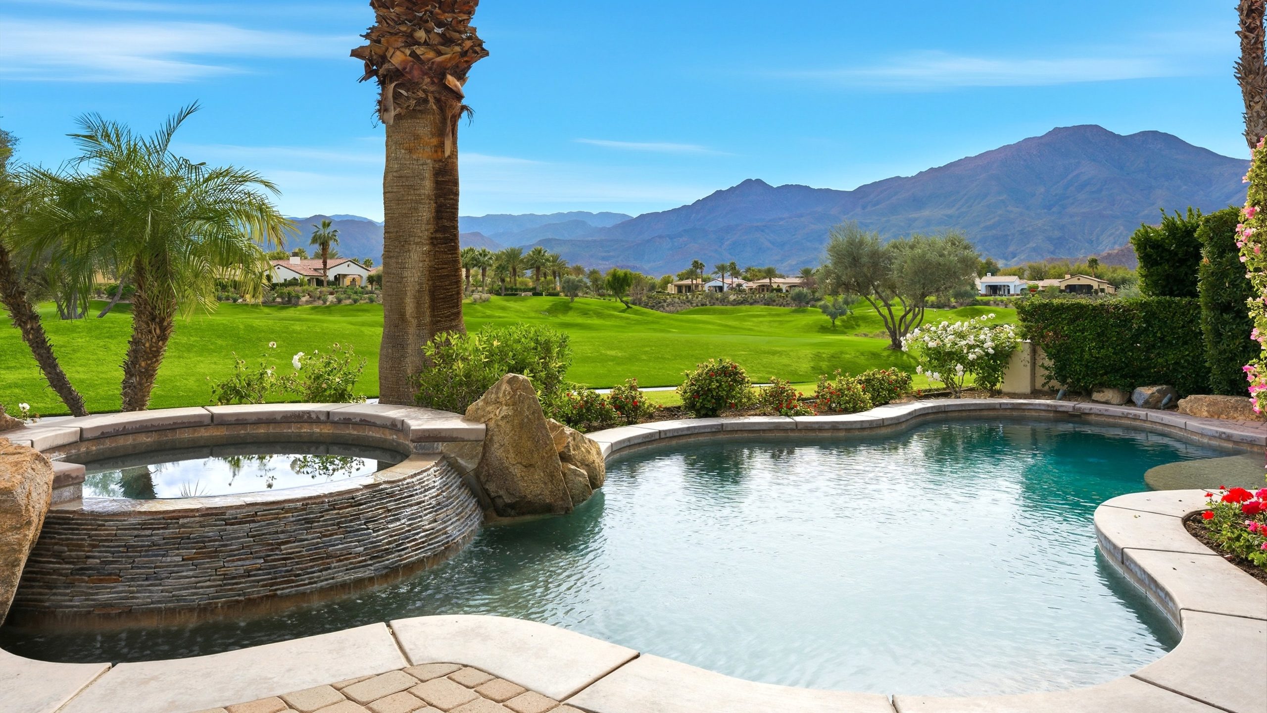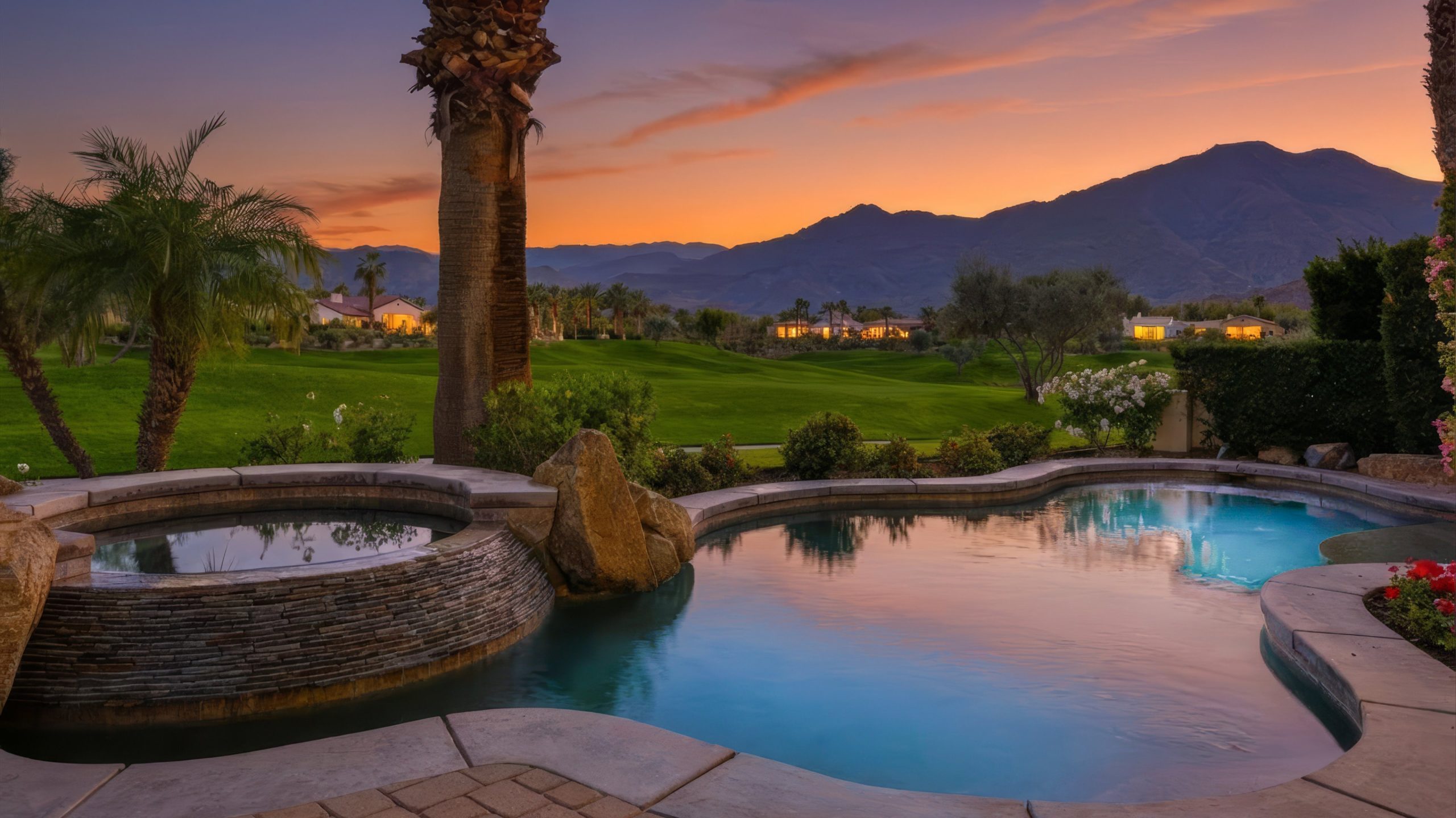 Understated elegance and thoughtful craftsmanship define this extensively refreshed residence, where design and function merge intentionally and effortlessly. Recent renovations transformed the main living spaces by introducing architectural ceiling beams and a refined material palette that adds warmth and depth without overwhelming the home’s clean lines. The kitchen makes a quiet yet powerful statement, featuring leathered Taj Mahal quartzite countertops that bring organic texture and subtle movement to the space. A built-in EuroCave wine refrigerator with capacity for 150 bottles offers a dedicated showcase for collectors and entertainers alike, while premium appliances support daily ease. The adjacent butler’s pantry is elevated with designer wallpaper, creating a tailored, jewel-box moment between the kitchen and dining area. In the great room, a custom European oak built-in anchors the space, paired with a polished Tundra Grey marble fireplace surround that adds a modern edge. High-end designer furnishings complement the architectural upgrades and reinforce the home’s cohesive aesthetic. The powder bath features quarter-sawn mahogany cabinetry topped with honed Caesarstone, blending rich wood grain with sleek stone surfaces. Throughout the home, professionally polished travertine floors enhance their natural character and lend a fresh, refined feel. A dedicated office provides a private and flexible workspace, ideal for remote work or creative pursuits. Beyond the main residence, a detached two-bedroom casita offers a private retreat for guests. Ideally positioned on a premier end lot adjacent to a greenbelt, the property enjoys sweeping south-facing views across the third fairway of the Rees Jones designed golf course at Andalusia Country Club. The panoramic backdrop of the Santa Rosa and Coral Mountains creates a dramatic and ever-changing setting, capturing the beauty of desert light from sunrise to sunset. Come live the life you’ve always imagined!