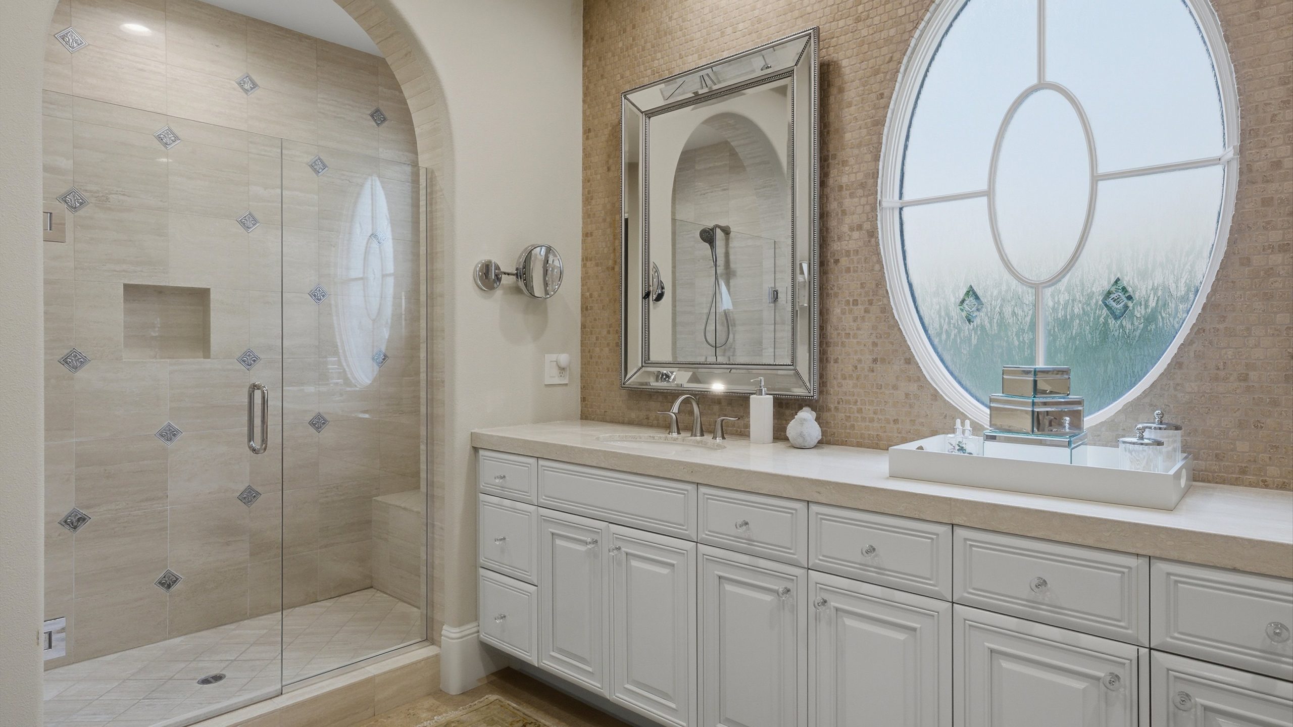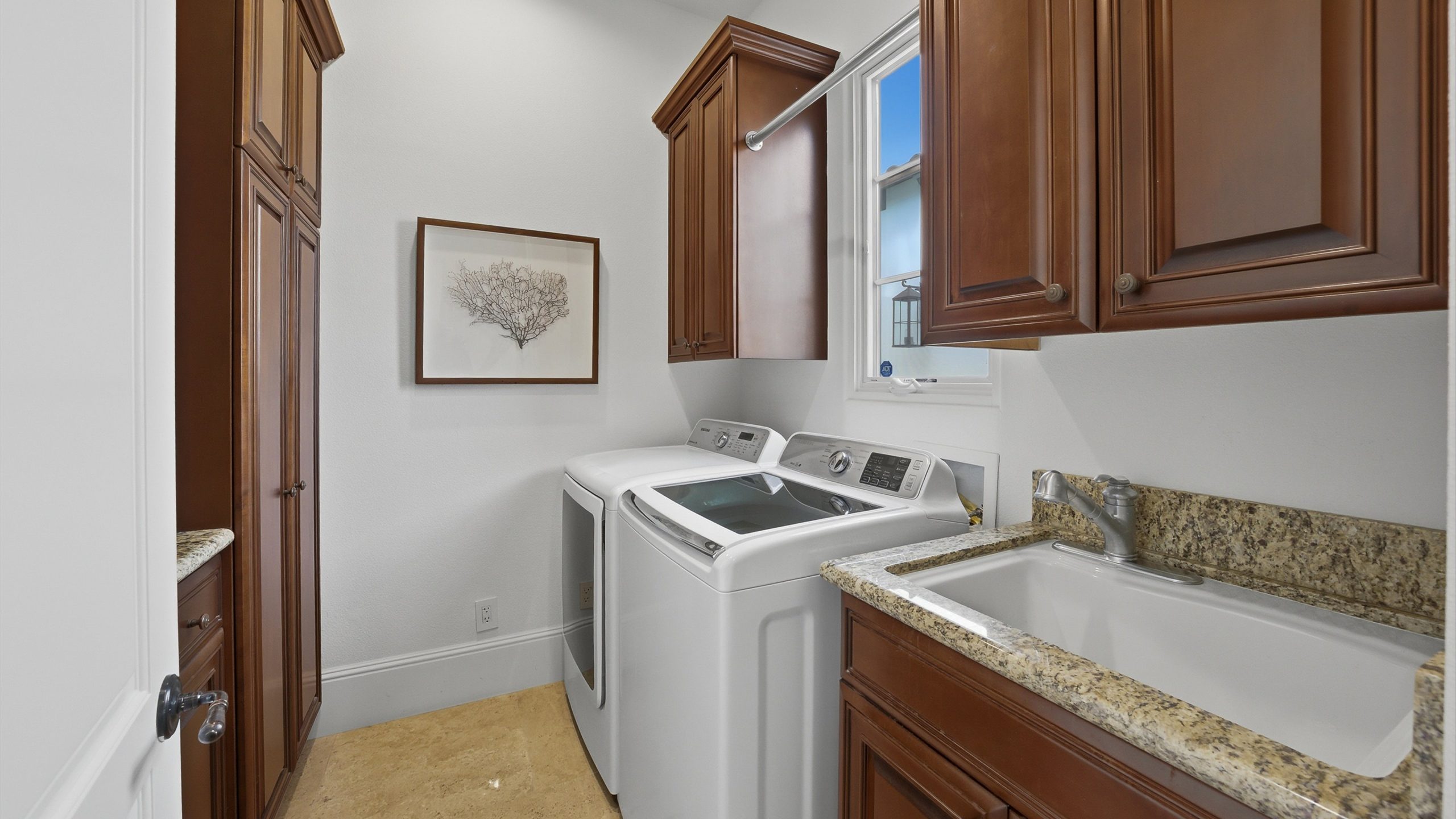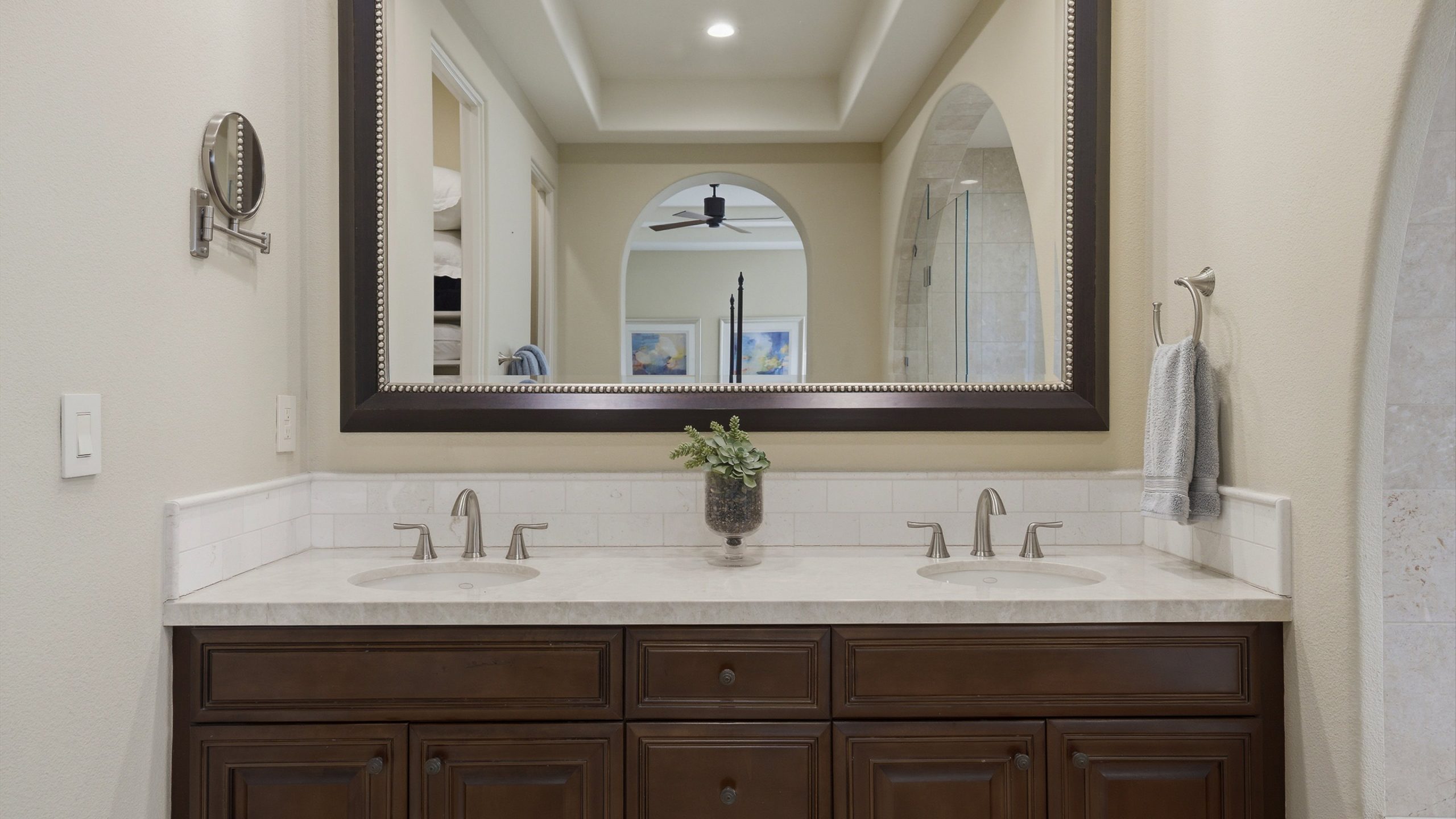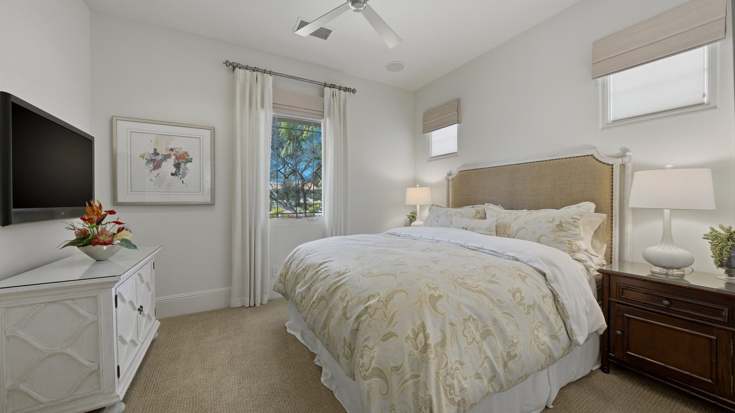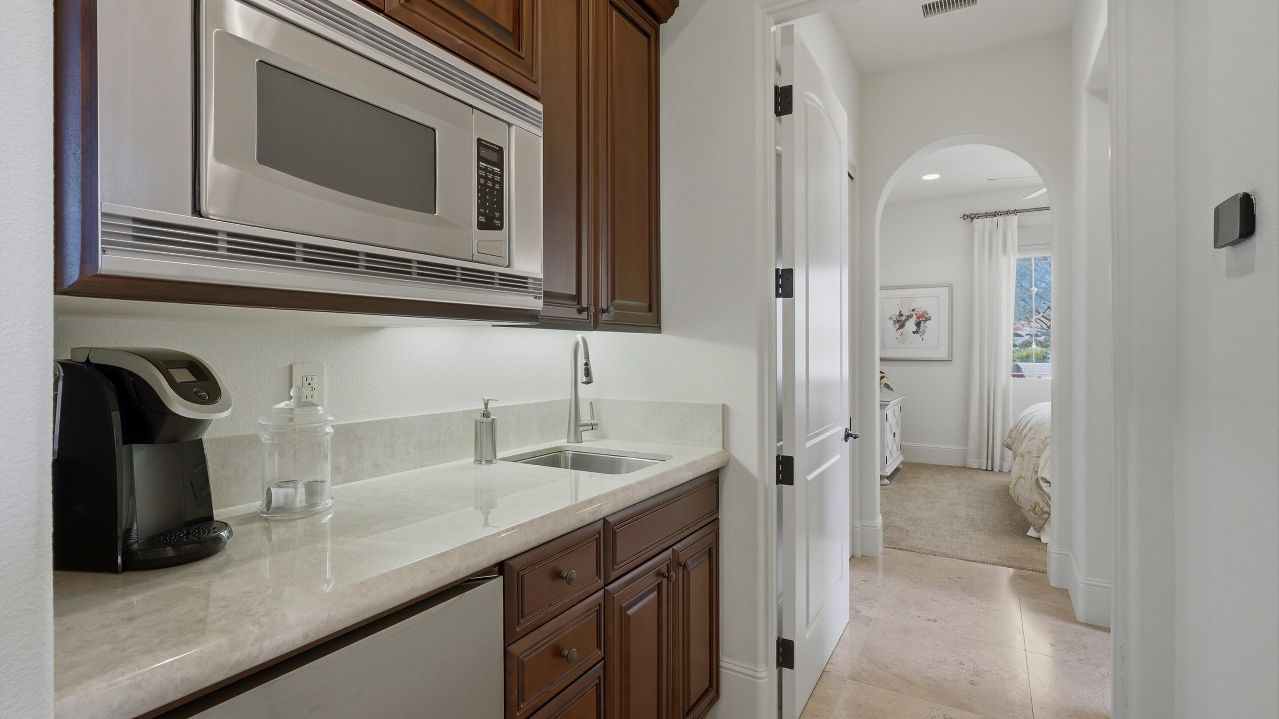 Understated elegance and thoughtful craftsmanship define this extensively refreshed residence, where design and function merge intentionally and effortlessly. Recent renovations transformed the main living spaces by introducing architectural ceiling beams and a refined material palette that adds warmth and depth without overwhelming the home’s clean lines. The kitchen makes a quiet yet powerful statement, featuring leathered Taj Mahal quartzite countertops that bring organic texture and subtle movement to the space. A built-in EuroCave wine refrigerator with capacity for 150 bottles offers a dedicated showcase for collectors and entertainers alike, while premium appliances support daily ease. The adjacent butler’s pantry is elevated with designer wallpaper, creating a tailored, jewel-box moment between the kitchen and dining area. In the great room, a custom European oak built-in anchors the space, paired with a polished Tundra Grey marble fireplace surround that adds a modern edge. High-end designer furnishings complement the architectural upgrades and reinforce the home’s cohesive aesthetic. The powder bath features quarter-sawn mahogany cabinetry topped with honed Caesarstone, blending rich wood grain with sleek stone surfaces. Throughout the home, professionally polished travertine floors enhance their natural character and lend a fresh, refined feel. A dedicated office provides a private and flexible workspace, ideal for remote work or creative pursuits. Beyond the main residence, a detached two-bedroom casita offers a private retreat for guests. Ideally positioned on a premier end lot adjacent to a greenbelt, the property enjoys sweeping south-facing views across the third fairway of the Rees Jones designed golf course at Andalusia Country Club. The panoramic backdrop of the Santa Rosa and Coral Mountains creates a dramatic and ever-changing setting, capturing the beauty of desert light from sunrise to sunset. Come live the life you’ve always imagined!