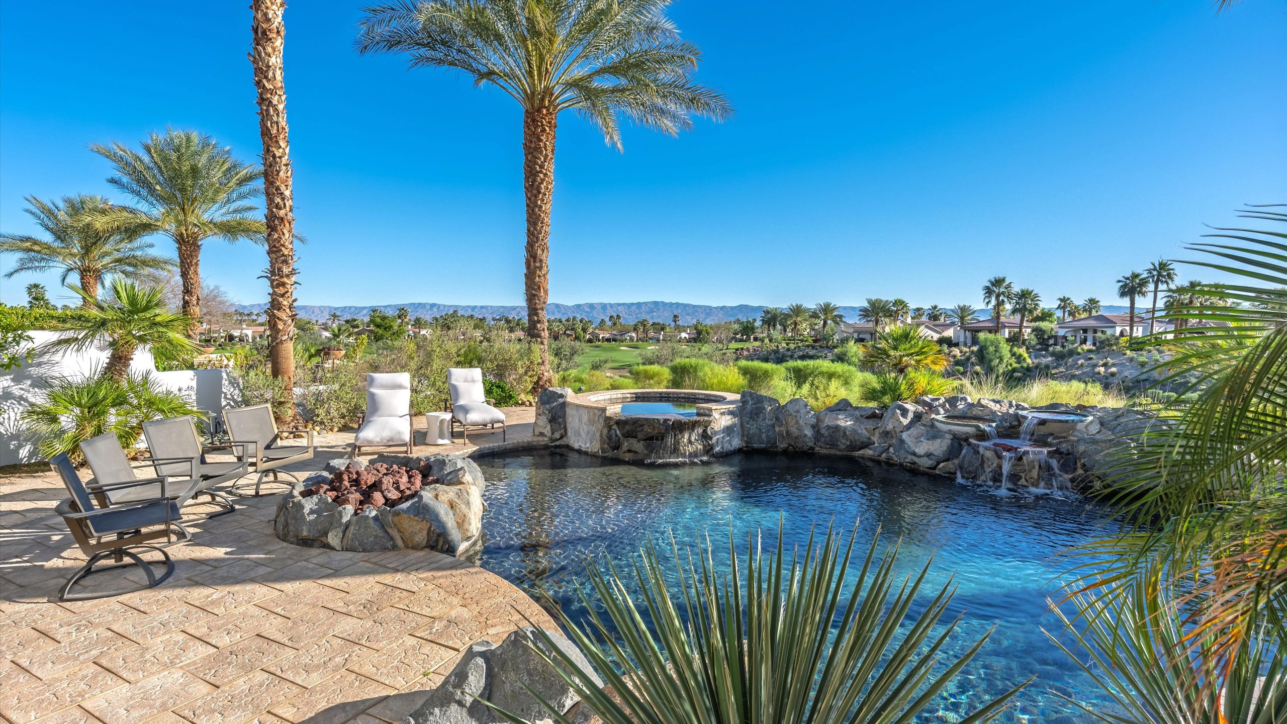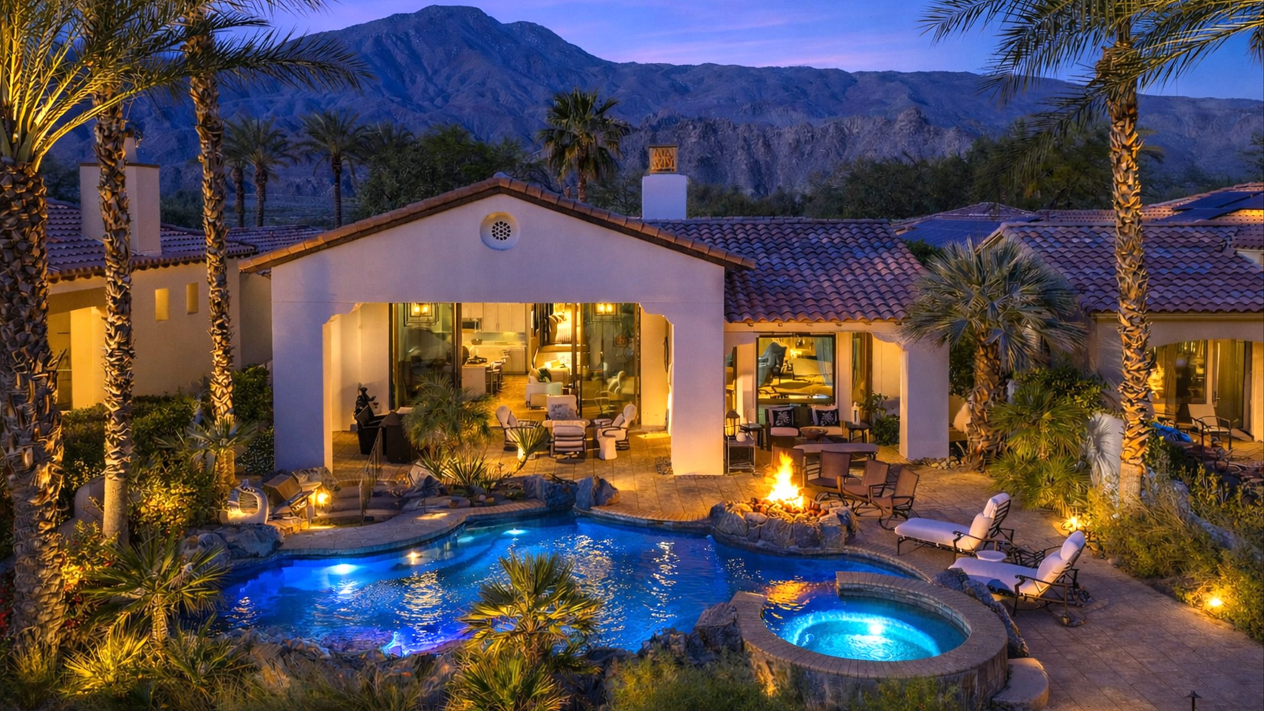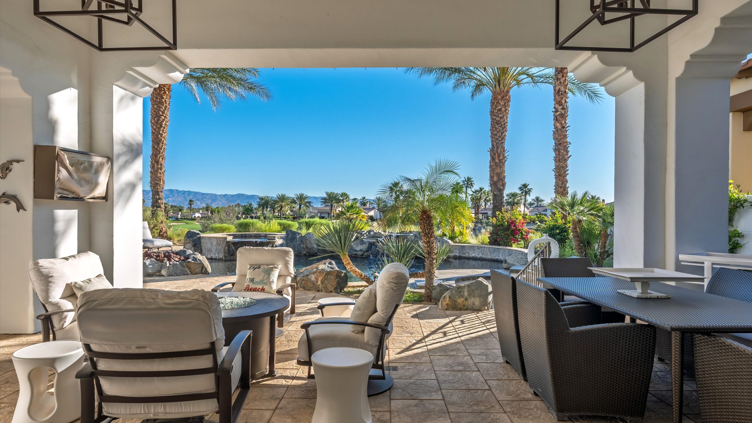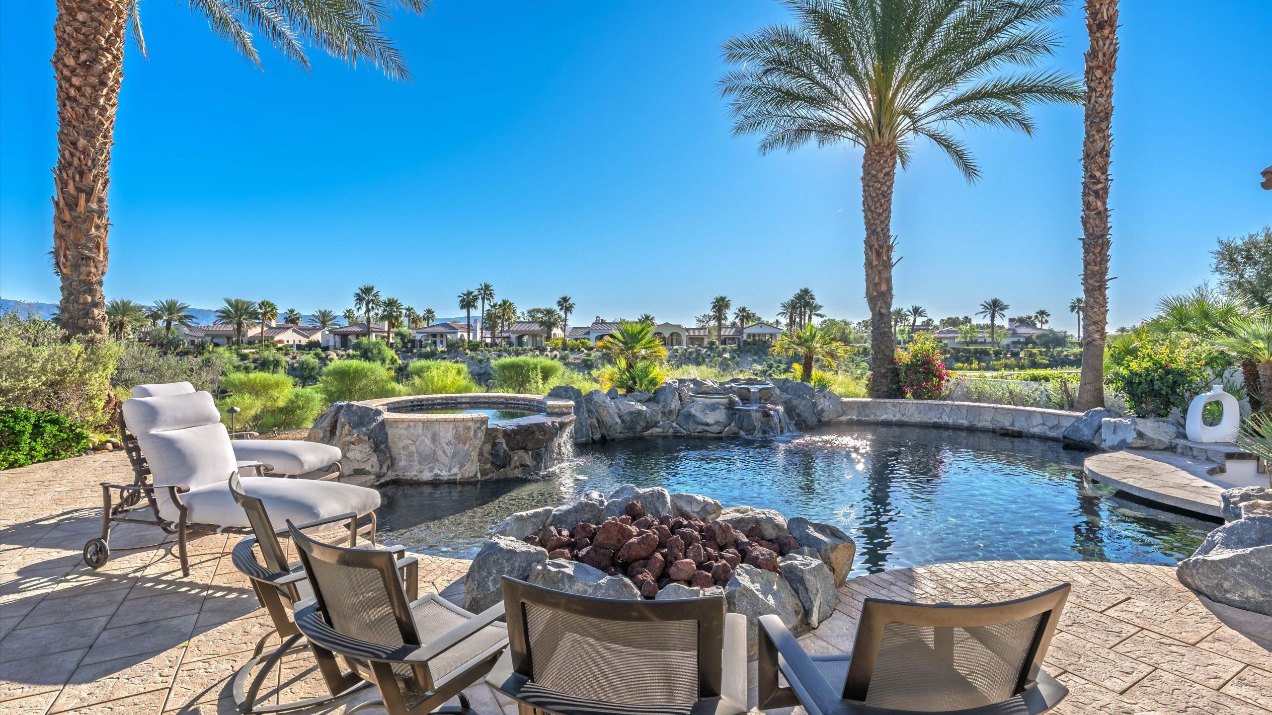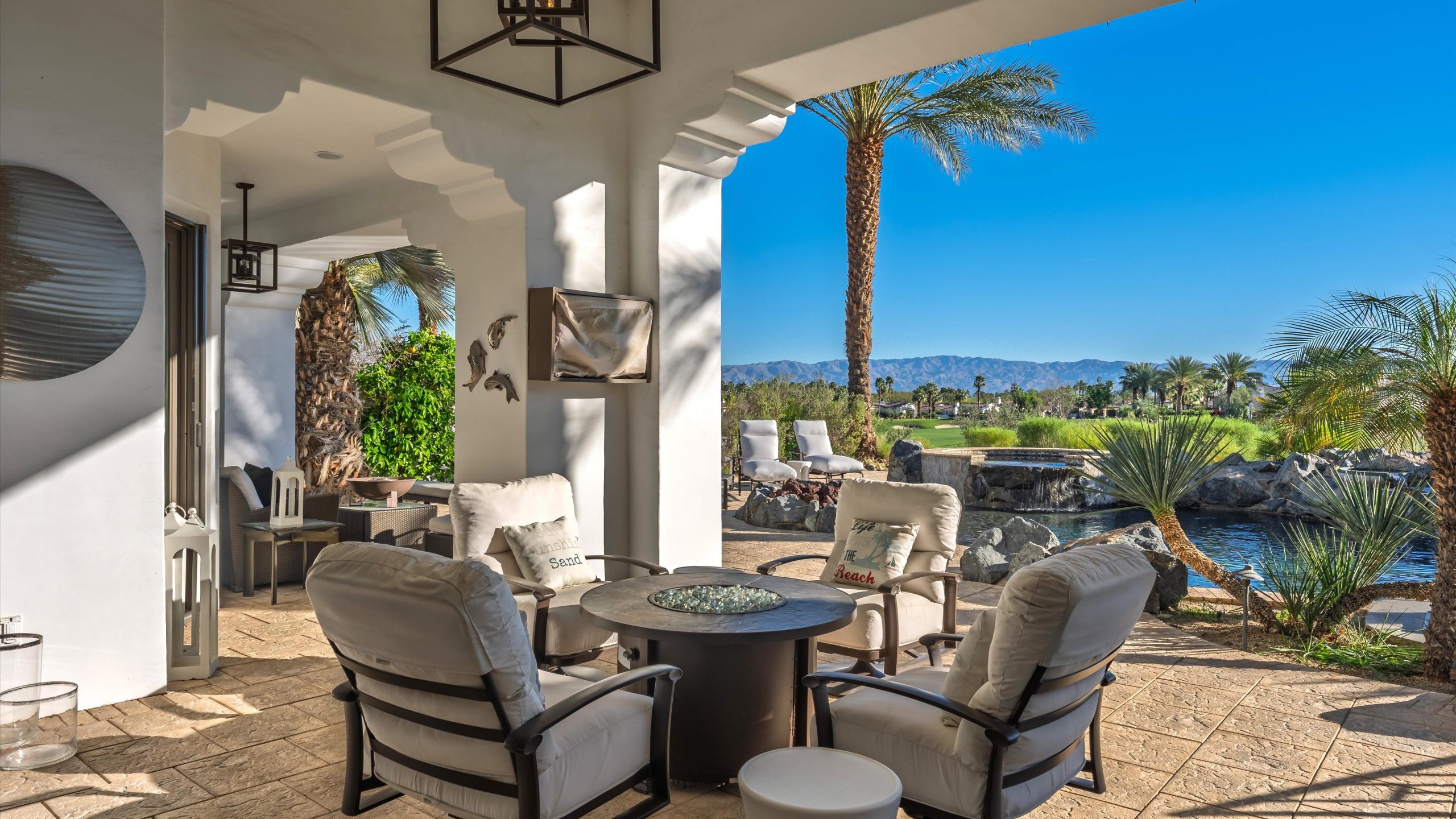 Set within the exclusive Andalusia Country Club, this exceptional 3,701 sq. ft. residence offers privacy, panoramic golf course views, and refined desert living. Designed with bespoke finishes and custom upgrades, the home features travertine flooring throughout and a thoughtfully expanded layout with 3 bedrooms, 4 bathrooms, a dedicated office, and a detached casita. The private casita includes a living area with a fireplace and kitchenette, ideal for guests. A spacious courtyard with a tranquil water feature creates a welcoming entry. Clean architectural lines and curated design elements establish a sense of understated elegance, while the home’s commanding position enhances both the views and the overall sense of exclusivity. Seamless indoor-outdoor integration allows for effortless entertaining, with living spaces that open to sweeping fairway vistas. The resort-style backyard is designed for both relaxation and hosting, featuring a pool with a dramatic rock feature and cascading waterfall, a spa, fire pit, built-in BBQ, and a large covered loggia—creating multiple spaces to gather, unwind, and enjoy the desert setting. Offered furnished, this residence delivers a turnkey opportunity for those seeking a highly customized, desert home. Come live the life you’ve always imagined!