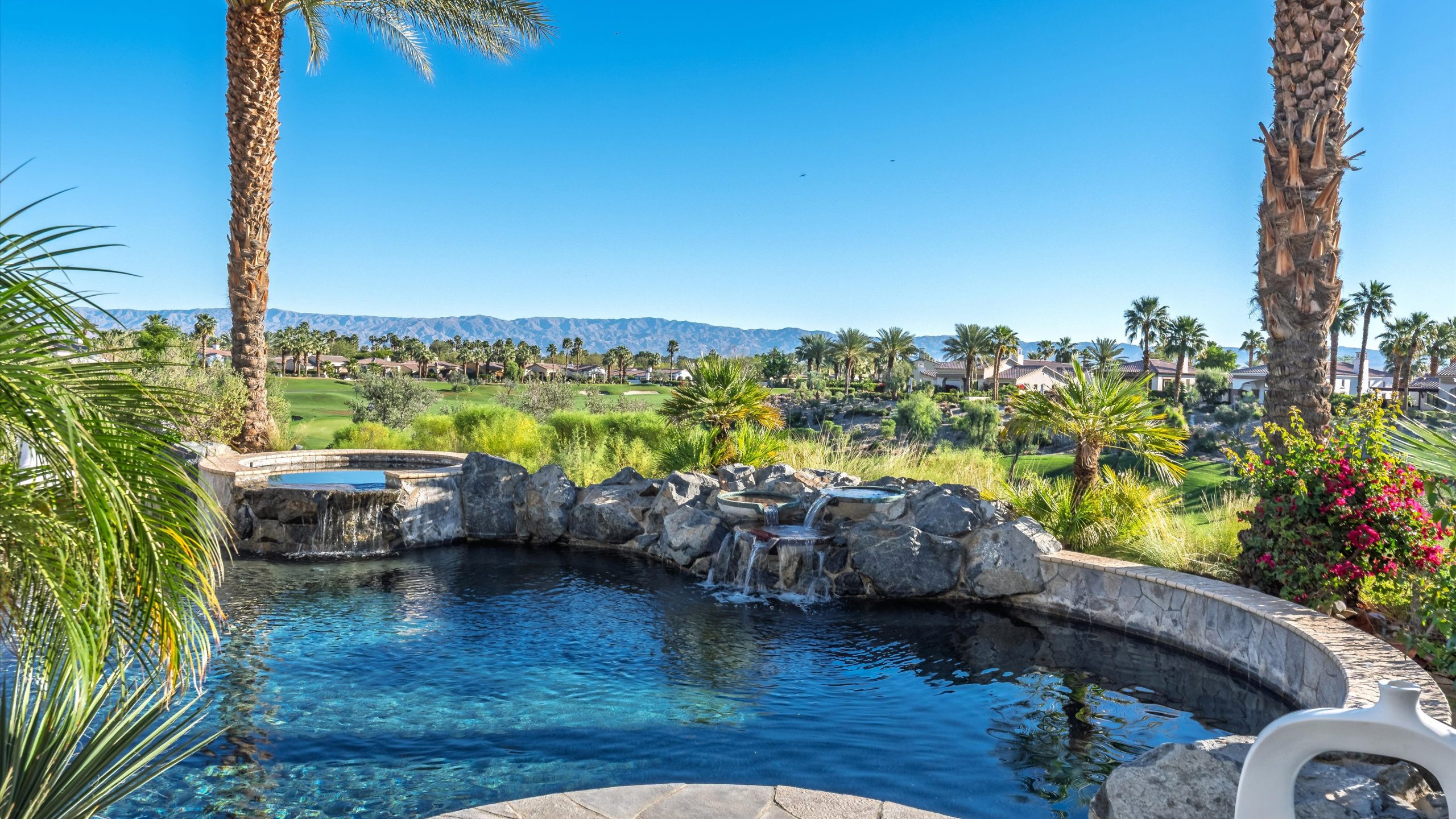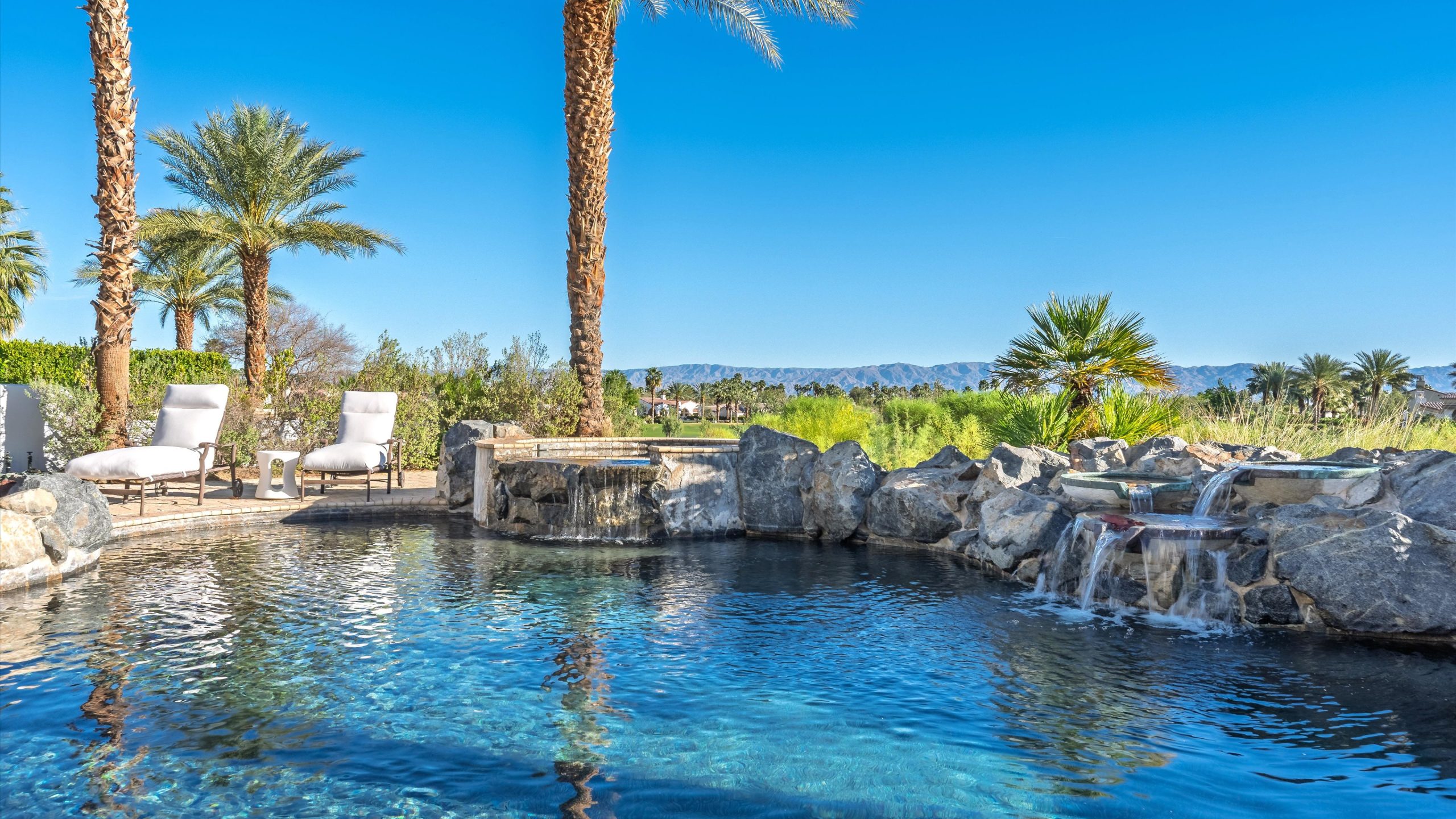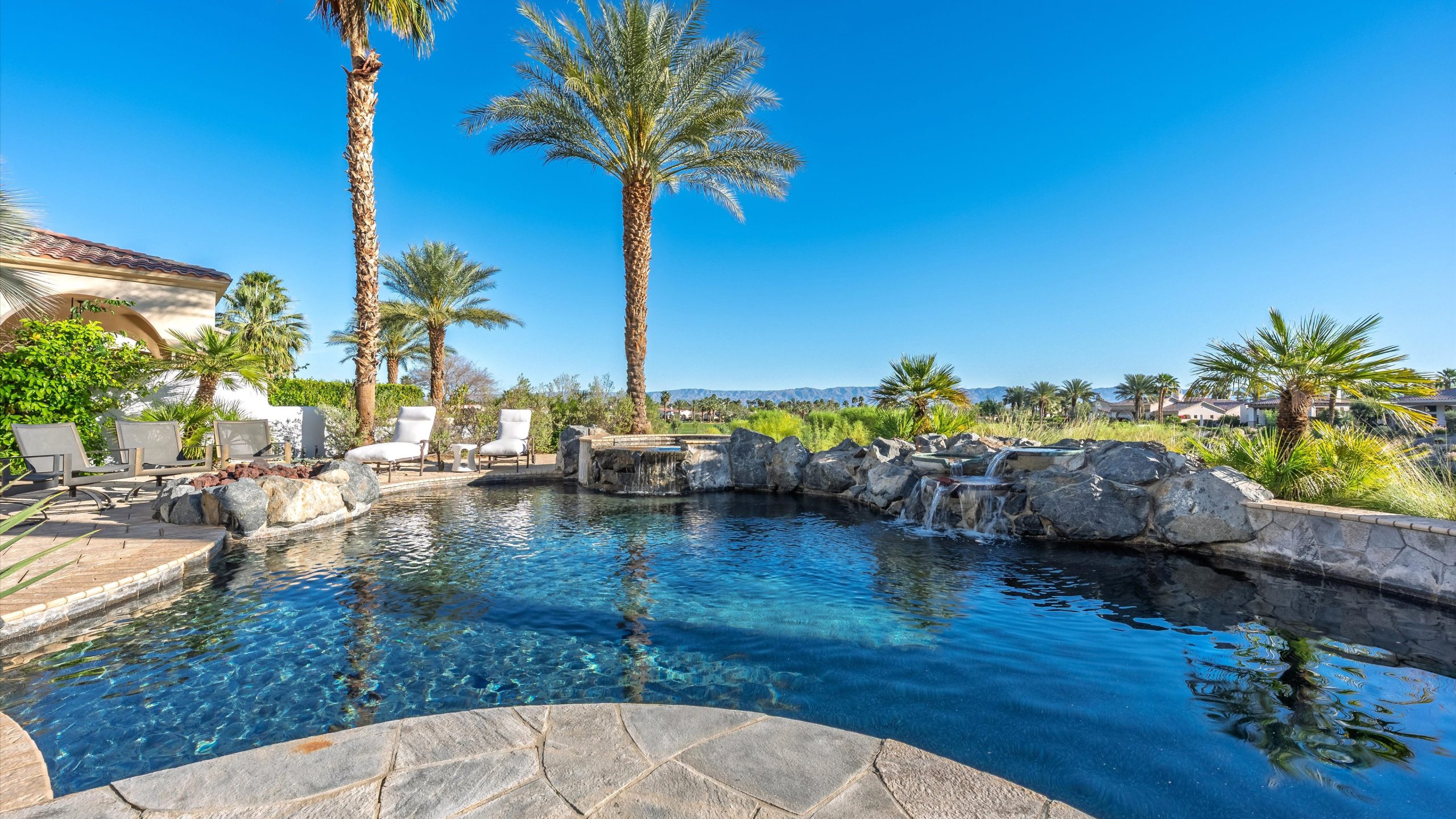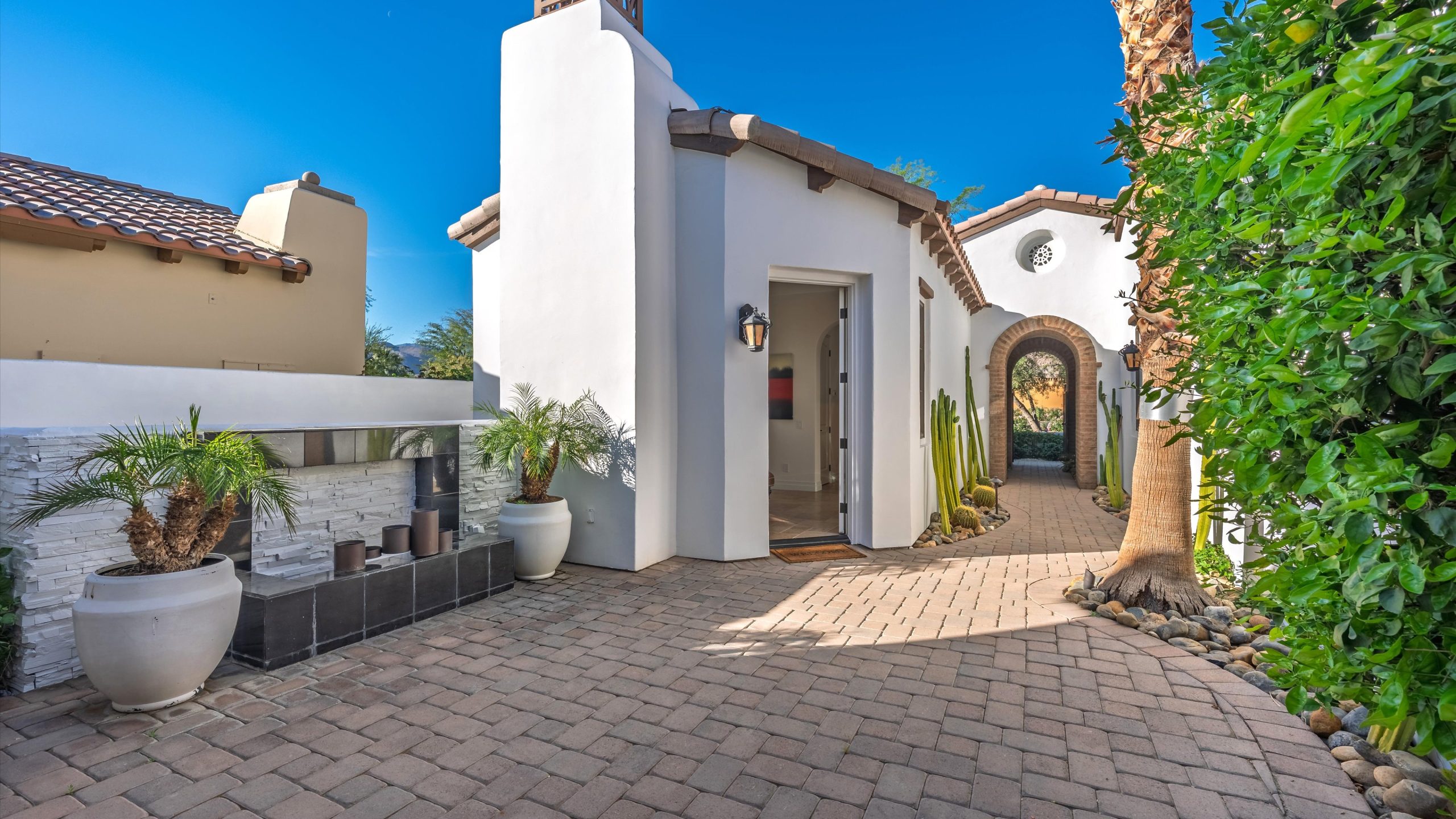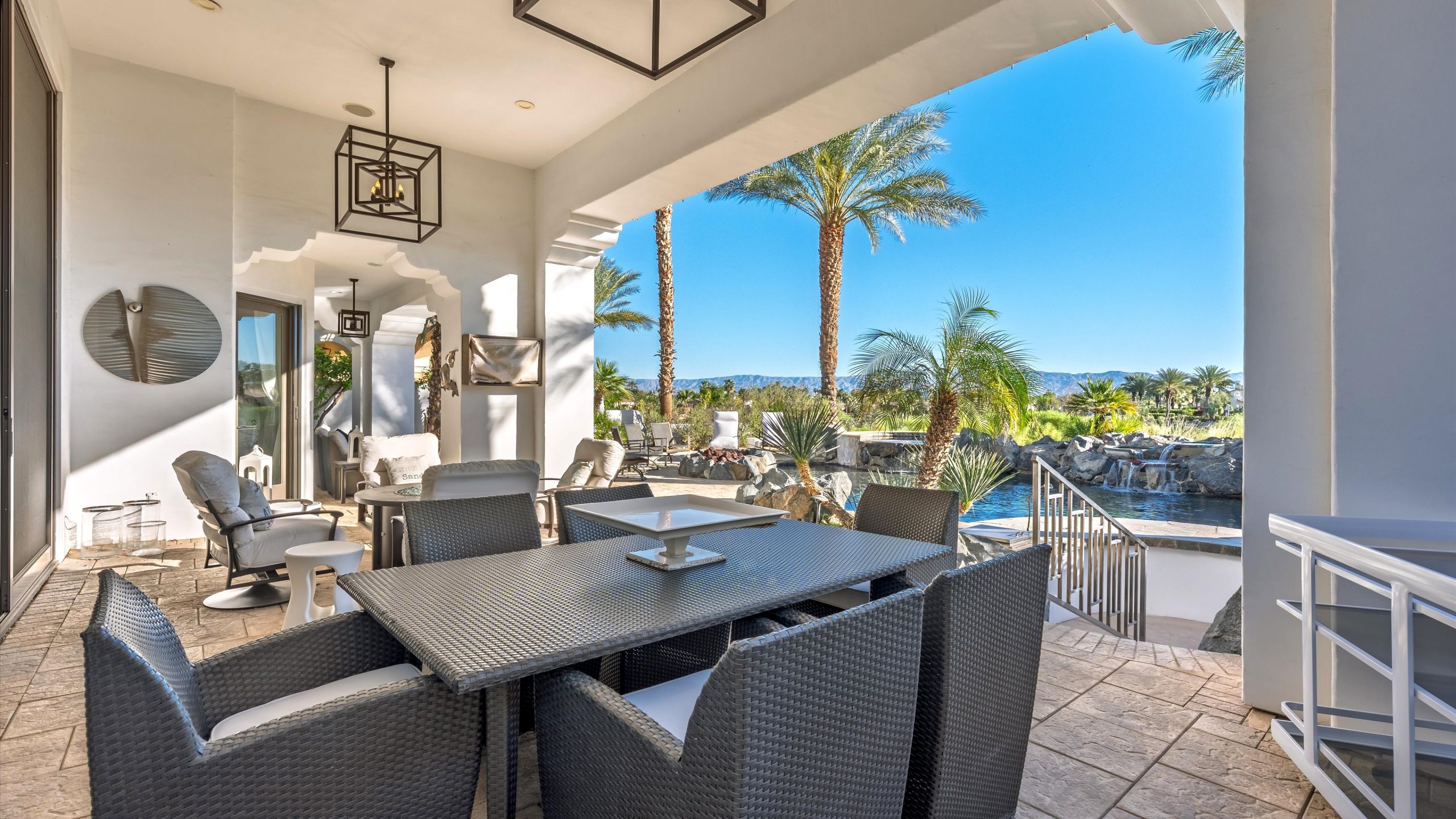 Set within the exclusive Andalusia Country Club, this exceptional 3,701 sq. ft. residence offers privacy, panoramic golf course views, and refined desert living. Designed with bespoke finishes and custom upgrades, the home features travertine flooring throughout and a thoughtfully expanded layout with 3 bedrooms, 4 bathrooms, a dedicated office, and a detached casita. The private casita includes a living area with a fireplace and kitchenette, ideal for guests. A spacious courtyard with a tranquil water feature creates a welcoming entry. Clean architectural lines and curated design elements establish a sense of understated elegance, while the home’s commanding position enhances both the views and the overall sense of exclusivity. Seamless indoor-outdoor integration allows for effortless entertaining, with living spaces that open to sweeping fairway vistas. The resort-style backyard is designed for both relaxation and hosting, featuring a pool with a dramatic rock feature and cascading waterfall, a spa, fire pit, built-in BBQ, and a large covered loggia—creating multiple spaces to gather, unwind, and enjoy the desert setting. Offered furnished, this residence delivers a turnkey opportunity for those seeking a highly customized, desert home. Come live the life you’ve always imagined!