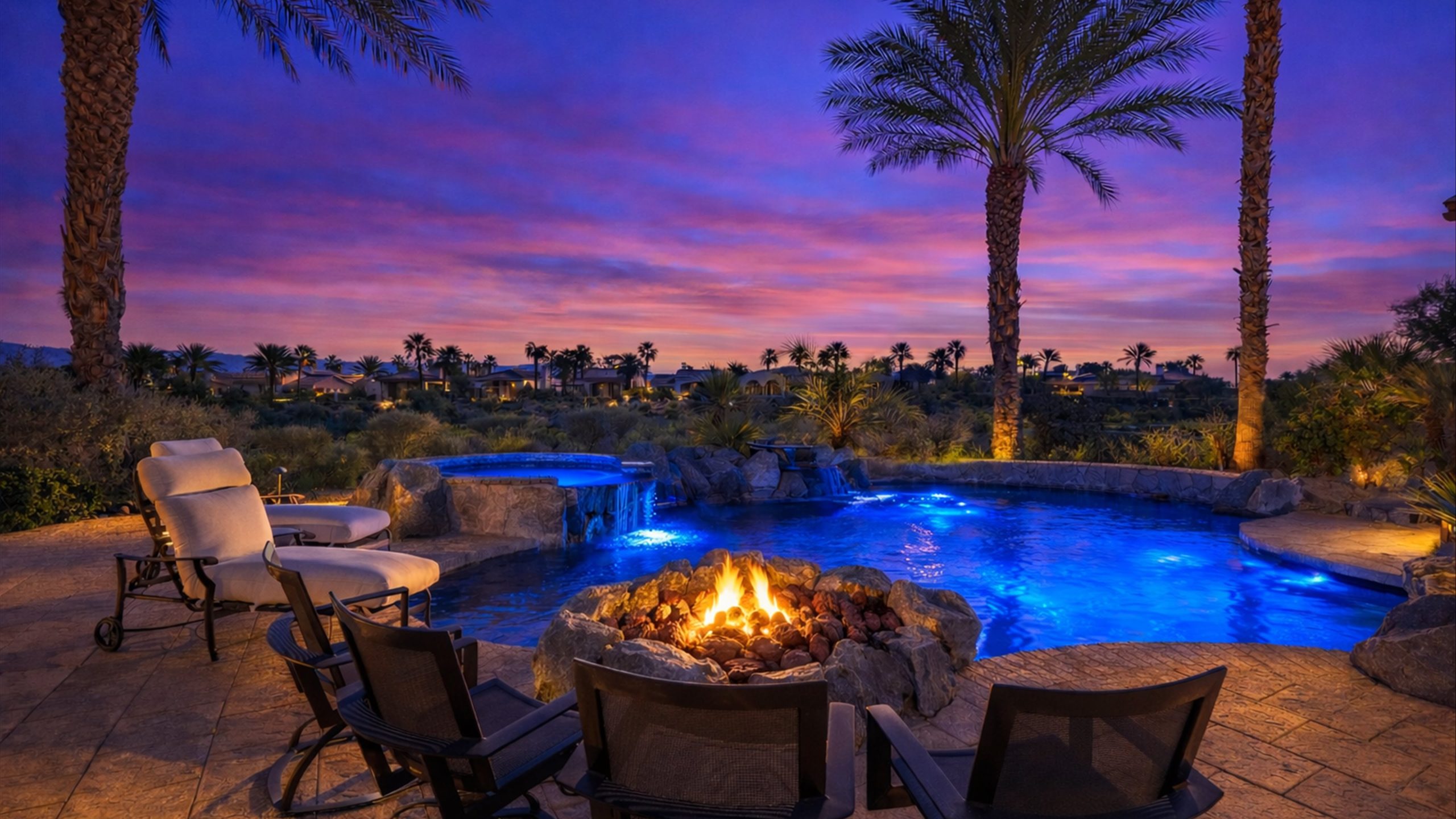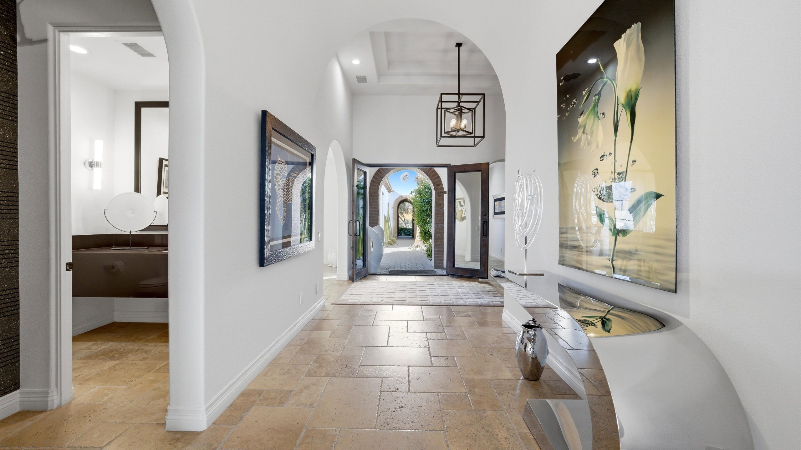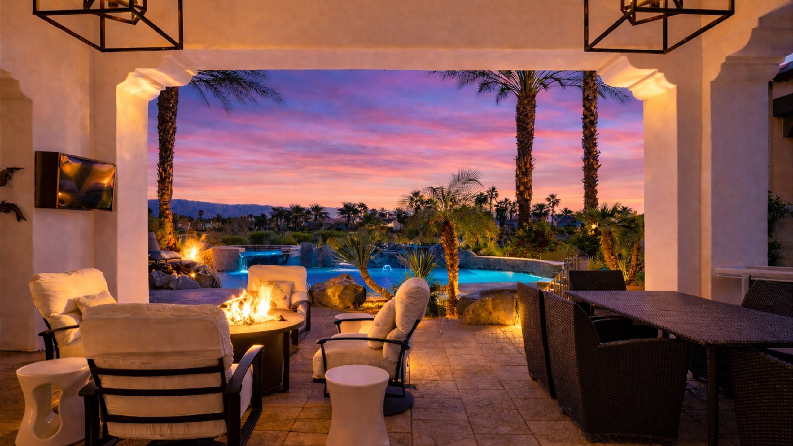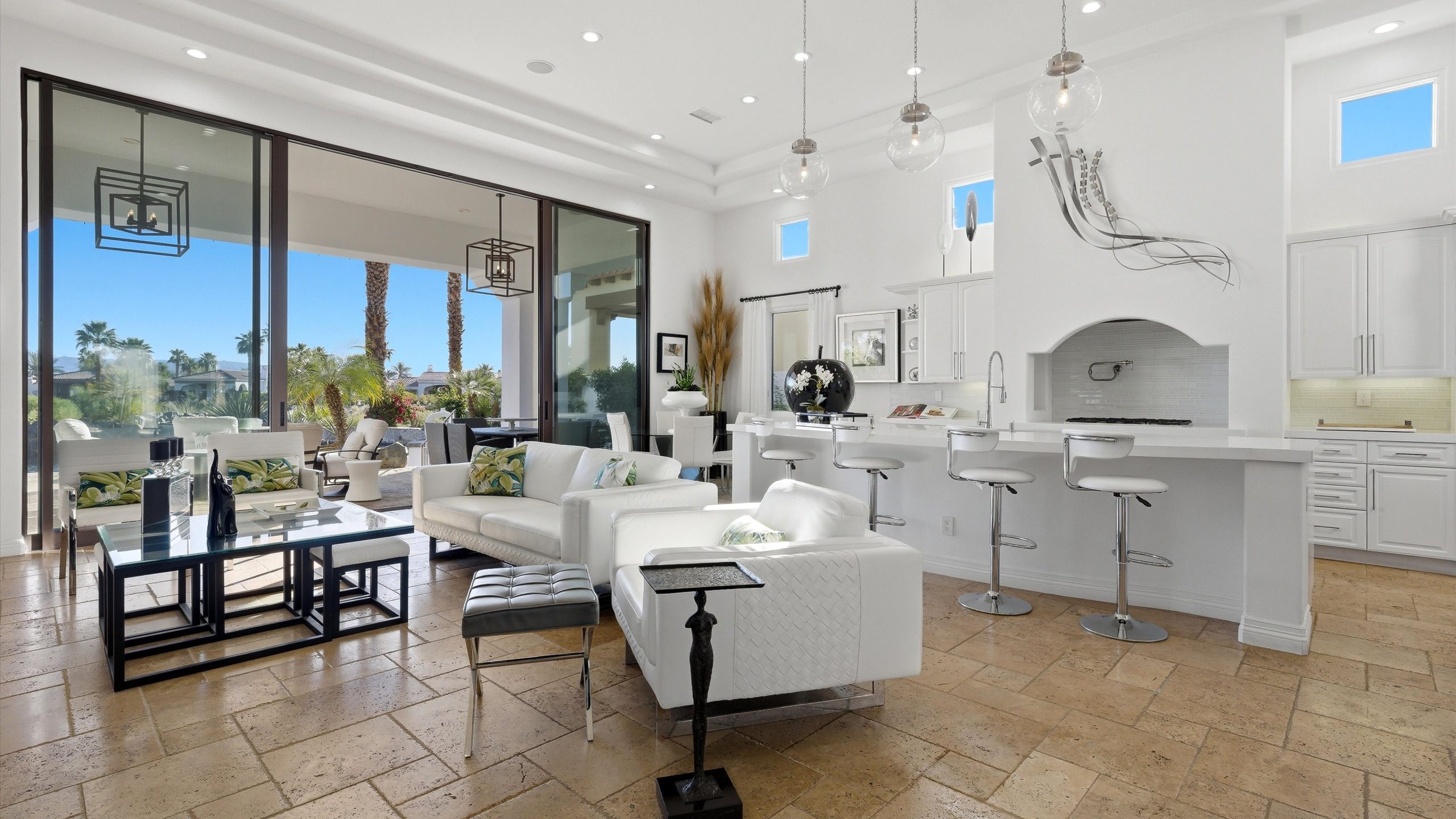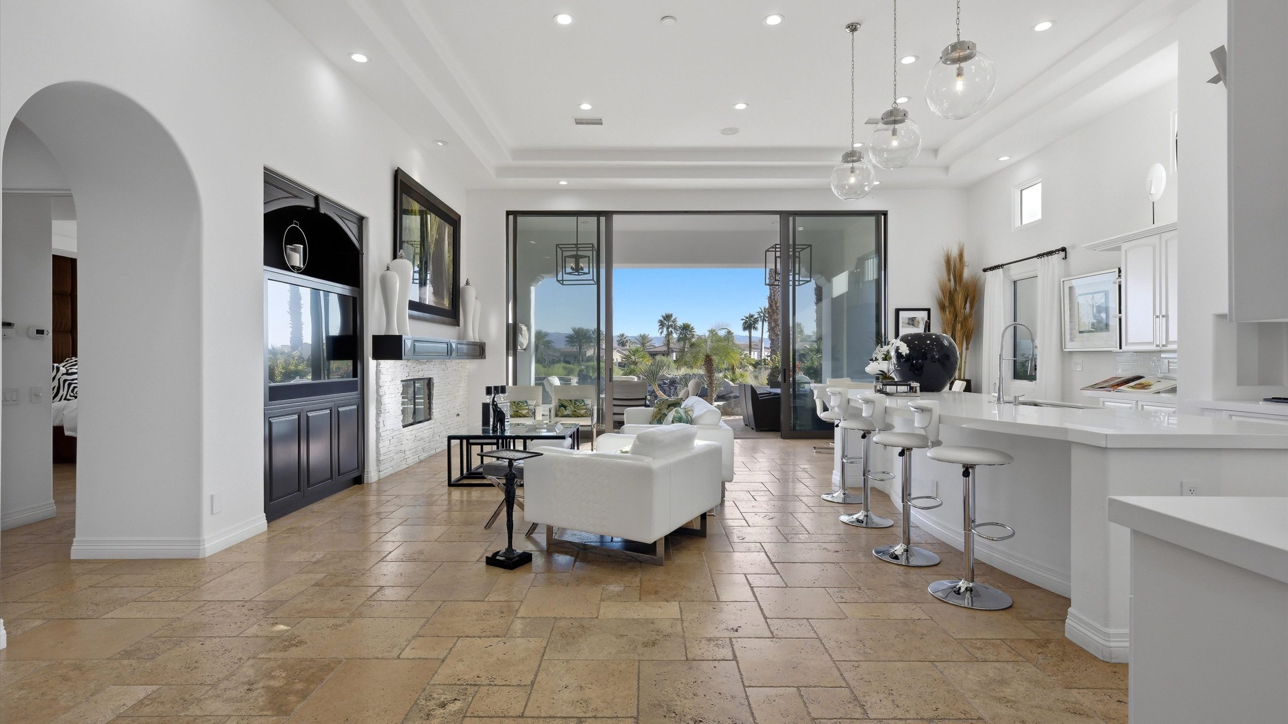 Set within the exclusive Andalusia Country Club, this exceptional 3,701 sq. ft. residence offers privacy, panoramic golf course views, and refined desert living. Designed with bespoke finishes and custom upgrades, the home features travertine flooring throughout and a thoughtfully expanded layout with 3 bedrooms, 4 bathrooms, a dedicated office, and a detached casita. The private casita includes a living area with a fireplace and kitchenette, ideal for guests. A spacious courtyard with a tranquil water feature creates a welcoming entry. Clean architectural lines and curated design elements establish a sense of understated elegance, while the home’s commanding position enhances both the views and the overall sense of exclusivity. Seamless indoor-outdoor integration allows for effortless entertaining, with living spaces that open to sweeping fairway vistas. The resort-style backyard is designed for both relaxation and hosting, featuring a pool with a dramatic rock feature and cascading waterfall, a spa, fire pit, built-in BBQ, and a large covered loggia—creating multiple spaces to gather, unwind, and enjoy the desert setting. Offered furnished, this residence delivers a turnkey opportunity for those seeking a highly customized, desert home. Come live the life you’ve always imagined!