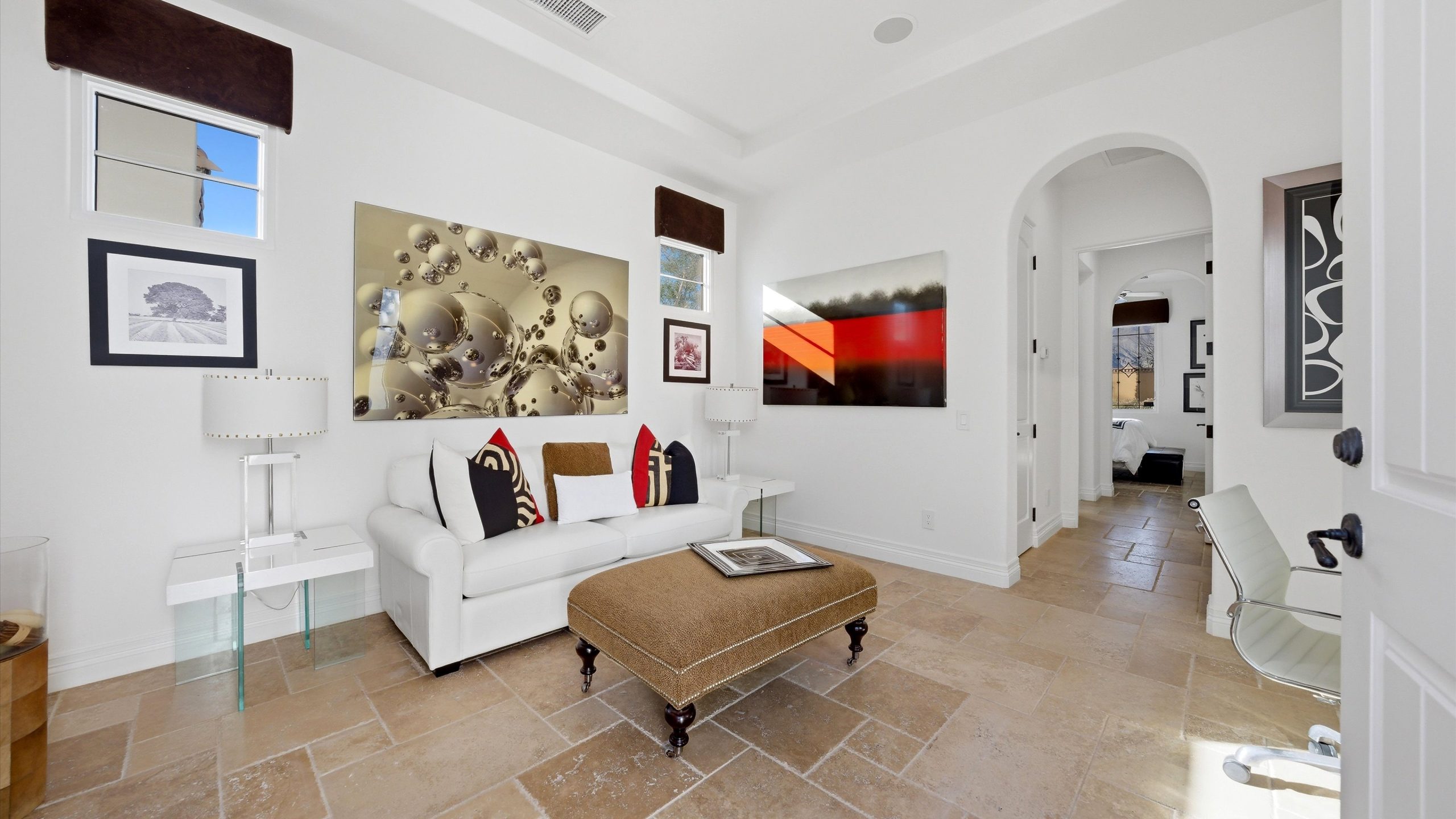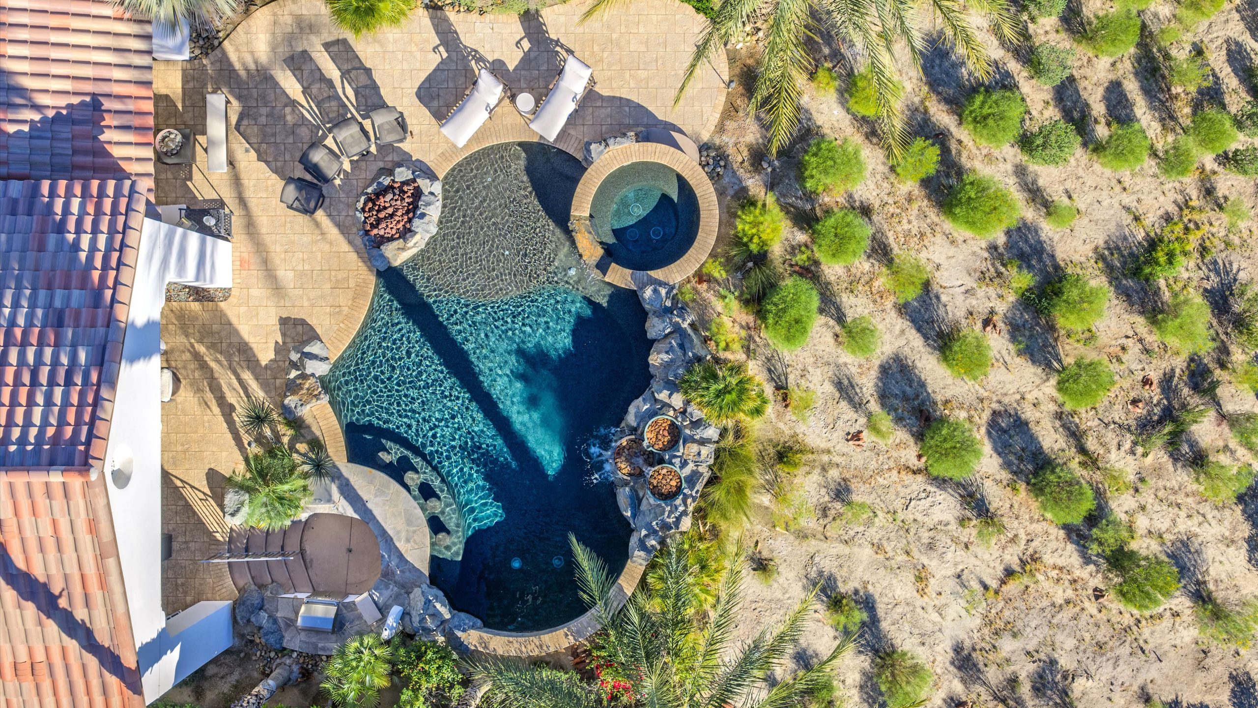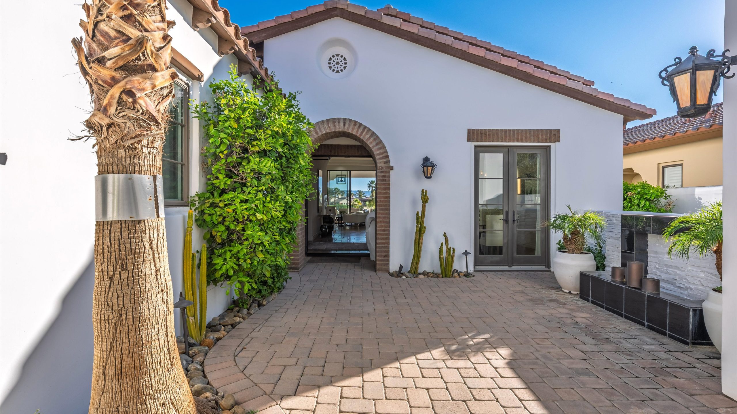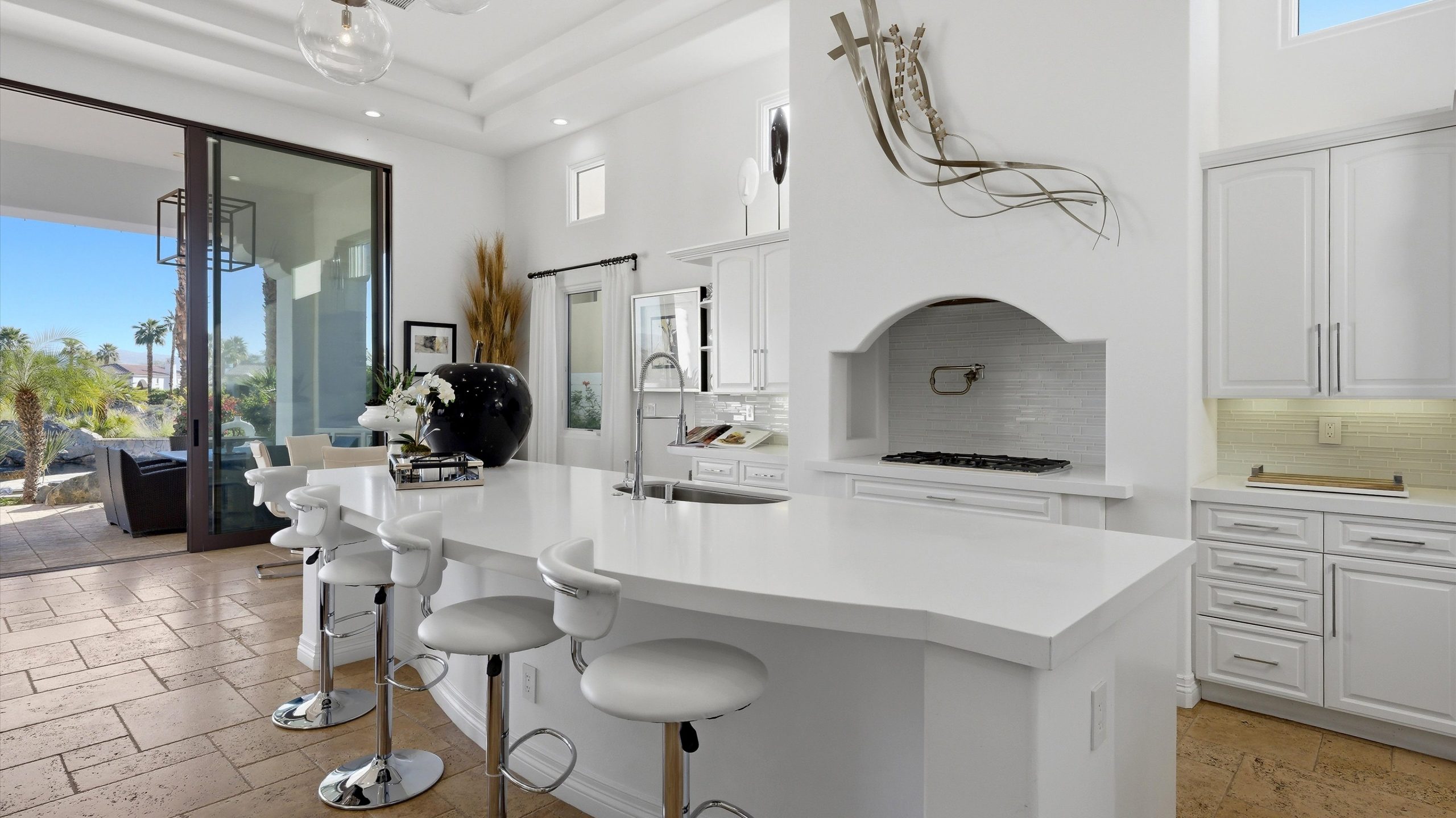 Set within the exclusive Andalusia Country Club, this exceptional 3,701 sq. ft. residence offers privacy, panoramic golf course views, and refined desert living. Designed with bespoke finishes and custom upgrades, the home features travertine flooring throughout and a thoughtfully expanded layout with 3 bedrooms, 4 bathrooms, a dedicated office, and a detached casita. The private casita includes a living area with a fireplace and kitchenette, ideal for guests. A spacious courtyard with a tranquil water feature creates a welcoming entry. Clean architectural lines and curated design elements establish a sense of understated elegance, while the home’s commanding position enhances both the views and the overall sense of exclusivity. Seamless indoor-outdoor integration allows for effortless entertaining, with living spaces that open to sweeping fairway vistas. The resort-style backyard is designed for both relaxation and hosting, featuring a pool with a dramatic rock feature and cascading waterfall, a spa, fire pit, built-in BBQ, and a large covered loggia—creating multiple spaces to gather, unwind, and enjoy the desert setting. Offered furnished, this residence delivers a turnkey opportunity for those seeking a highly customized, desert home. Come live the life you’ve always imagined!