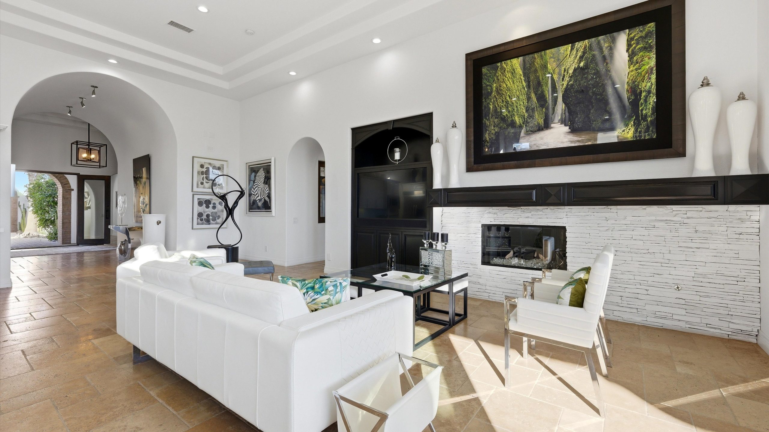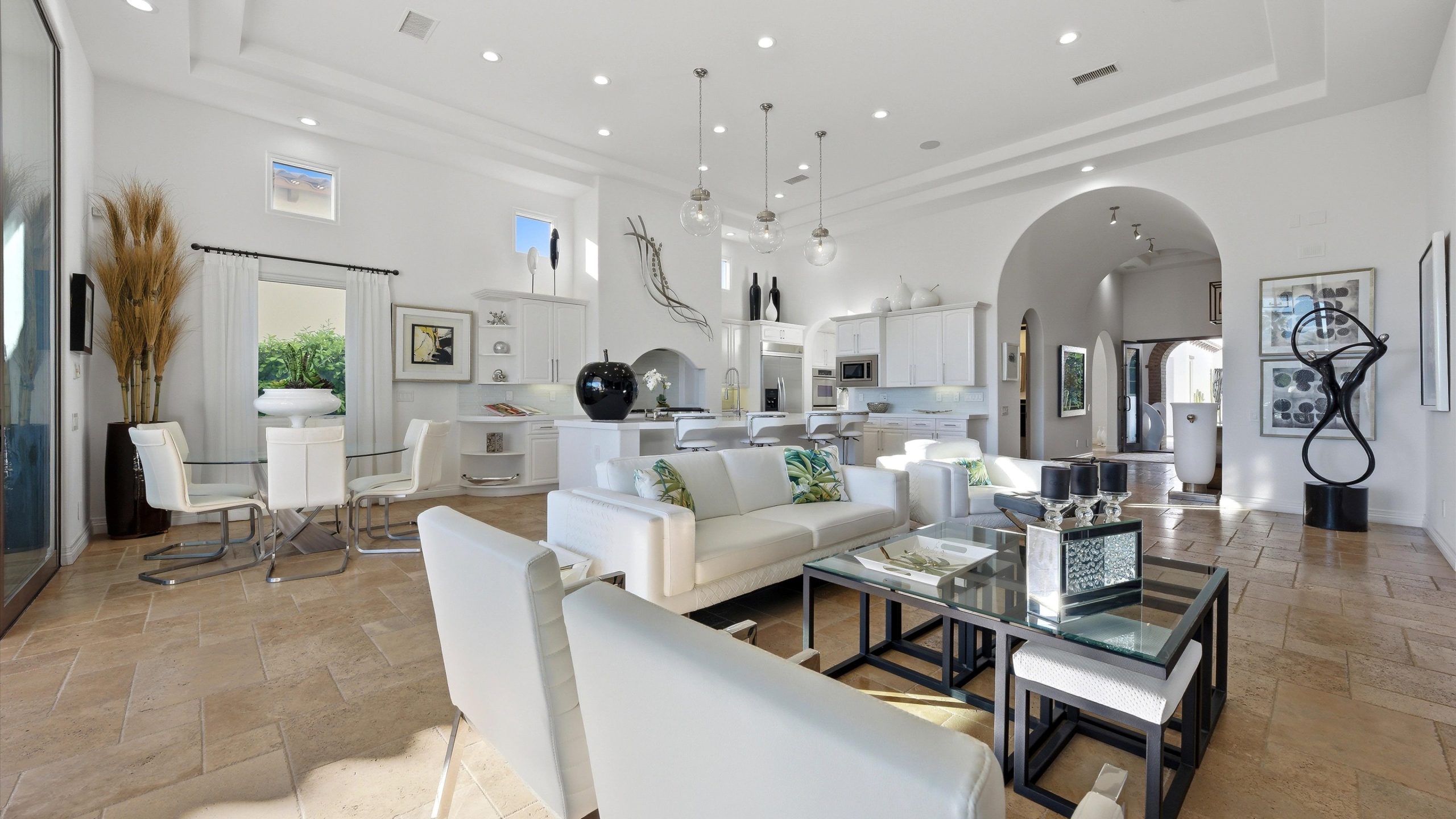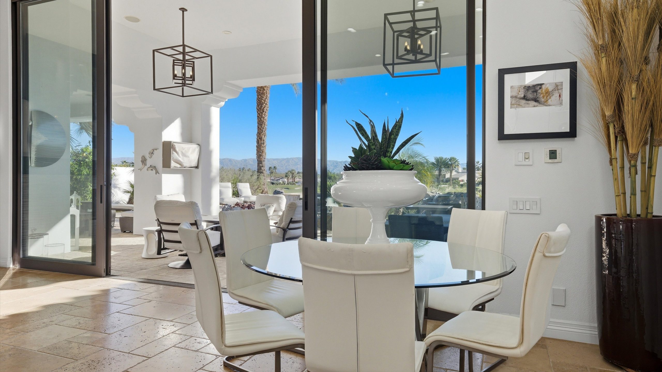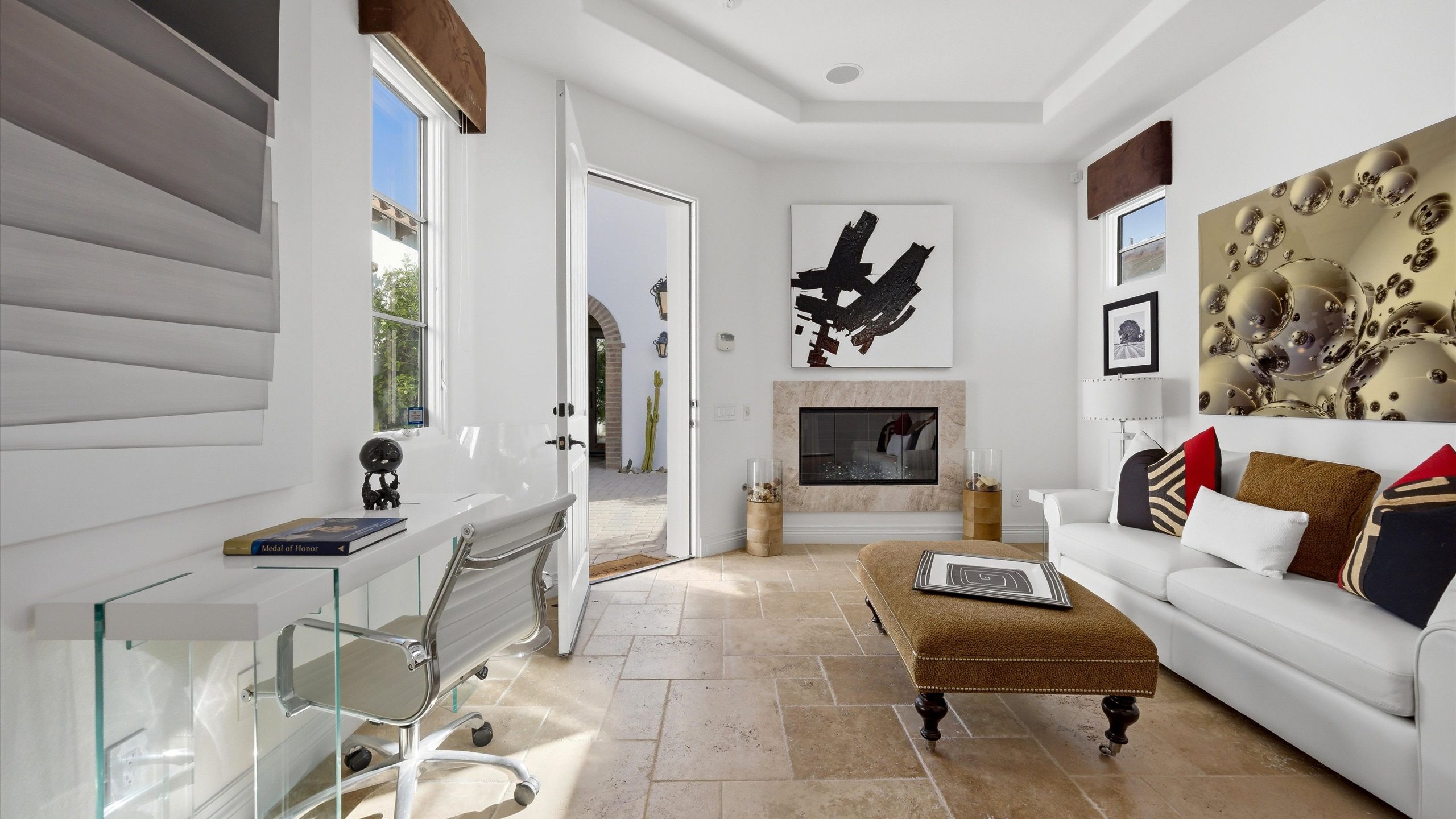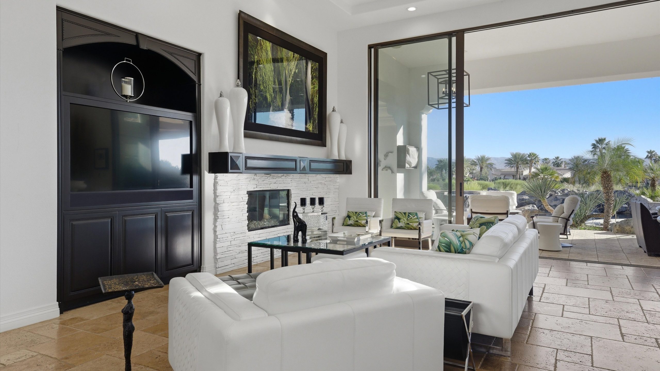 Set within the exclusive Andalusia Country Club, this exceptional 3,701 sq. ft. residence offers privacy, panoramic golf course views, and refined desert living. Designed with bespoke finishes and custom upgrades, the home features travertine flooring throughout and a thoughtfully expanded layout with 3 bedrooms, 4 bathrooms, a dedicated office, and a detached casita. The private casita includes a living area with a fireplace and kitchenette, ideal for guests. A spacious courtyard with a tranquil water feature creates a welcoming entry. Clean architectural lines and curated design elements establish a sense of understated elegance, while the home’s commanding position enhances both the views and the overall sense of exclusivity. Seamless indoor-outdoor integration allows for effortless entertaining, with living spaces that open to sweeping fairway vistas. The resort-style backyard is designed for both relaxation and hosting, featuring a pool with a dramatic rock feature and cascading waterfall, a spa, fire pit, built-in BBQ, and a large covered loggia—creating multiple spaces to gather, unwind, and enjoy the desert setting. Offered furnished, this residence delivers a turnkey opportunity for those seeking a highly customized, desert home. Come live the life you’ve always imagined!