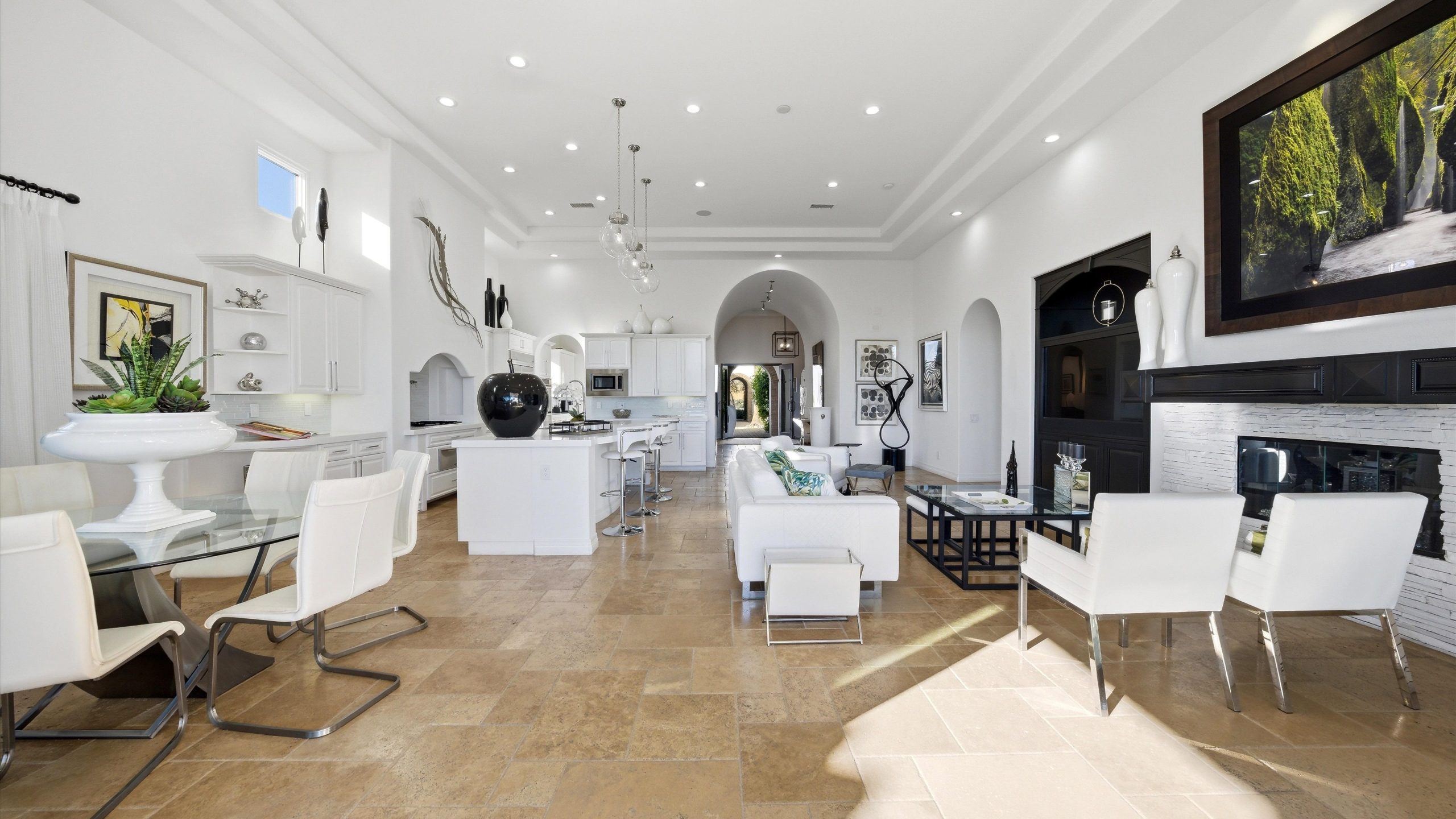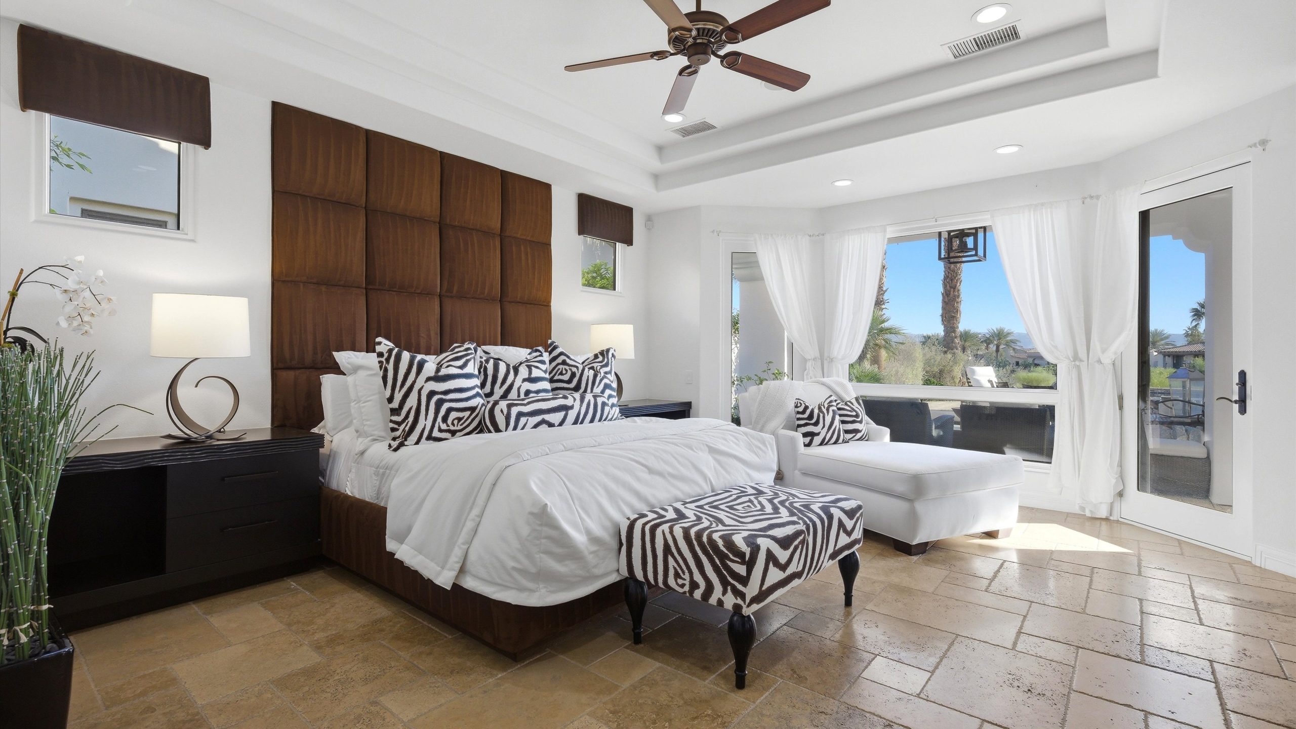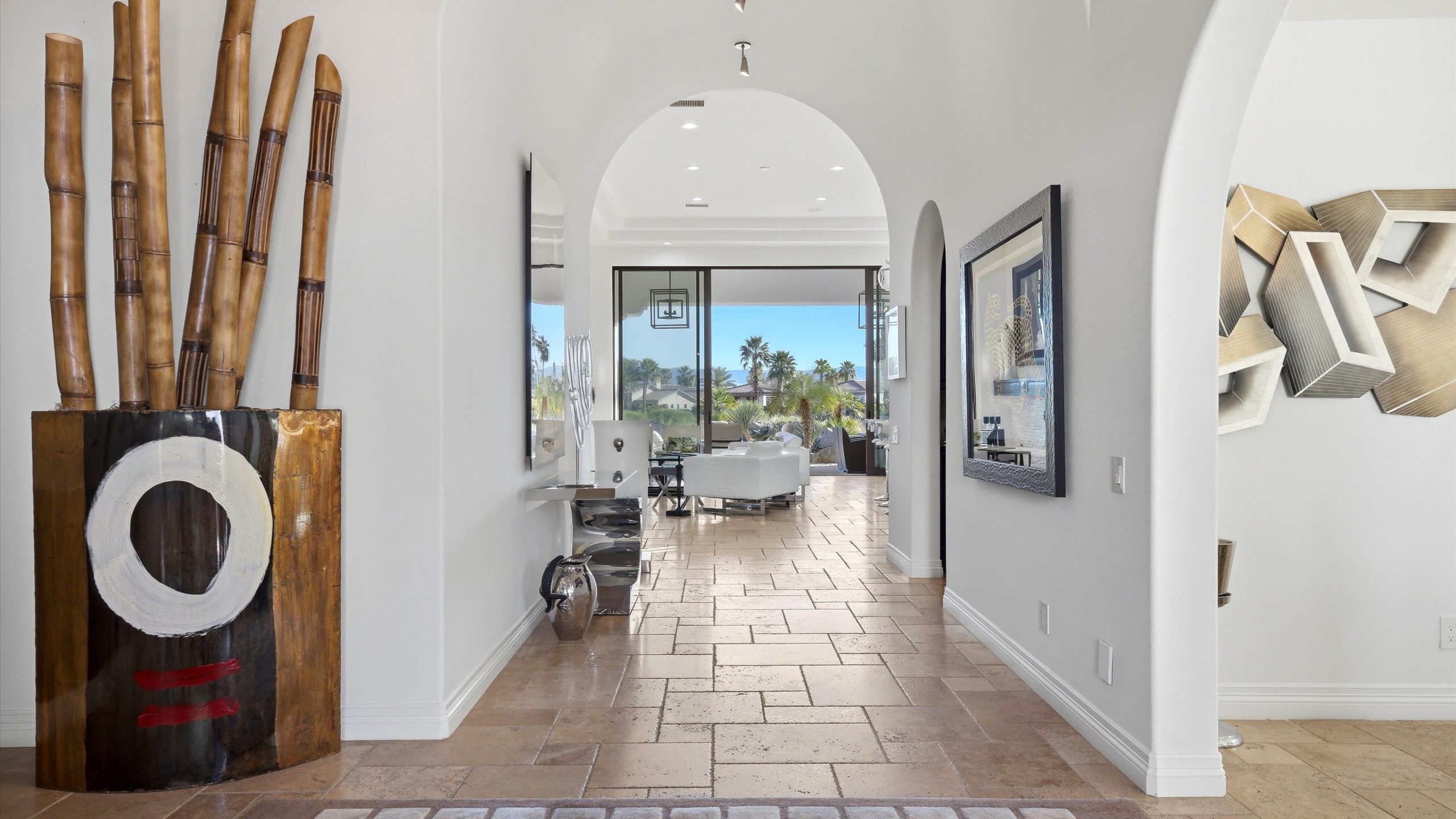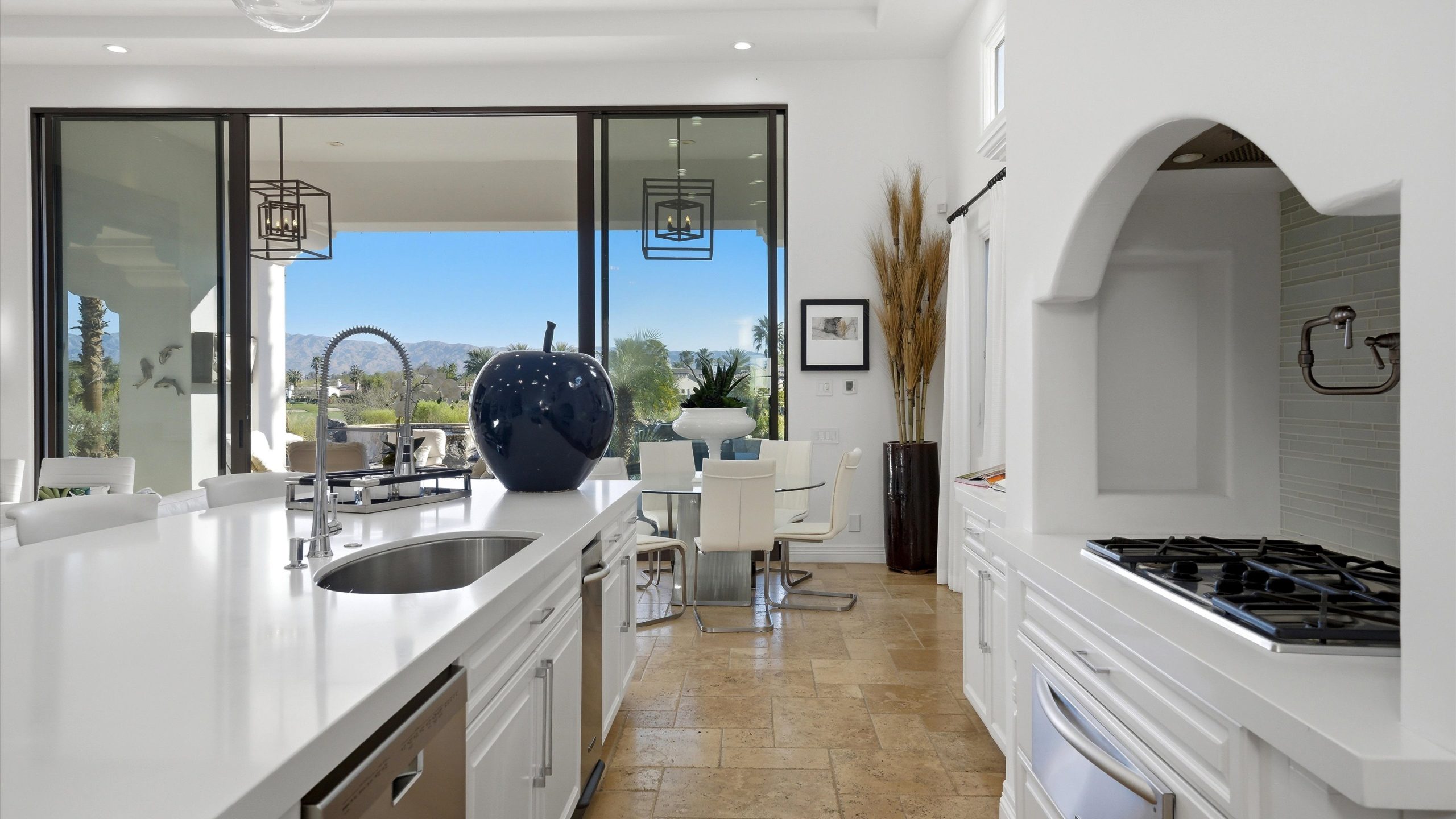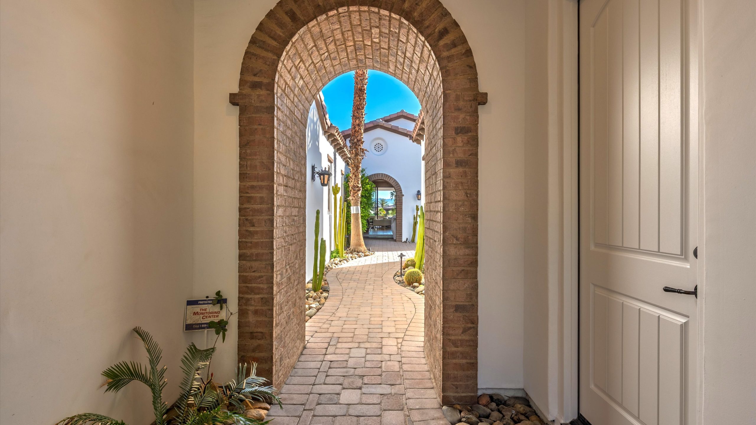 Set within the exclusive Andalusia Country Club, this exceptional 3,701 sq. ft. residence offers privacy, panoramic golf course views, and refined desert living. Designed with bespoke finishes and custom upgrades, the home features travertine flooring throughout and a thoughtfully expanded layout with 3 bedrooms, 4 bathrooms, a dedicated office, and a detached casita. The private casita includes a living area with a fireplace and kitchenette, ideal for guests. A spacious courtyard with a tranquil water feature creates a welcoming entry. Clean architectural lines and curated design elements establish a sense of understated elegance, while the home’s commanding position enhances both the views and the overall sense of exclusivity. Seamless indoor-outdoor integration allows for effortless entertaining, with living spaces that open to sweeping fairway vistas. The resort-style backyard is designed for both relaxation and hosting, featuring a pool with a dramatic rock feature and cascading waterfall, a spa, fire pit, built-in BBQ, and a large covered loggia—creating multiple spaces to gather, unwind, and enjoy the desert setting. Offered furnished, this residence delivers a turnkey opportunity for those seeking a highly customized, desert home. Come live the life you’ve always imagined!