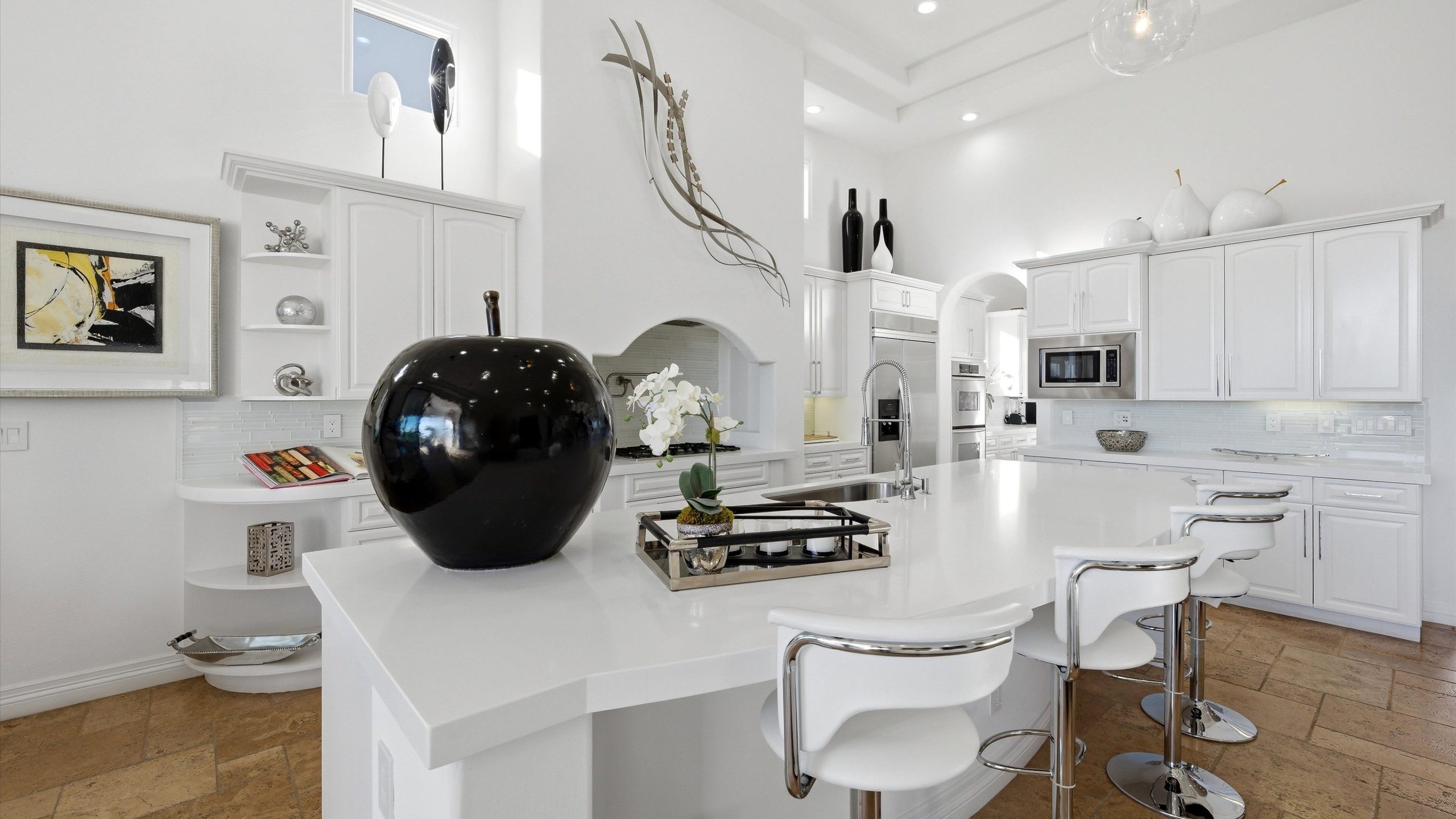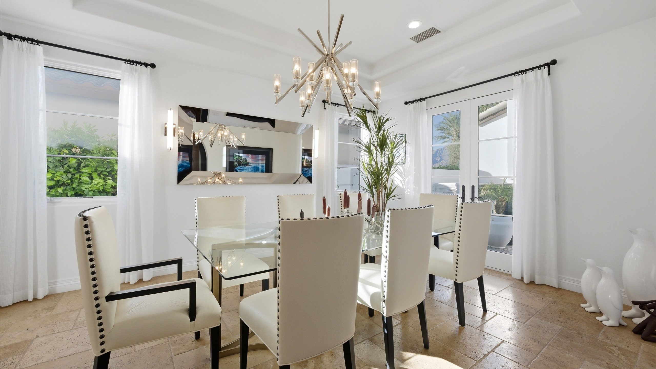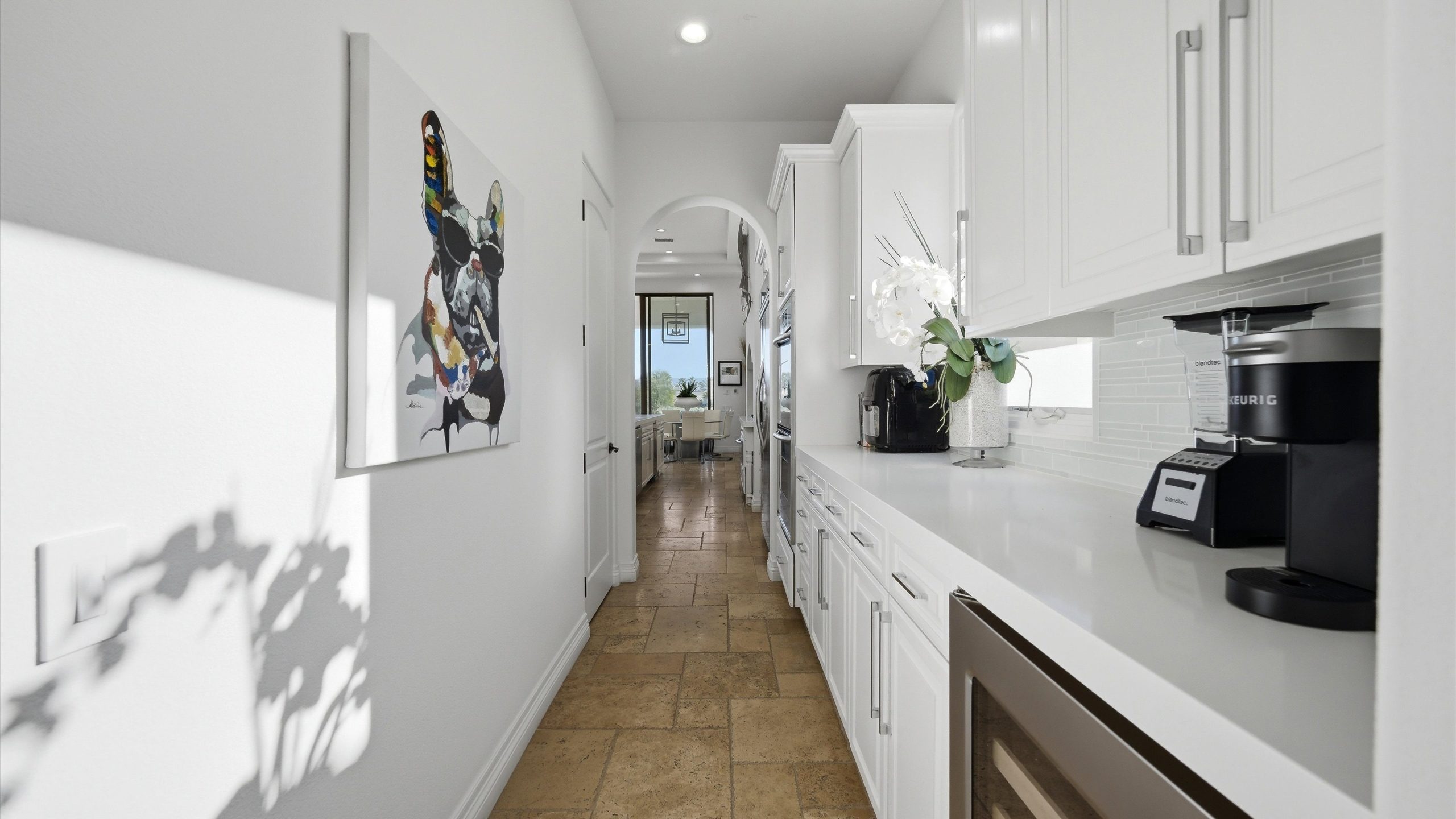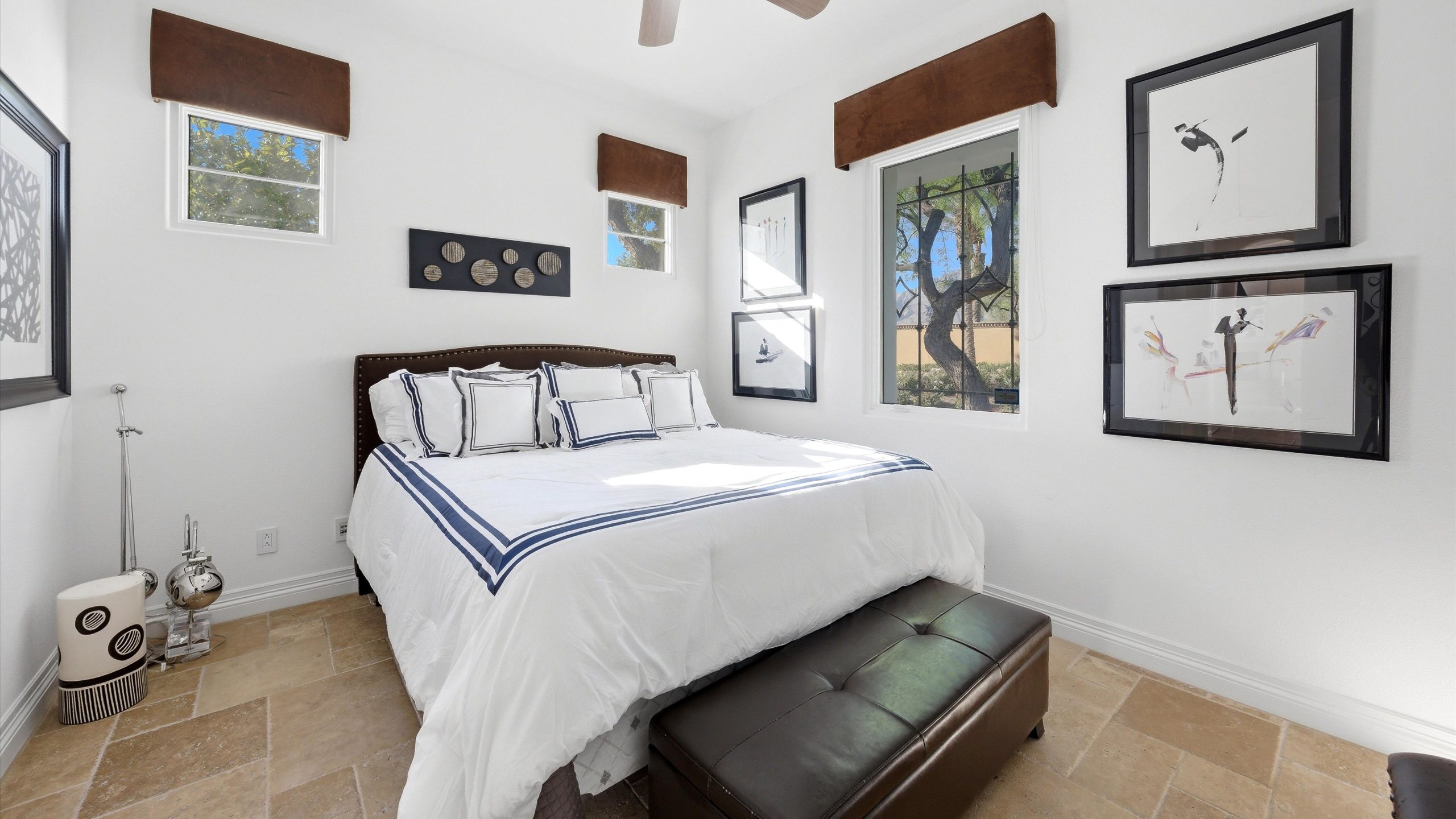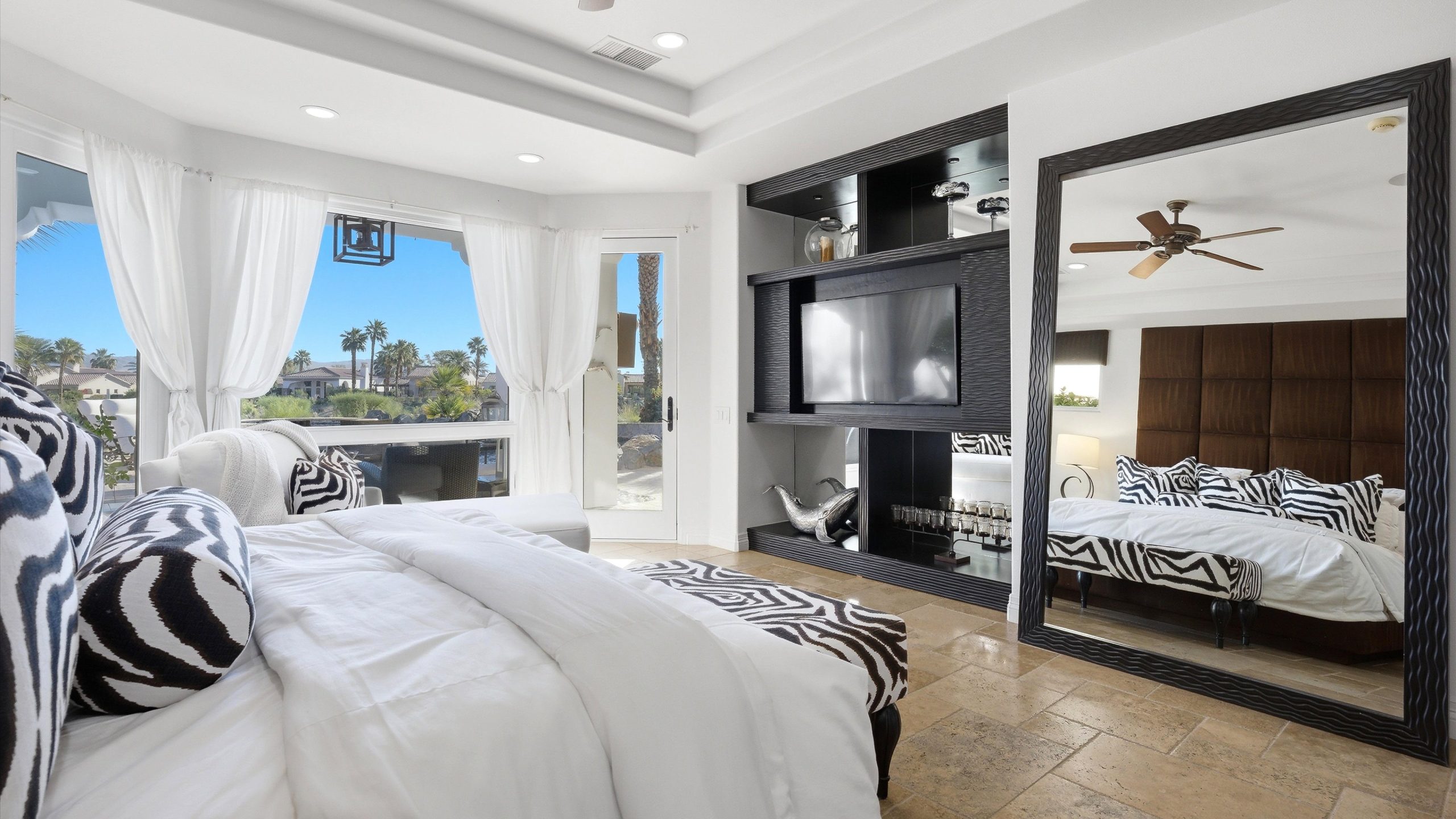 Set within the exclusive Andalusia Country Club, this exceptional 3,701 sq. ft. residence offers privacy, panoramic golf course views, and refined desert living. Designed with bespoke finishes and custom upgrades, the home features travertine flooring throughout and a thoughtfully expanded layout with 3 bedrooms, 4 bathrooms, a dedicated office, and a detached casita. The private casita includes a living area with a fireplace and kitchenette, ideal for guests. A spacious courtyard with a tranquil water feature creates a welcoming entry. Clean architectural lines and curated design elements establish a sense of understated elegance, while the home’s commanding position enhances both the views and the overall sense of exclusivity. Seamless indoor-outdoor integration allows for effortless entertaining, with living spaces that open to sweeping fairway vistas. The resort-style backyard is designed for both relaxation and hosting, featuring a pool with a dramatic rock feature and cascading waterfall, a spa, fire pit, built-in BBQ, and a large covered loggia—creating multiple spaces to gather, unwind, and enjoy the desert setting. Offered furnished, this residence delivers a turnkey opportunity for those seeking a highly customized, desert home. Come live the life you’ve always imagined!