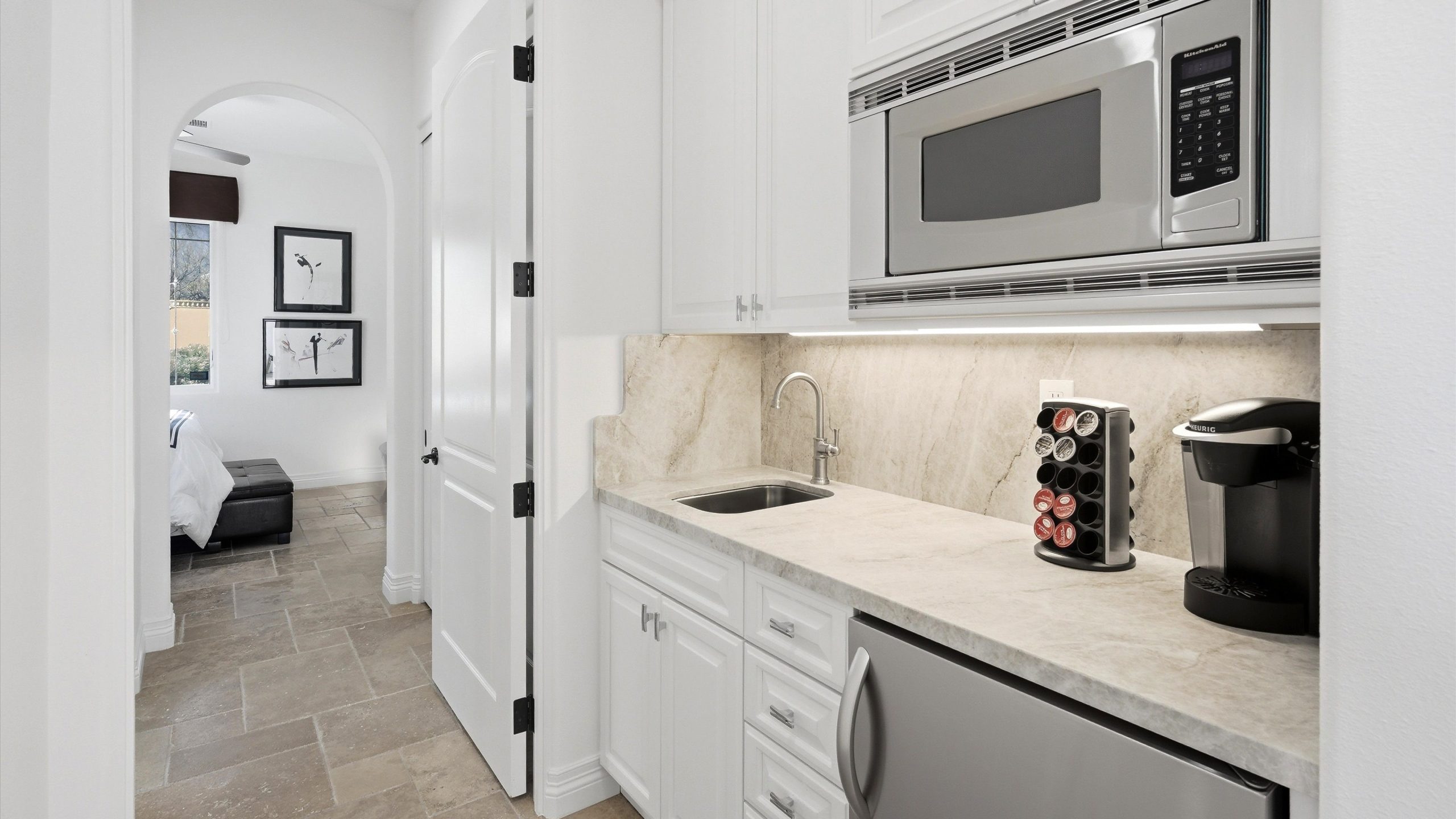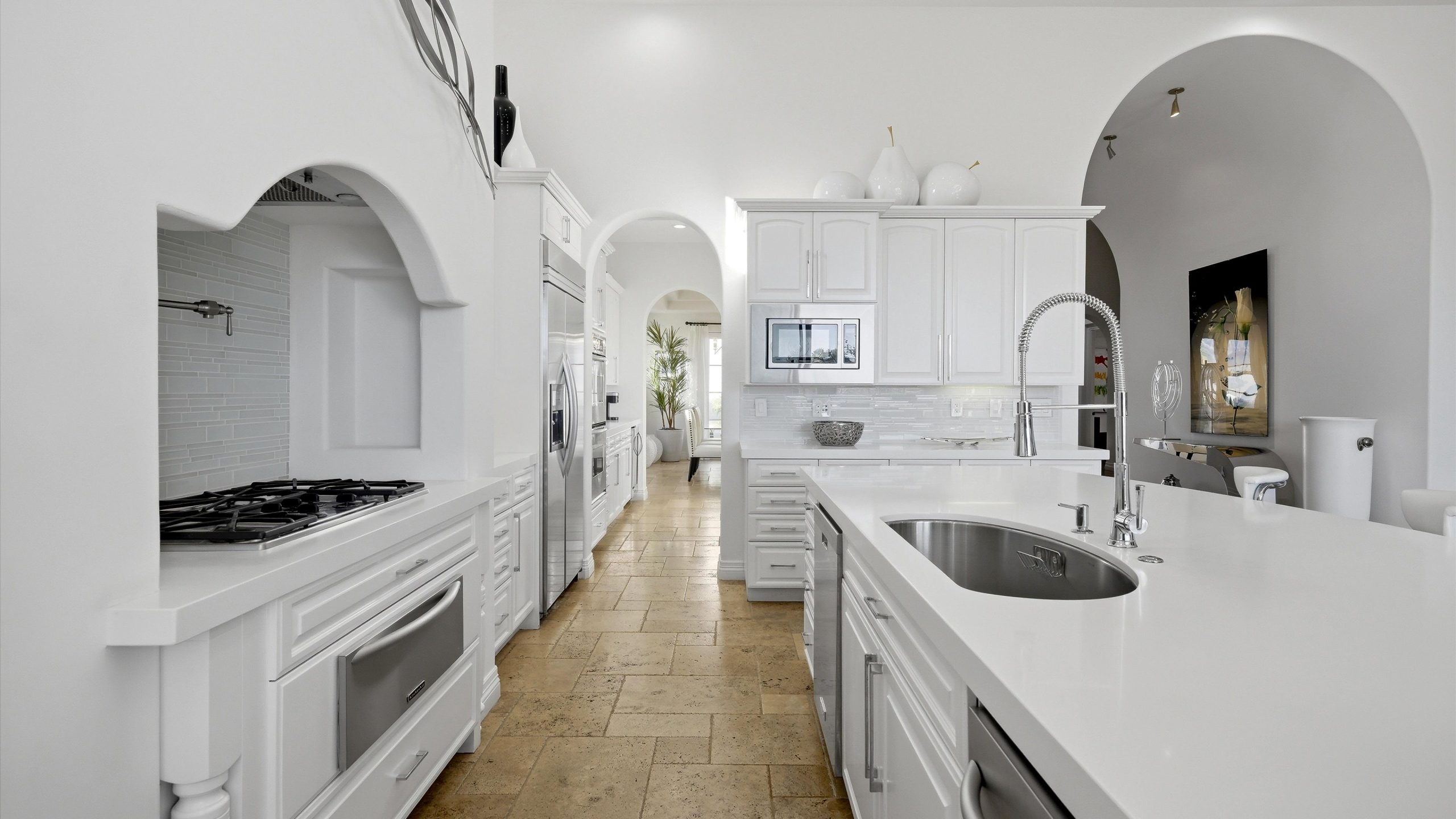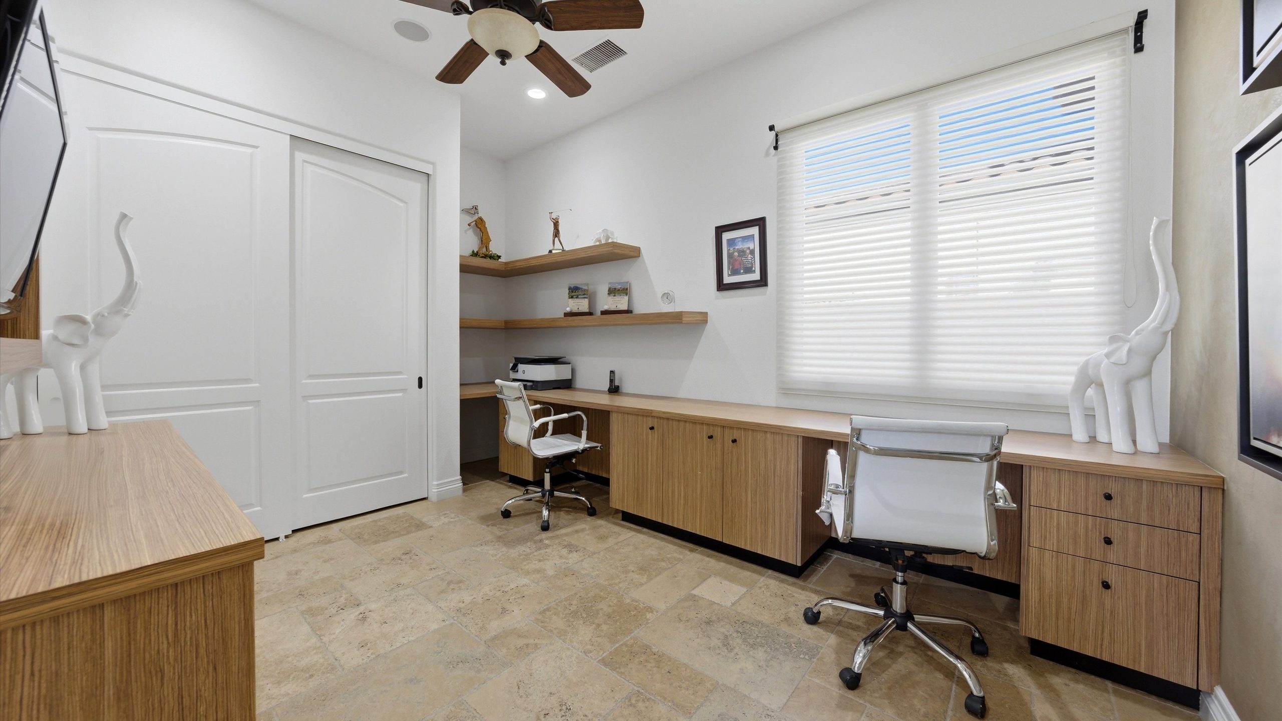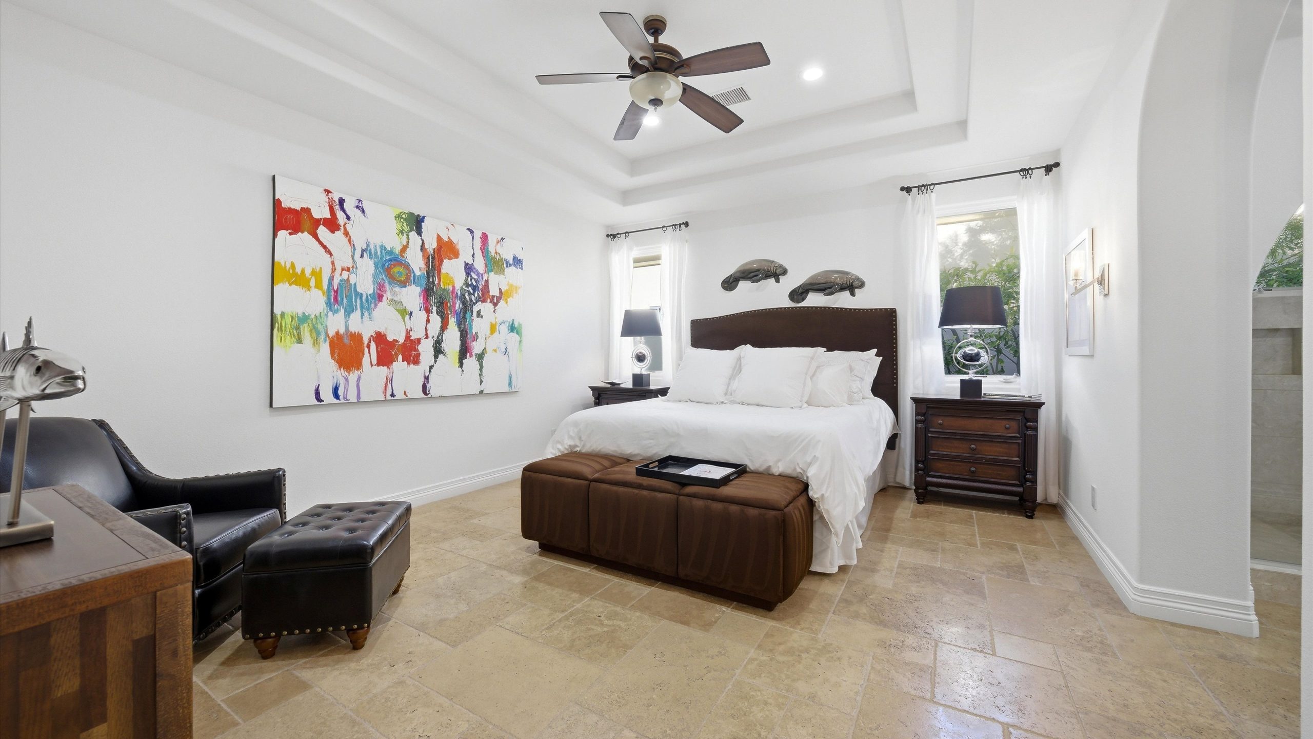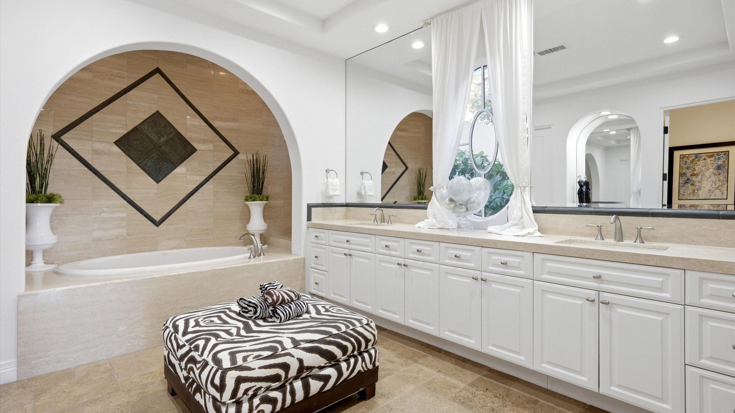Set within the exclusive Andalusia Country Club, this exceptional 3,701 sq. ft. residence offers privacy, panoramic golf course views, and refined desert living. Designed with bespoke finishes and custom upgrades, the home features travertine flooring throughout and a thoughtfully expanded layout with 3 bedrooms, 4 bathrooms, a dedicated office, and a detached casita. The private casita includes a living area with a fireplace and kitchenette, ideal for guests. A spacious courtyard with a tranquil water feature creates a welcoming entry. Clean architectural lines and curated design elements establish a sense of understated elegance, while the home’s commanding position enhances both the views and the overall sense of exclusivity. Seamless indoor-outdoor integration allows for effortless entertaining, with living spaces that open to sweeping fairway vistas. The resort-style backyard is designed for both relaxation and hosting, featuring a pool with a dramatic rock feature and cascading waterfall, a spa, fire pit, built-in BBQ, and a large covered loggia—creating multiple spaces to gather, unwind, and enjoy the desert setting. Offered furnished, this residence delivers a turnkey opportunity for those seeking a highly customized, desert home. Come live the life you’ve always imagined!