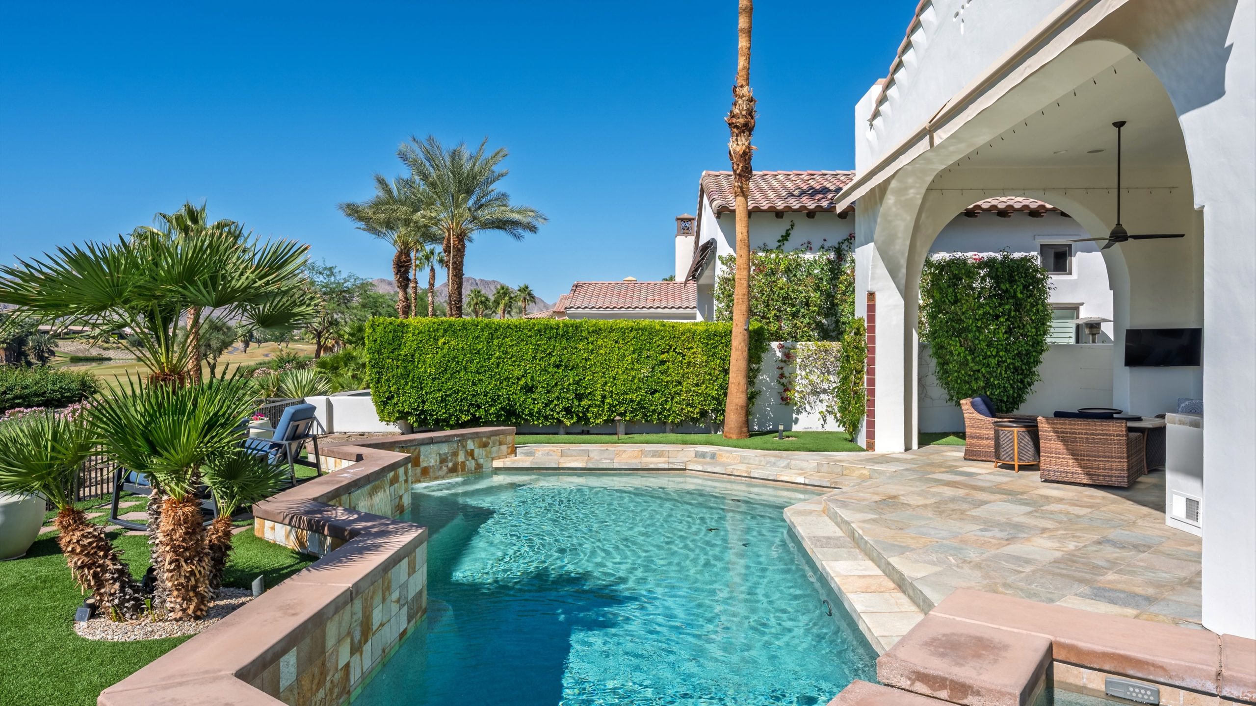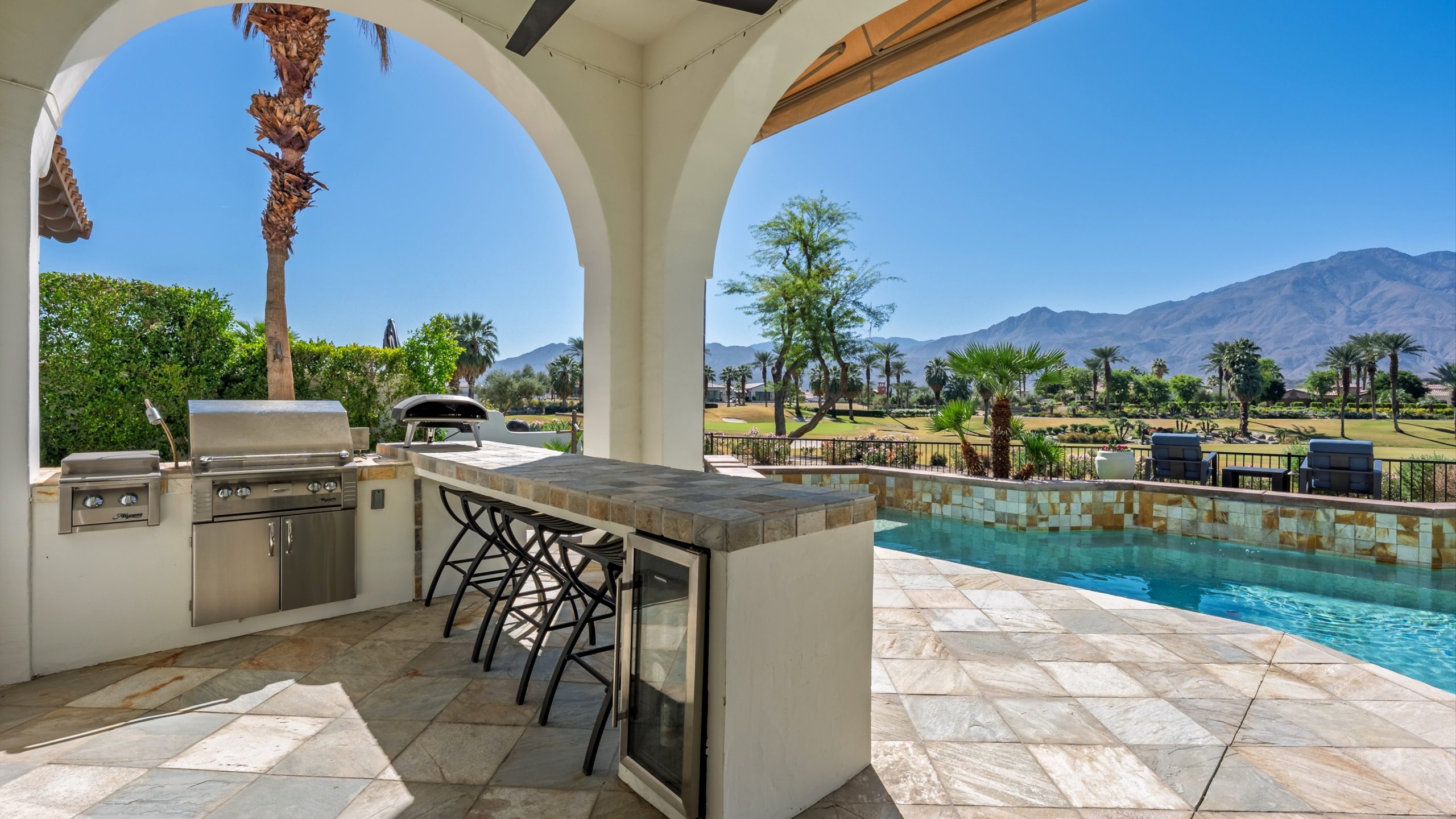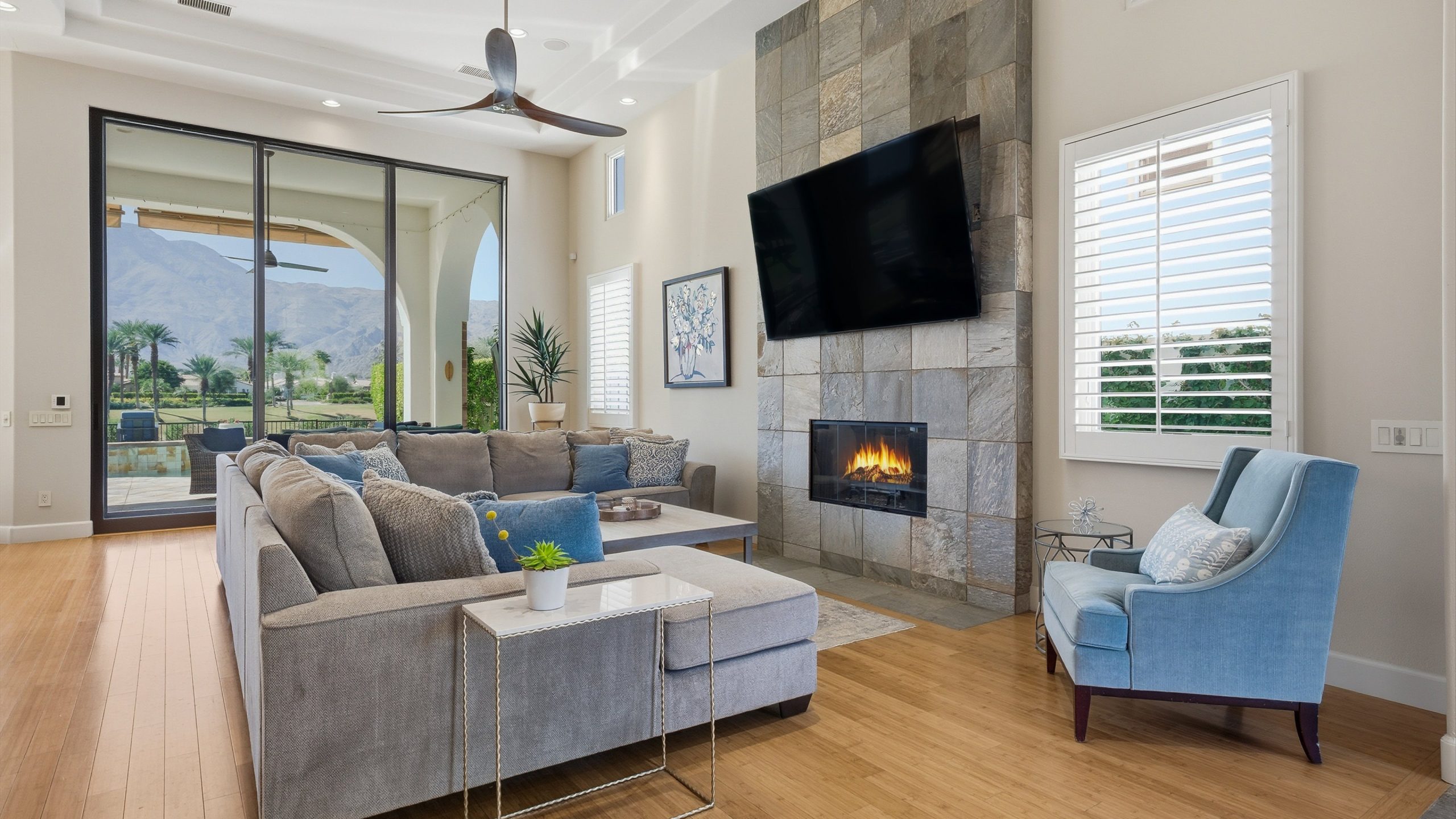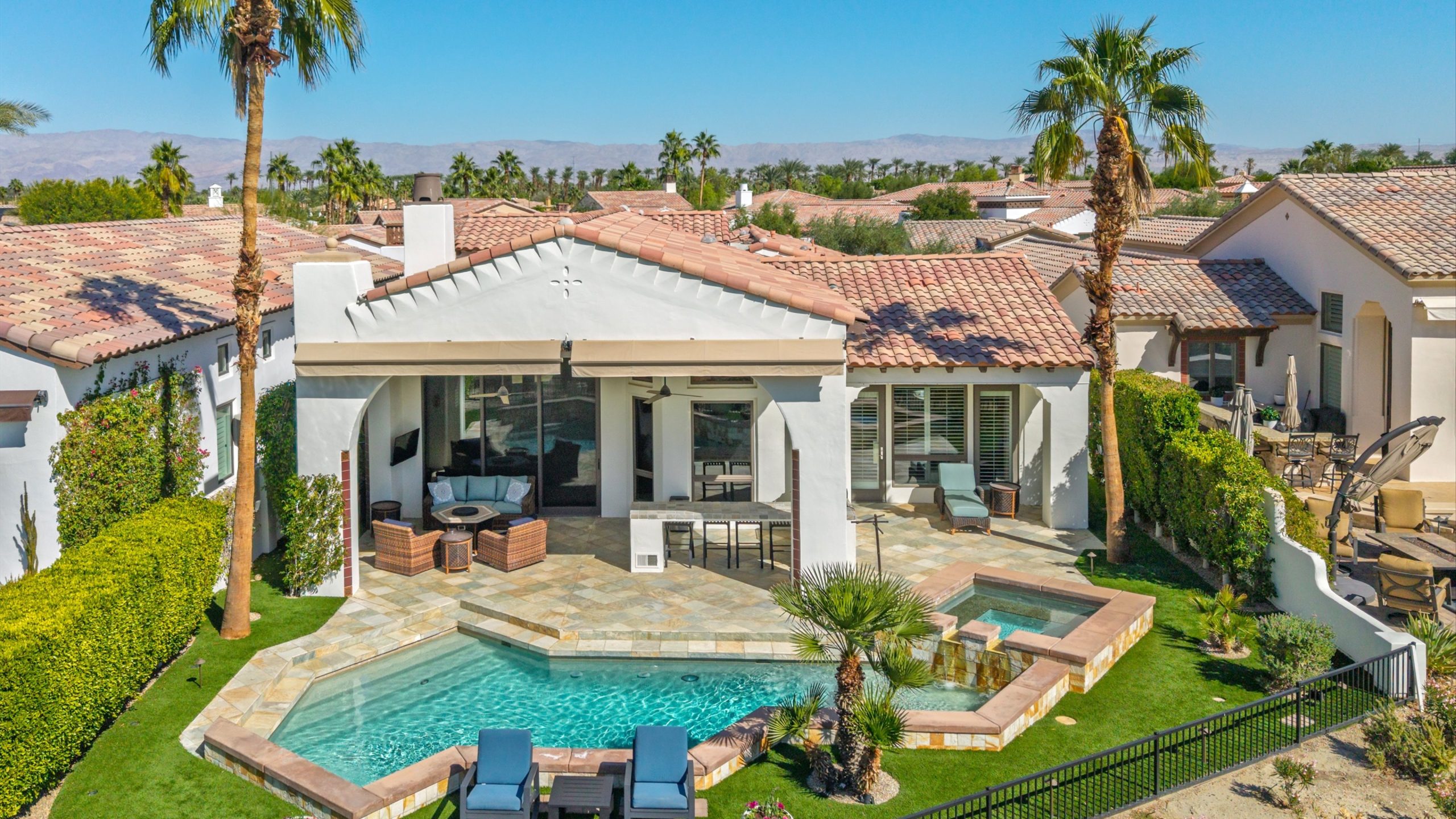 Framed by fairway, lake, and mountain vistas, this Andalusia at Coral Mountain retreat makes an unforgettable first impression. From the moment you enter the lush, landscaped courtyard to the instant you step into the backyard and take in commanding views of the 9th fairway, a serene lake, and the Santa Rosa Mountains, the home delivers pure breathtaking satisfaction. Inside, clean architectural lines and designer finishes set a contemporary tone. The re-imagined chef’s kitchen pairs style with performance, showcasing sleek cabinetry and premium Wolf, Asko, and Sub-Zero appliances. A sumptuous primary retreat features bamboo flooring, a custom closet system, a rain-glass shower, a spa tub, and a soothing river-stone floor. Thoughtful details are everywhere with plantation shutters, bamboo and slate flooring, LED lighting, refined Kallista fixtures, and a Definitive Technology sound system. Outdoor living is equally impressive with a pool and spa, built-in BBQ with two-burner cooktop, Kool Fog misting system, motorized retractable awnings, a slate-tile pool deck, and a cozy fire pit. It’s an ideal setting for effortless everyday living and unforgettable entertaining. With timeless design, quality updates, and postcard-worthy sunsets, this home offers a rare blend of sophistication and comfort. Come live the life you’ve always imagined!