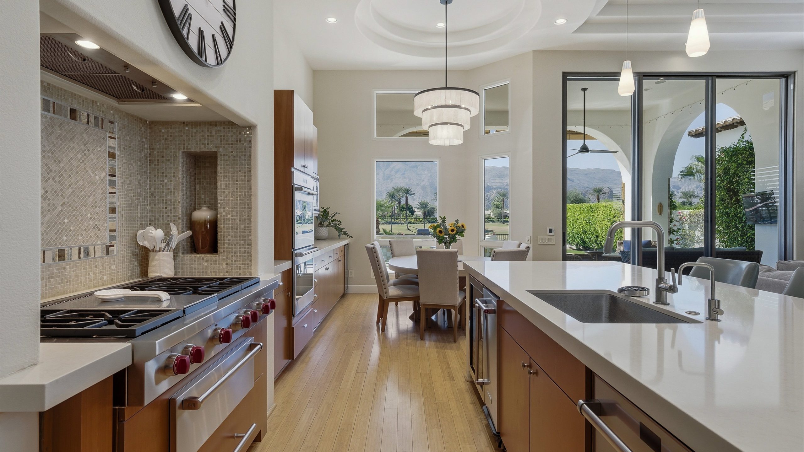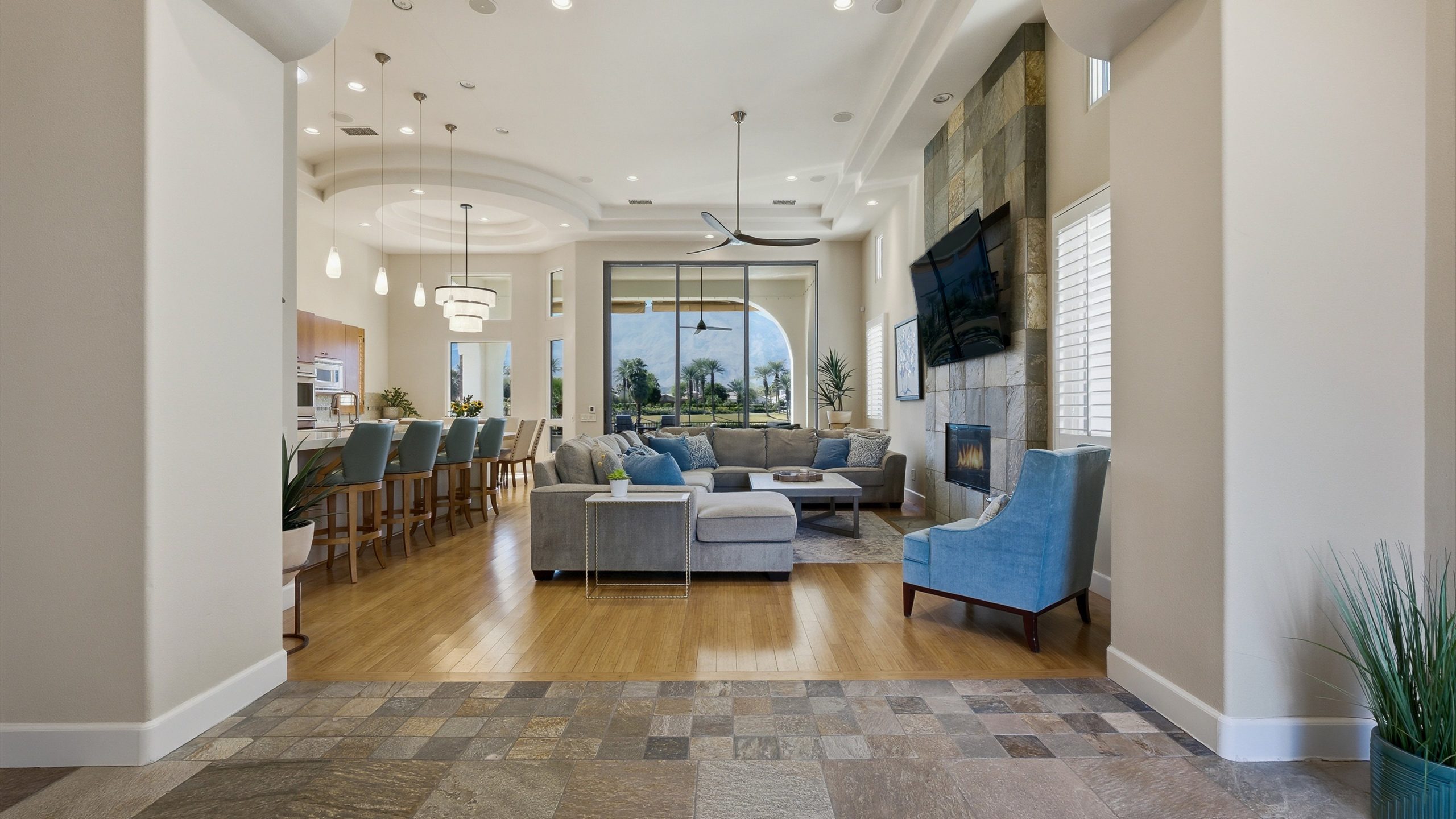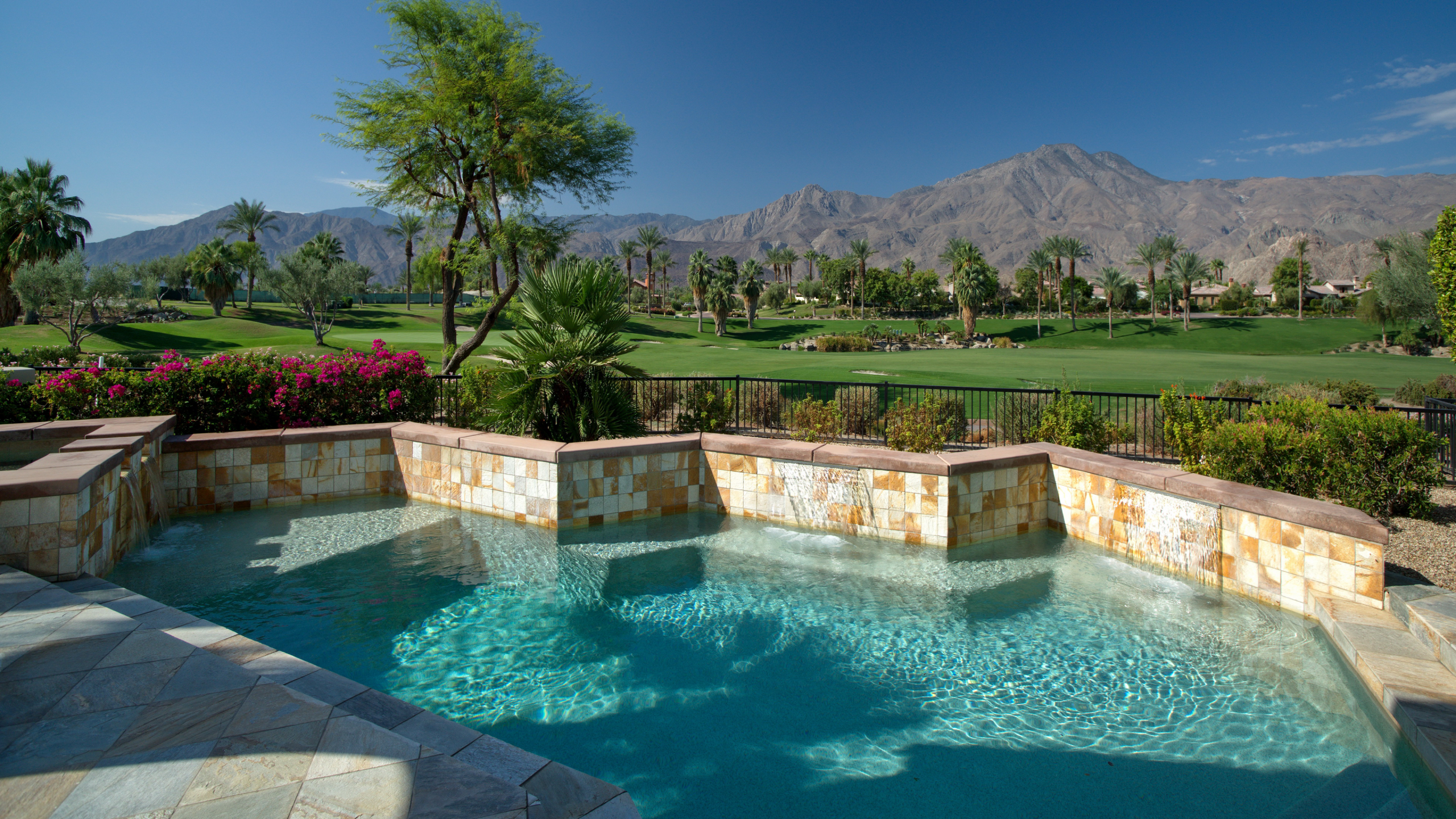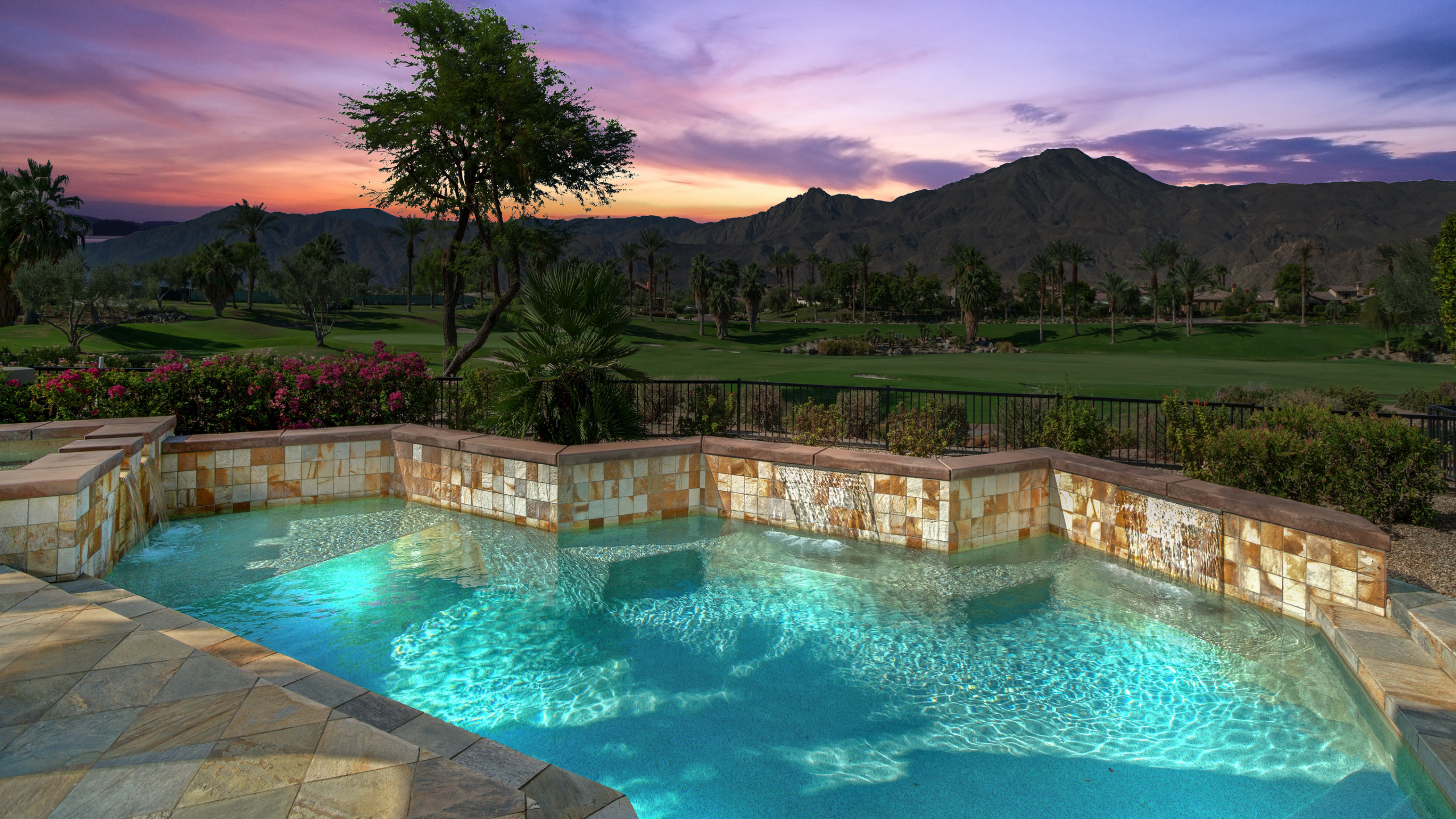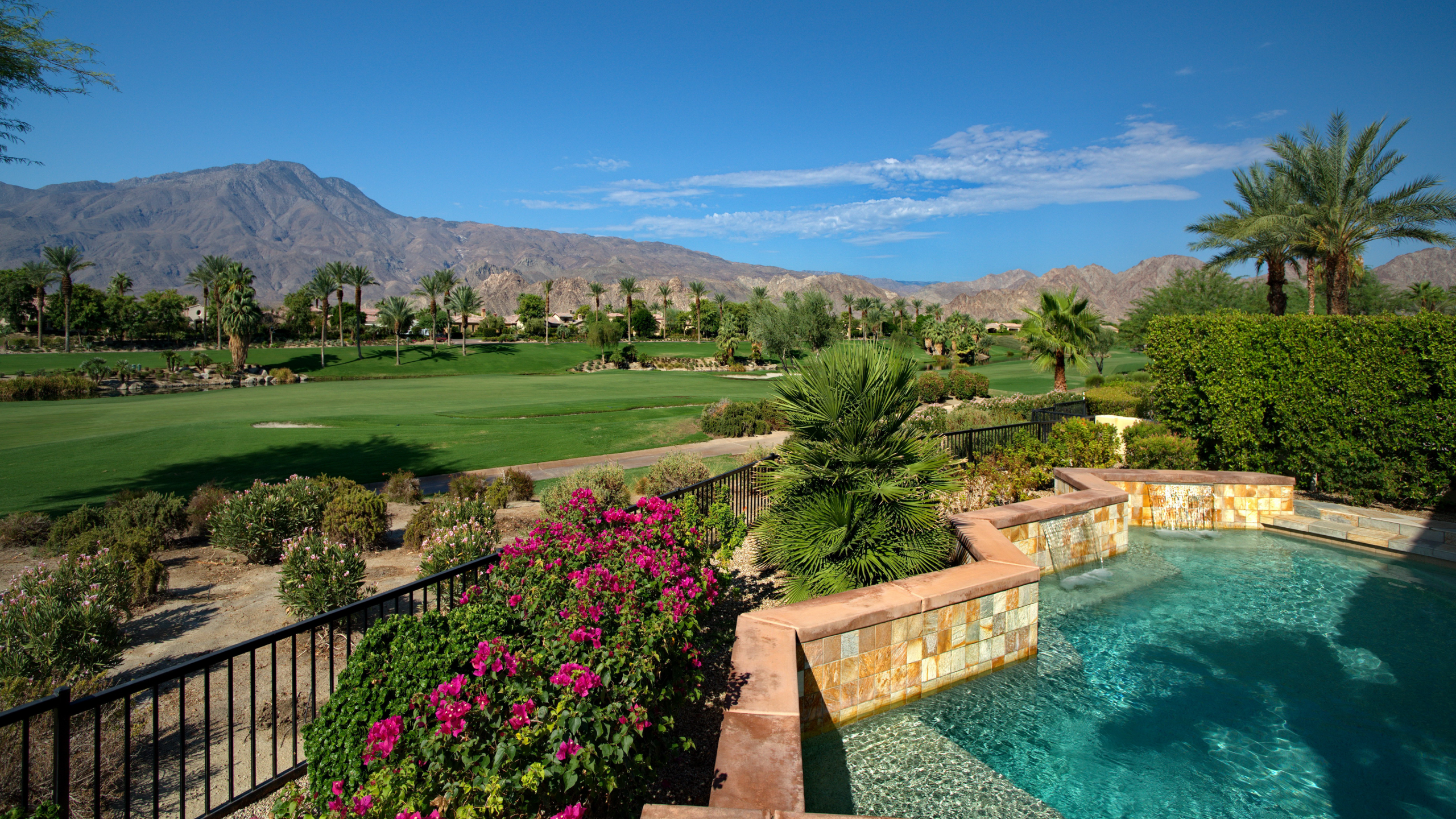 Framed by fairway, lake, and mountain vistas, this Andalusia at Coral Mountain retreat makes an unforgettable first impression. From the moment you enter the lush, landscaped courtyard to the instant you step into the backyard and take in commanding views of the 9th fairway, a serene lake, and the Santa Rosa Mountains, the home delivers pure breathtaking satisfaction. Inside, clean architectural lines and designer finishes set a contemporary tone. The re-imagined chef’s kitchen pairs style with performance, showcasing sleek cabinetry and premium Wolf, Asko, and Sub-Zero appliances. A sumptuous primary retreat features bamboo flooring, a custom closet system, a rain-glass shower, a spa tub, and a soothing river-stone floor. Thoughtful details are everywhere with plantation shutters, bamboo and slate flooring, LED lighting, refined Kallista fixtures, and a Definitive Technology sound system. Outdoor living is equally impressive with a pool and spa, built-in BBQ with two-burner cooktop, Kool Fog misting system, motorized retractable awnings, a slate-tile pool deck, and a cozy fire pit. It’s an ideal setting for effortless everyday living and unforgettable entertaining. With timeless design, quality updates, and postcard-worthy sunsets, this home offers a rare blend of sophistication and comfort. Come live the life you’ve always imagined!